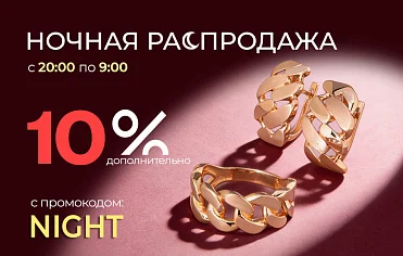 Только с 20.02 20:00 до 21.02 09:00 действует дополнительная скидка –10% по промокоду NIGHT на ювелирные украшения из актуального ассортимента.
