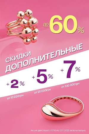 Каждый раз при покупке товаров в магазинах ювелирных украшений обеспечена скидка 5%. Бонусы не начисляются на подарочные сертификаты и акционные позиции.