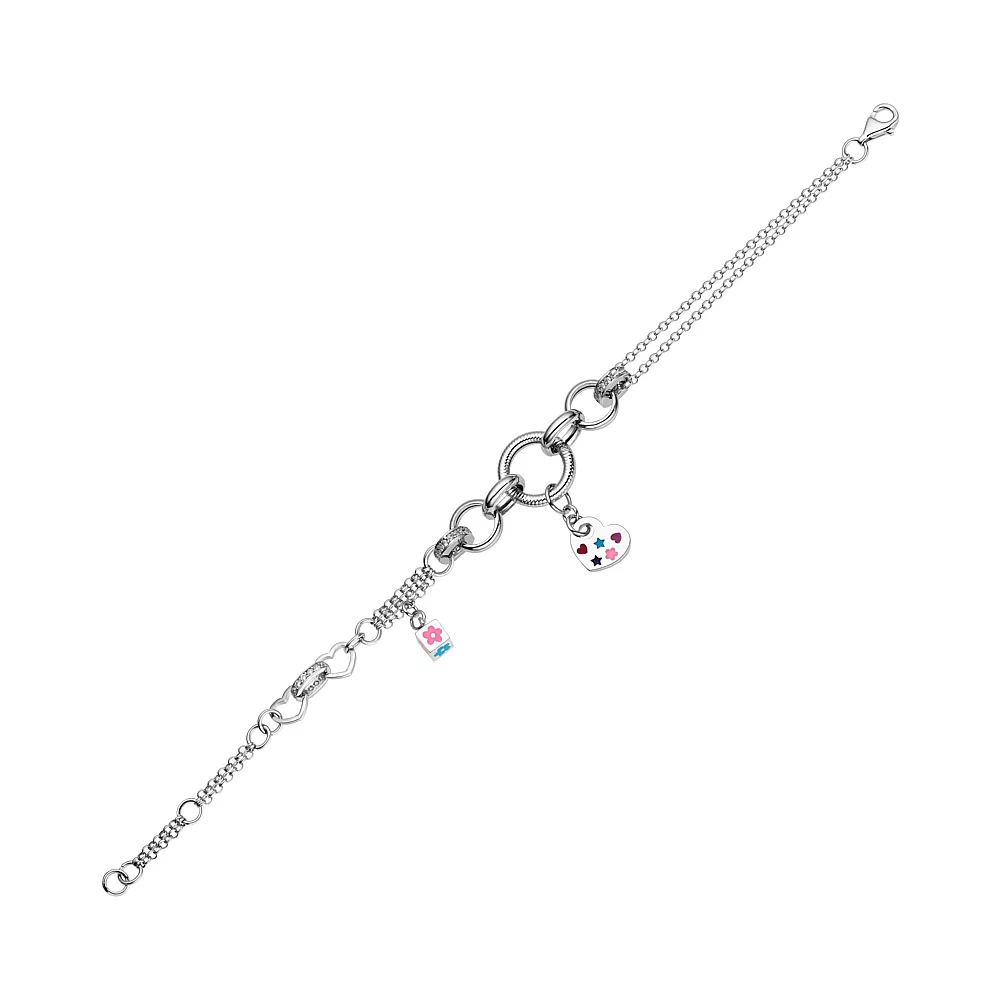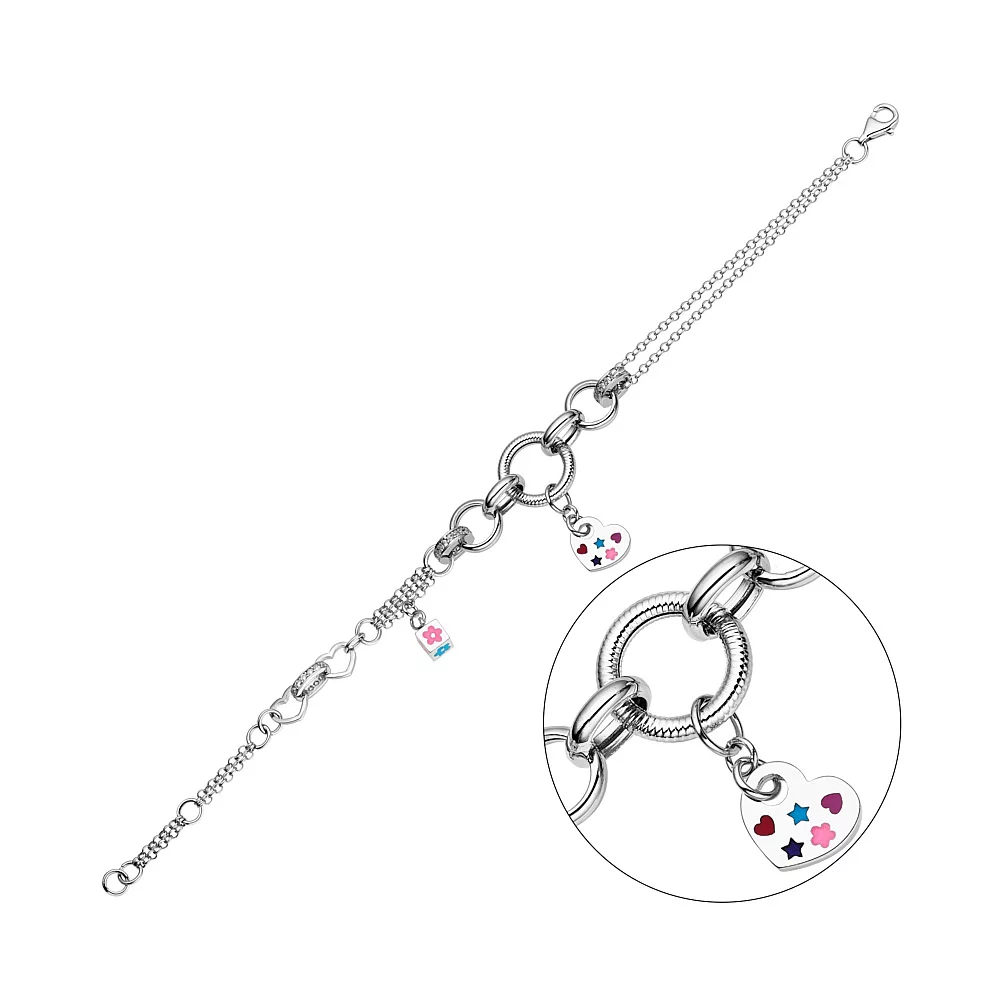 Браслет из белого золота с подвесками Сердце с фианитами и эмалью плетение Фантазия - 1516069