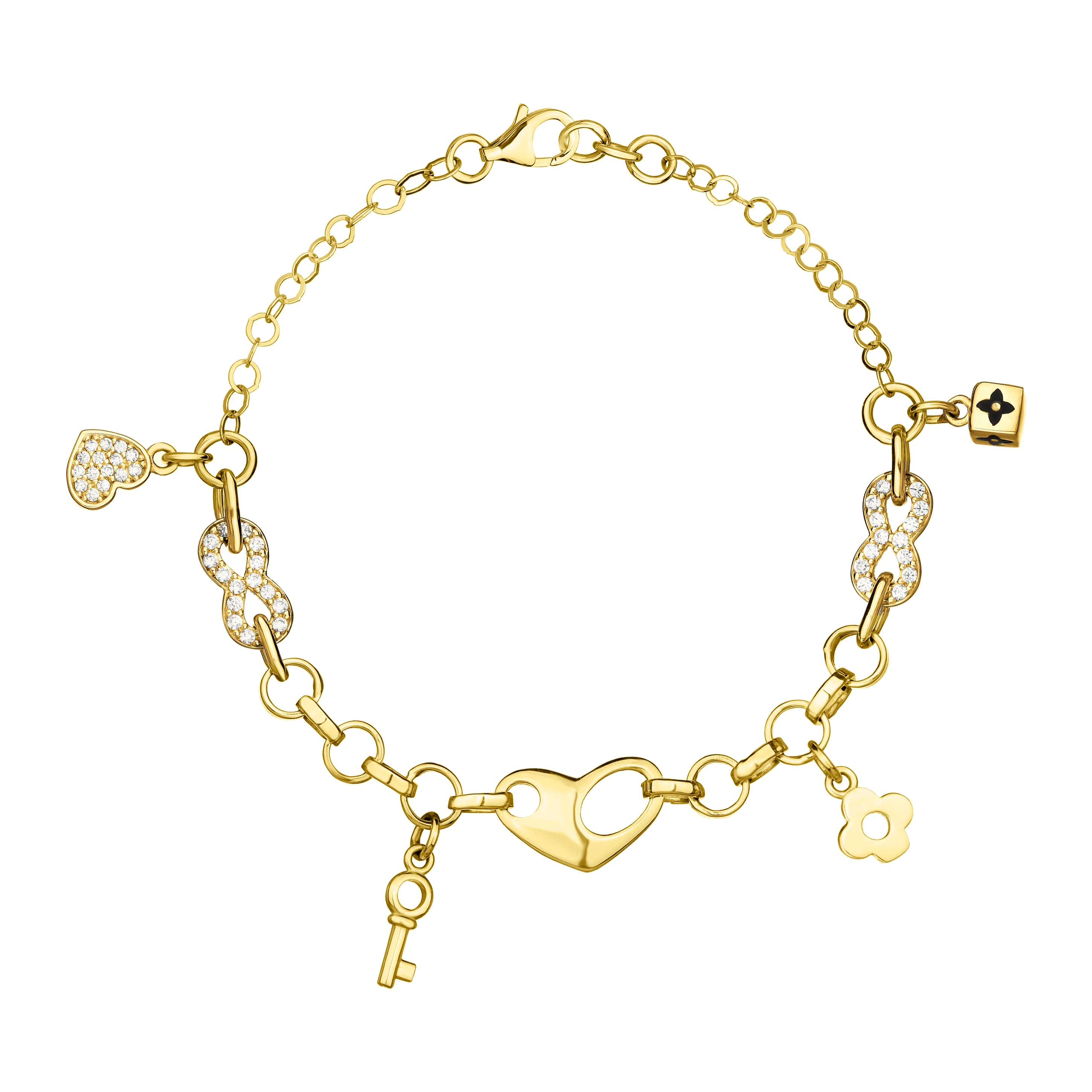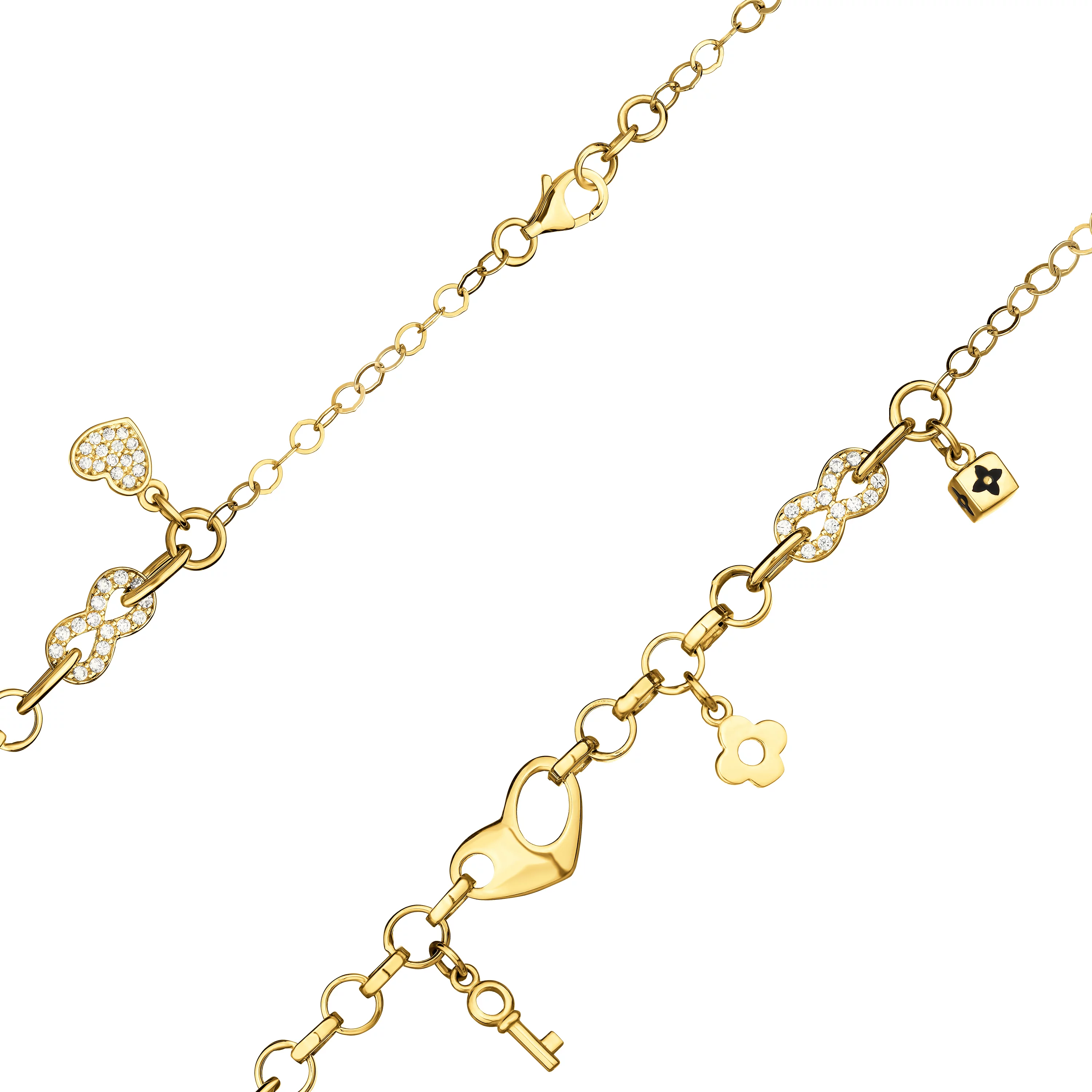 Браслет "Ключик" с подвесами и фианитами в комбинированном золоте с плетением якорь и шопард - 1920489