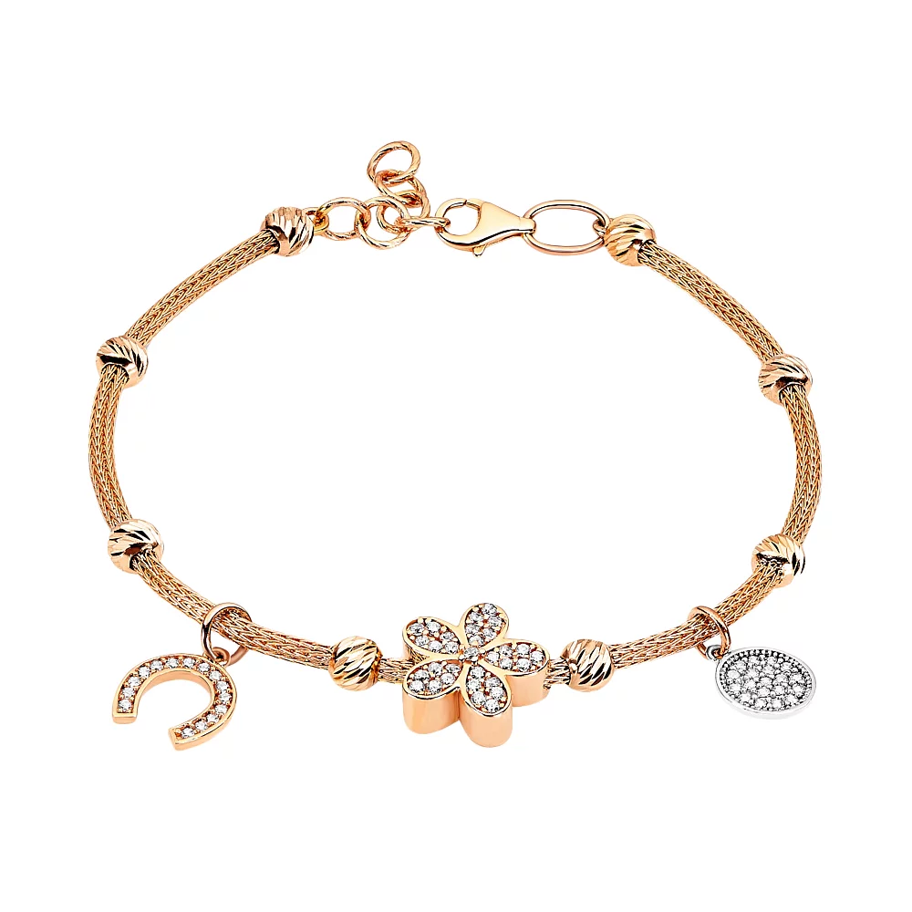 Браслет из комбинированного золота с фианитом и подвесами плетение снейк - 970666