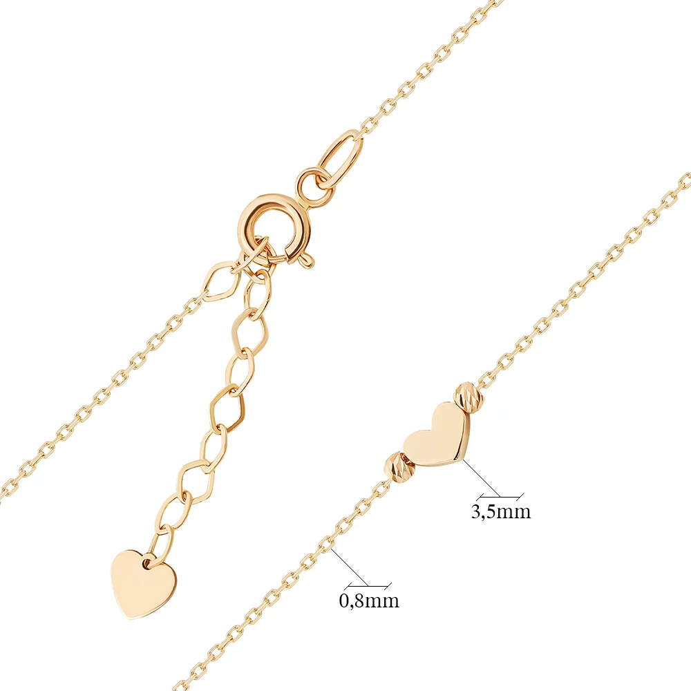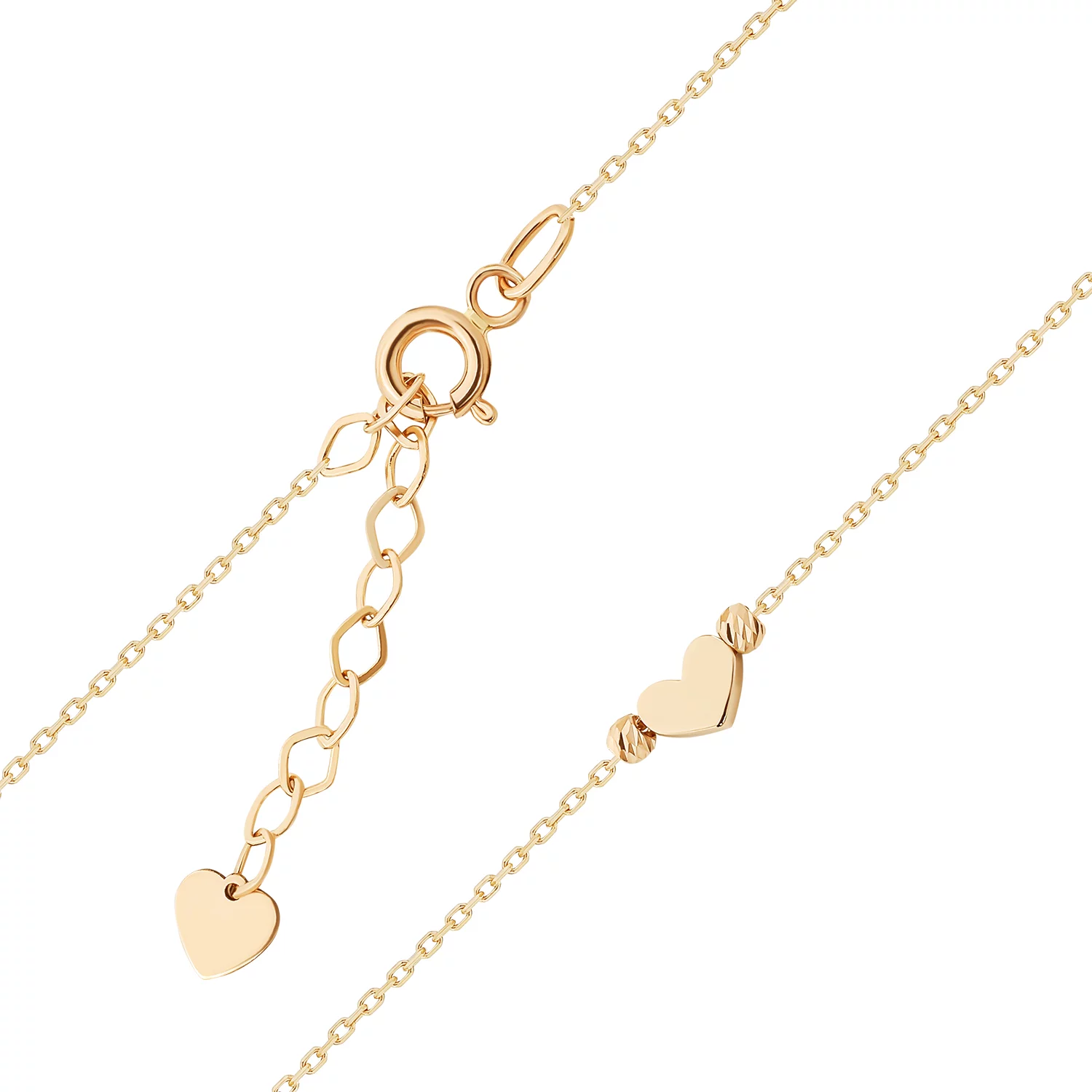 Браслет из красного золота «Сердечко» — деликатное украшение на ногу, добавляющее образу игривость и кокетливость. Оформлено ювелирное изделие в романтическом стиле и лучше всего сочетается с летящими платьями, юбками, сарафанами и укороченными брюками. Тонкая цепочка в классическом якорном плетении декорирована шарами, а в центральной части изделия размещено главное украшение — изящное сердце. Изготовлен анклет из драгоценного металла 585 пробы с добавлением меди в состав лигатуры сплава, придающей ему красный оттенок. Застежкой служит круглый шпрингельный замок.