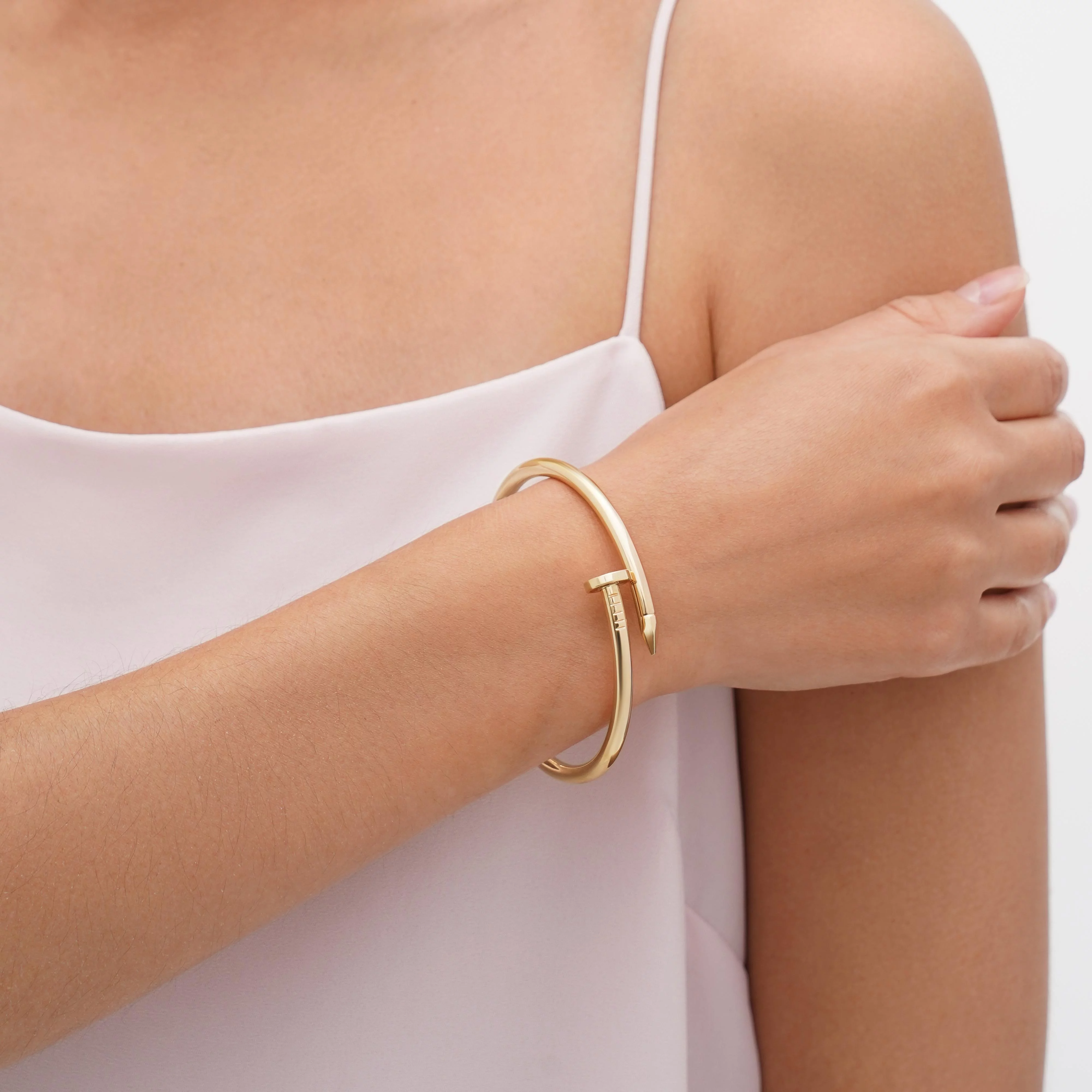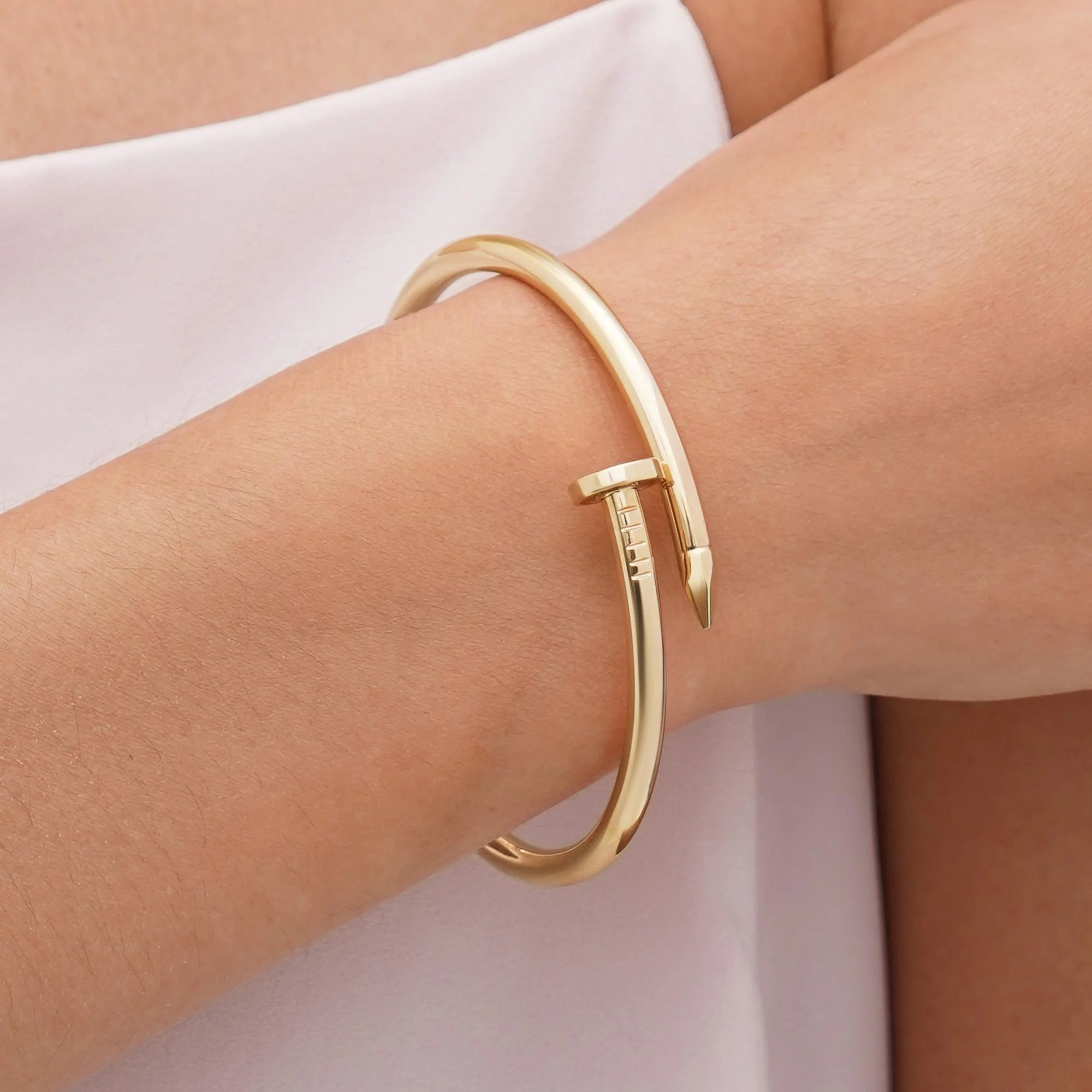 Золотой браслет 585 пробы выполнен в форме гвоздя. Он элегантно облегает нежную женскую руку, дополняя повседневный наряд и вечерний образ шармом. Минималистичный дизайн позволяет комбинировать изделие с платьем из легкой ткани или со строгим деловым костюмом. Драгоценность символизирует смелость и свободу. Теплый оттенок благородного металла олицетворяет страсть и утонченность. Порадуйте возлюбленную приятным и оригинальным подарком к Новому году, дню рождению или юбилею. Ювелирное изделие понравится поклонницам стилей fashion и Картье.