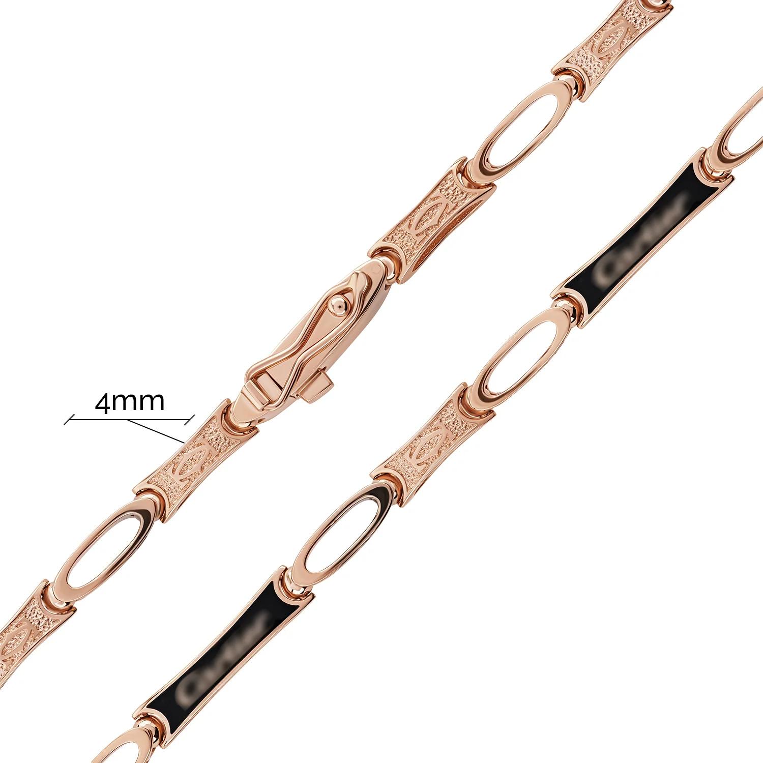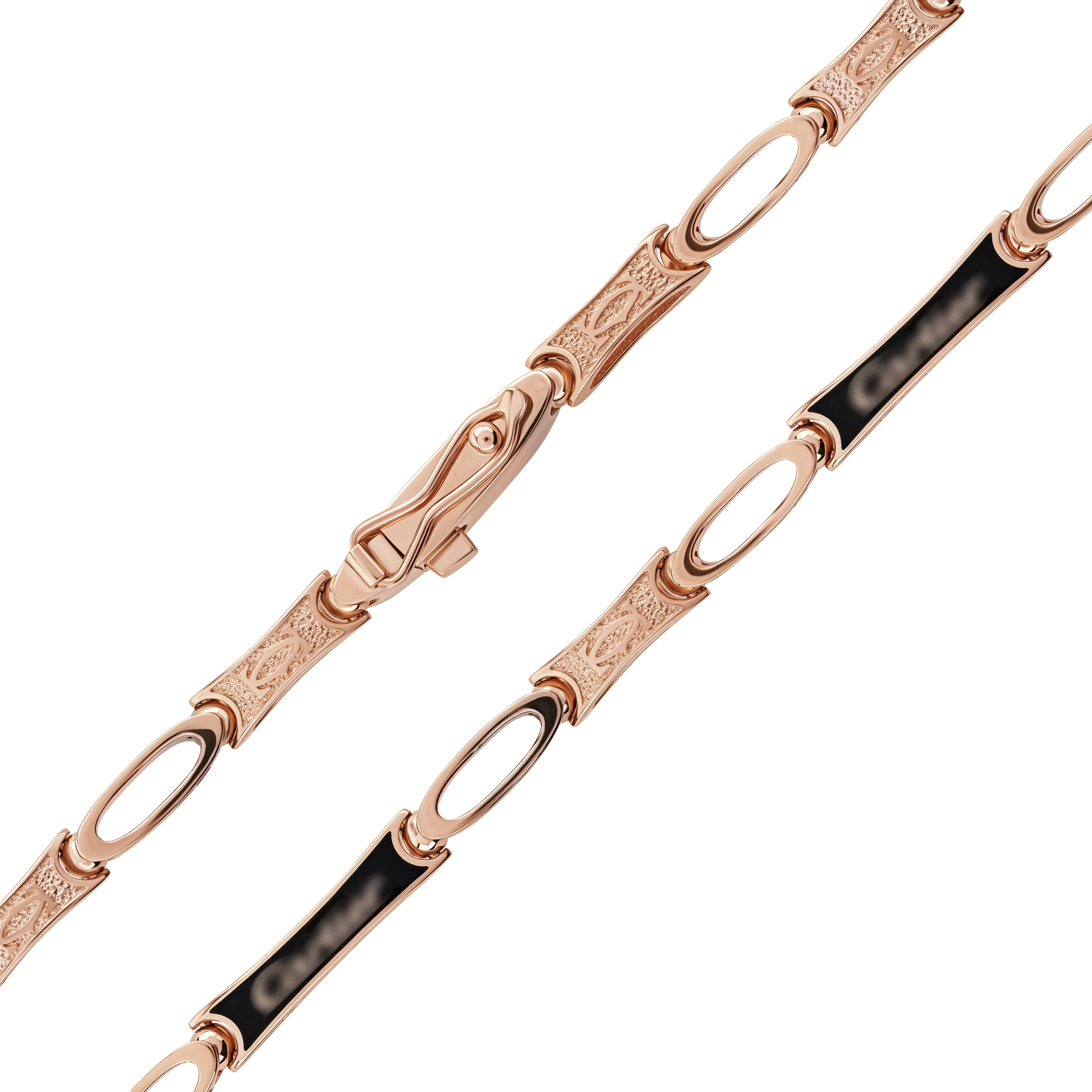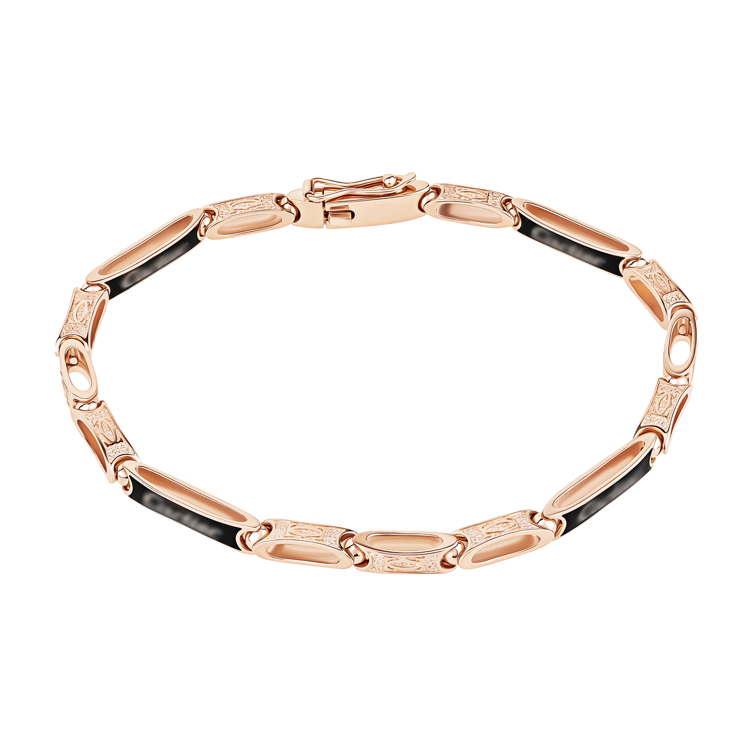 Изысканный, богато выглядящий браслет из красного золота 585 пробы. Он выполнен в необычной технике плетения — ролекс. Массивные объемные звенья овальной формы с полостью внутри соединены шарнирно через маленькие шарики, создавая эффект цельного гибкого полотна. Три элемента среднего размера с нанесенным по бокам узором чередуются с более крупным со вставкой из черной эмали и надписью Cartier. Замок необычной формы: на одном конце — петля с планкой, которая вставляется в другую часть изделия с пазом и выступом. Это коробчатый способ крепления, он считается самым надежным.