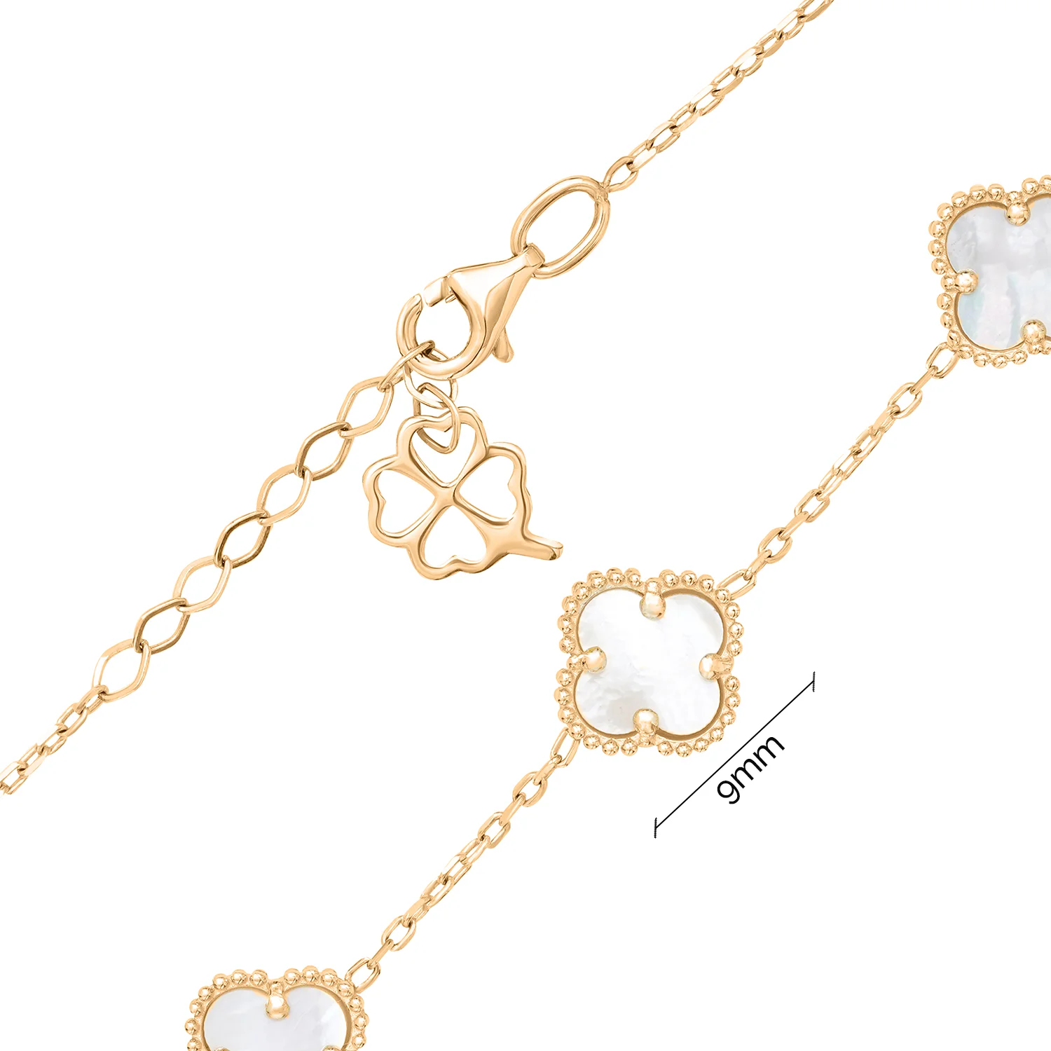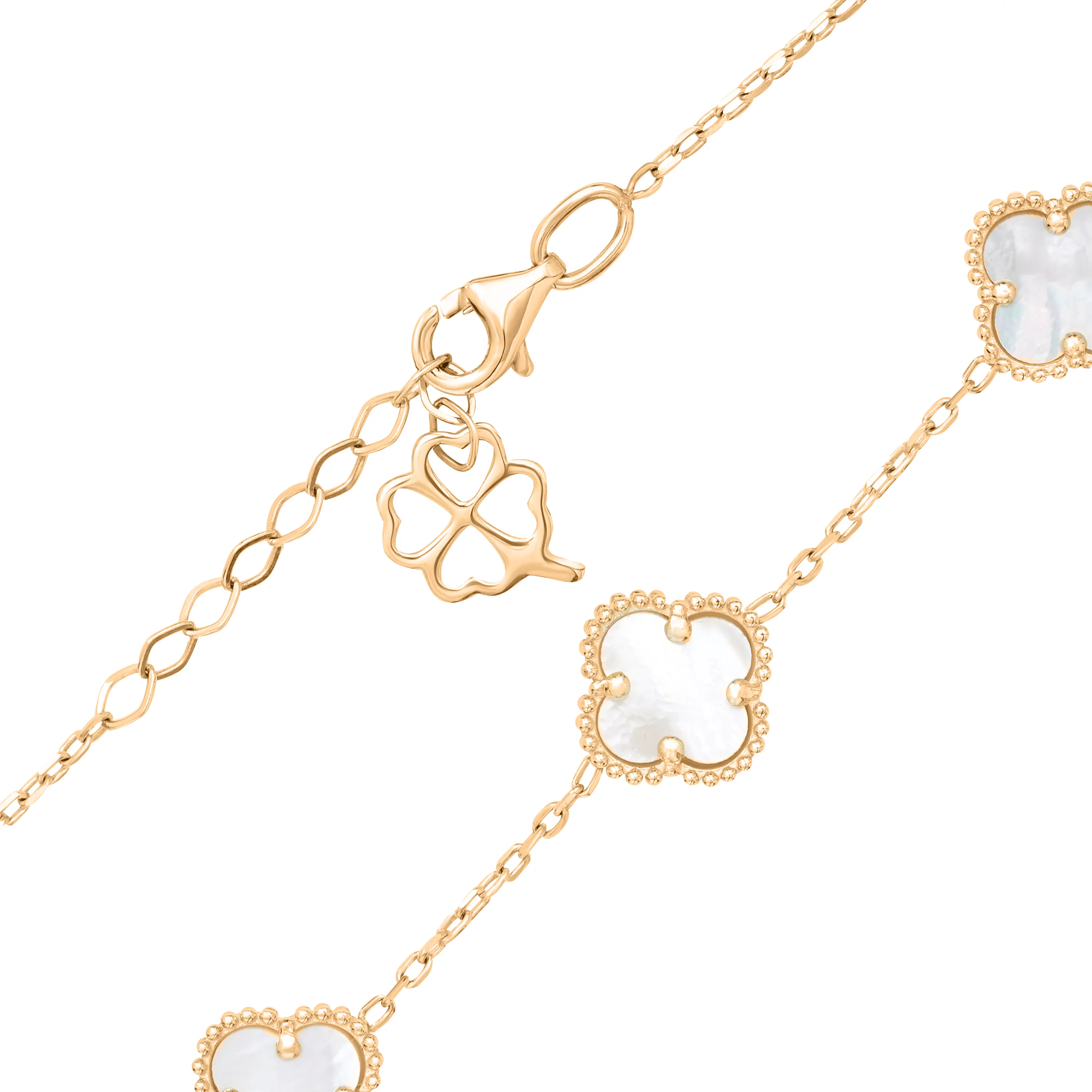 Браслет «Клевер» — изящное ювелирное украшение из красного золота 585 пробы. Медный оттенок металла выгодно подчеркивают перламутровые вставки в виде элементов декора. На тонкой цепочке расположено пять листочков клевера. Еще один без вставок украшает дополнительную подвеску. Она предназначена для регулирования размера — карабин застегивается в любое из звеньев. Структура перламутра привлекает глубоким холодным сиянием. Благодаря элегантному дизайну такой браслет можно сочетать с разными стилями в одежде: повседневным, деловым, праздничным и другими.