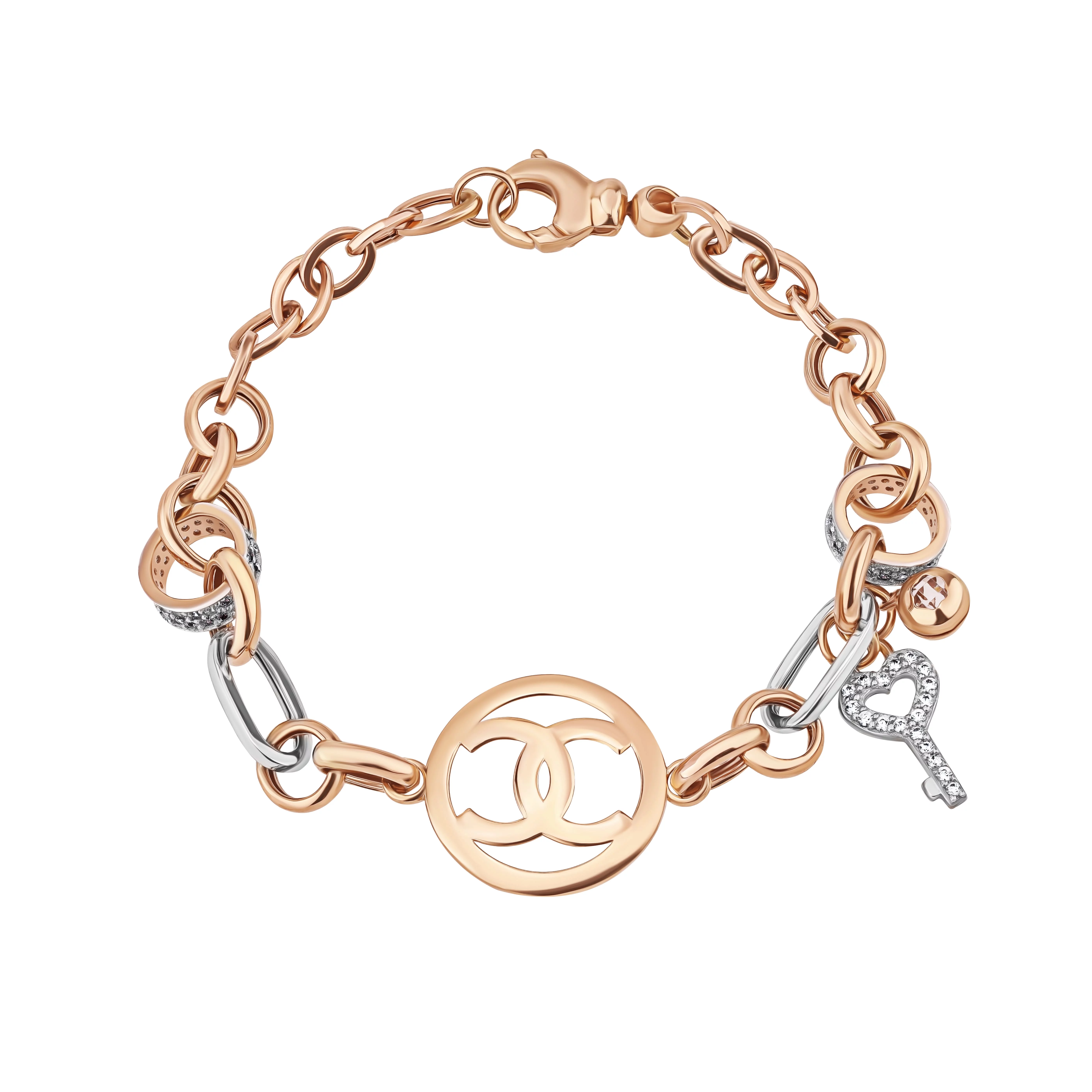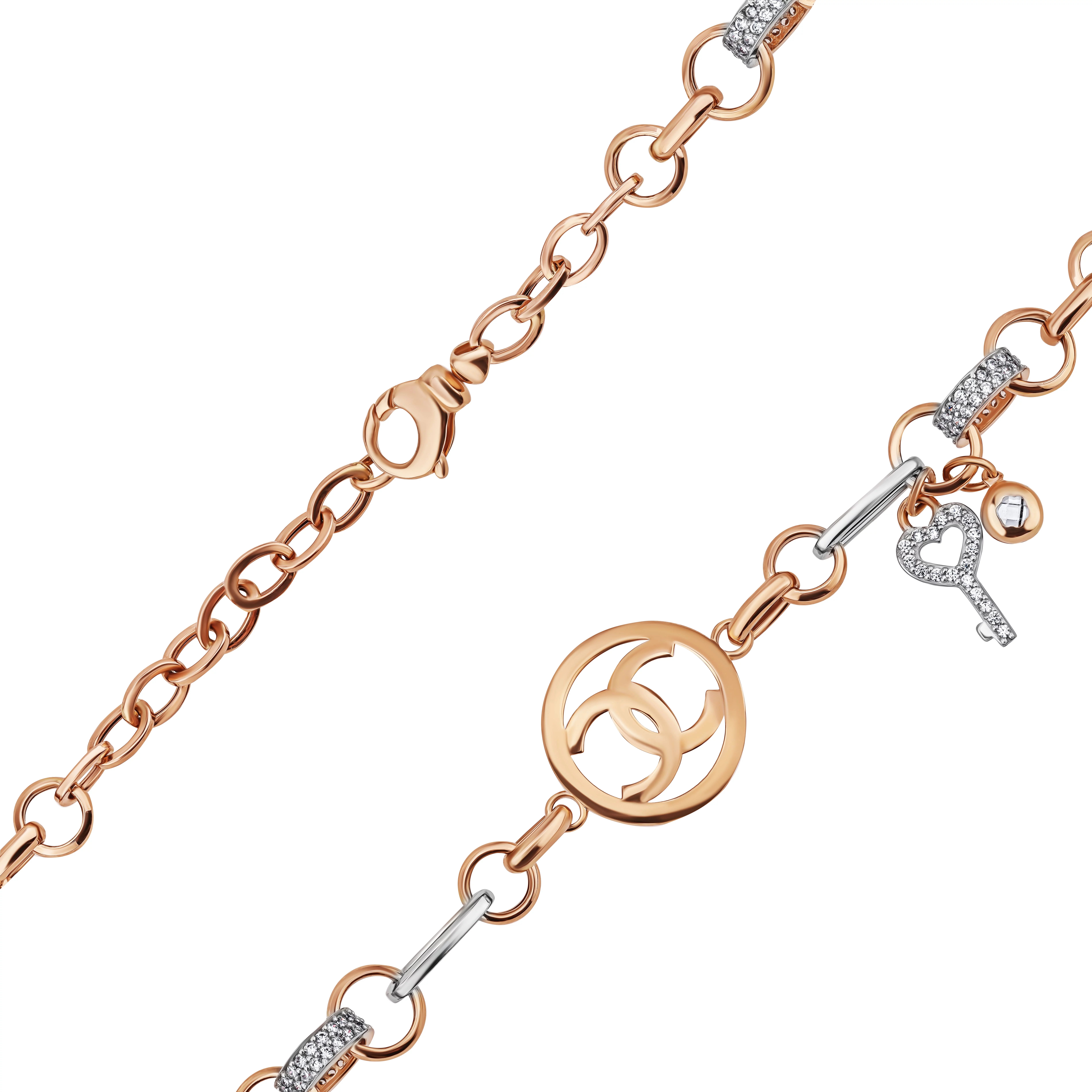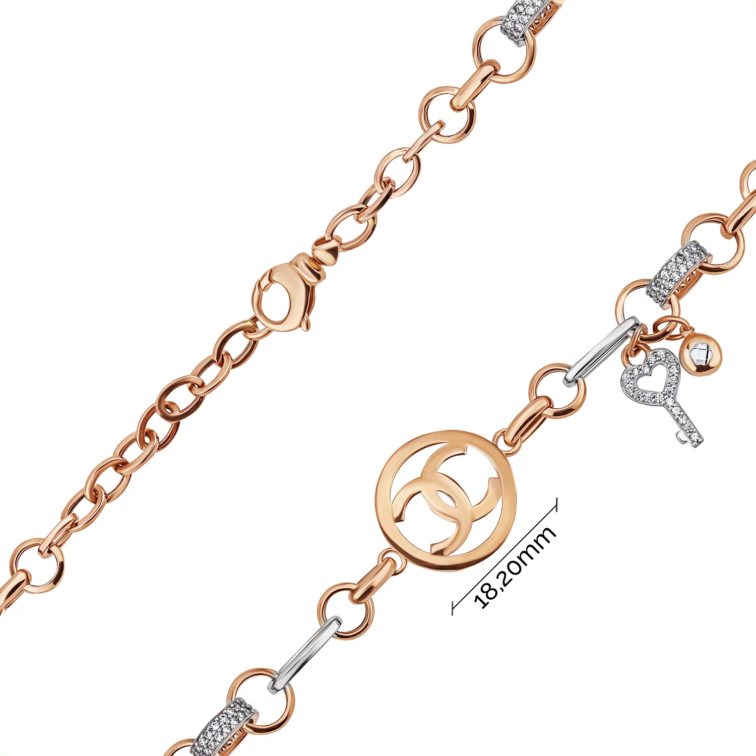Браслет из красного золота "Ключик" с россыпью фианитов и плетением якорь и шопард - 1858236