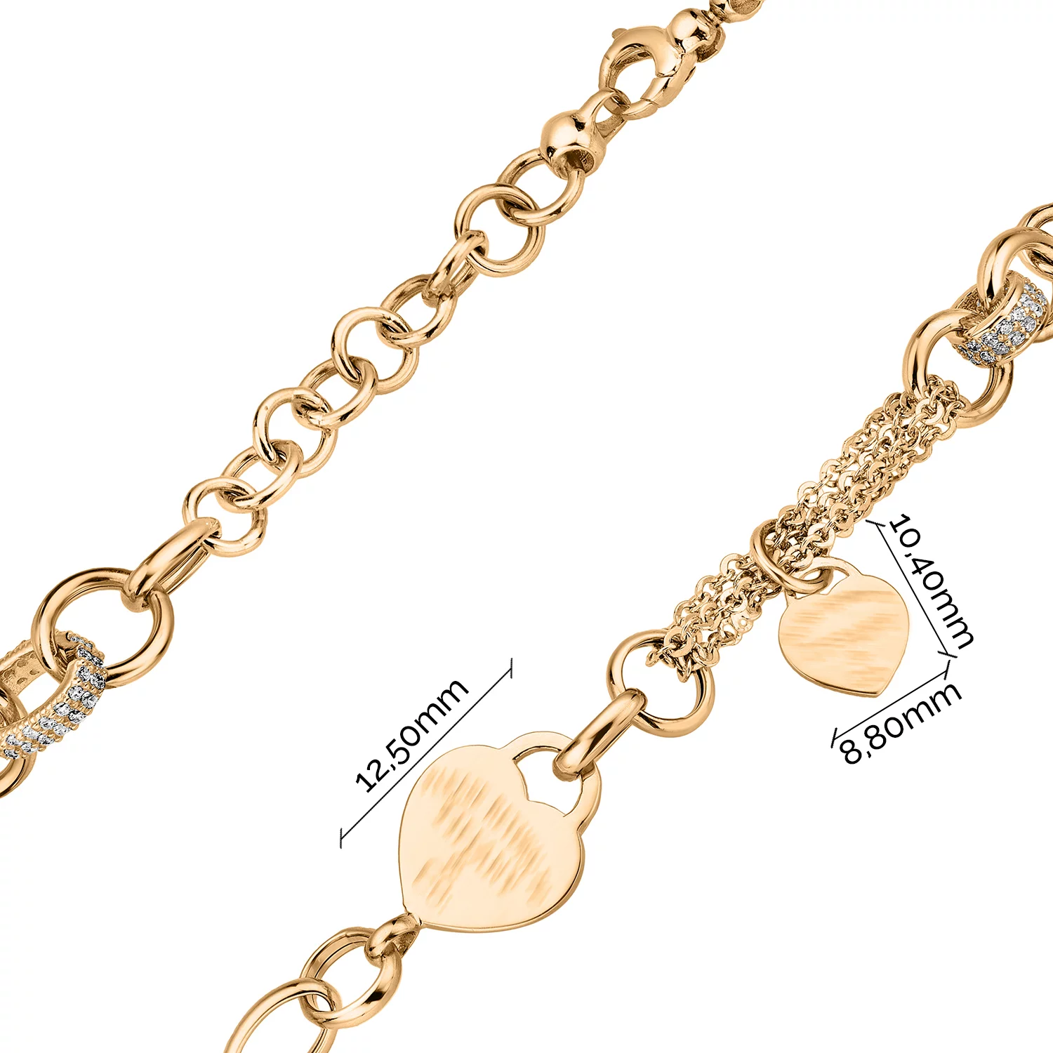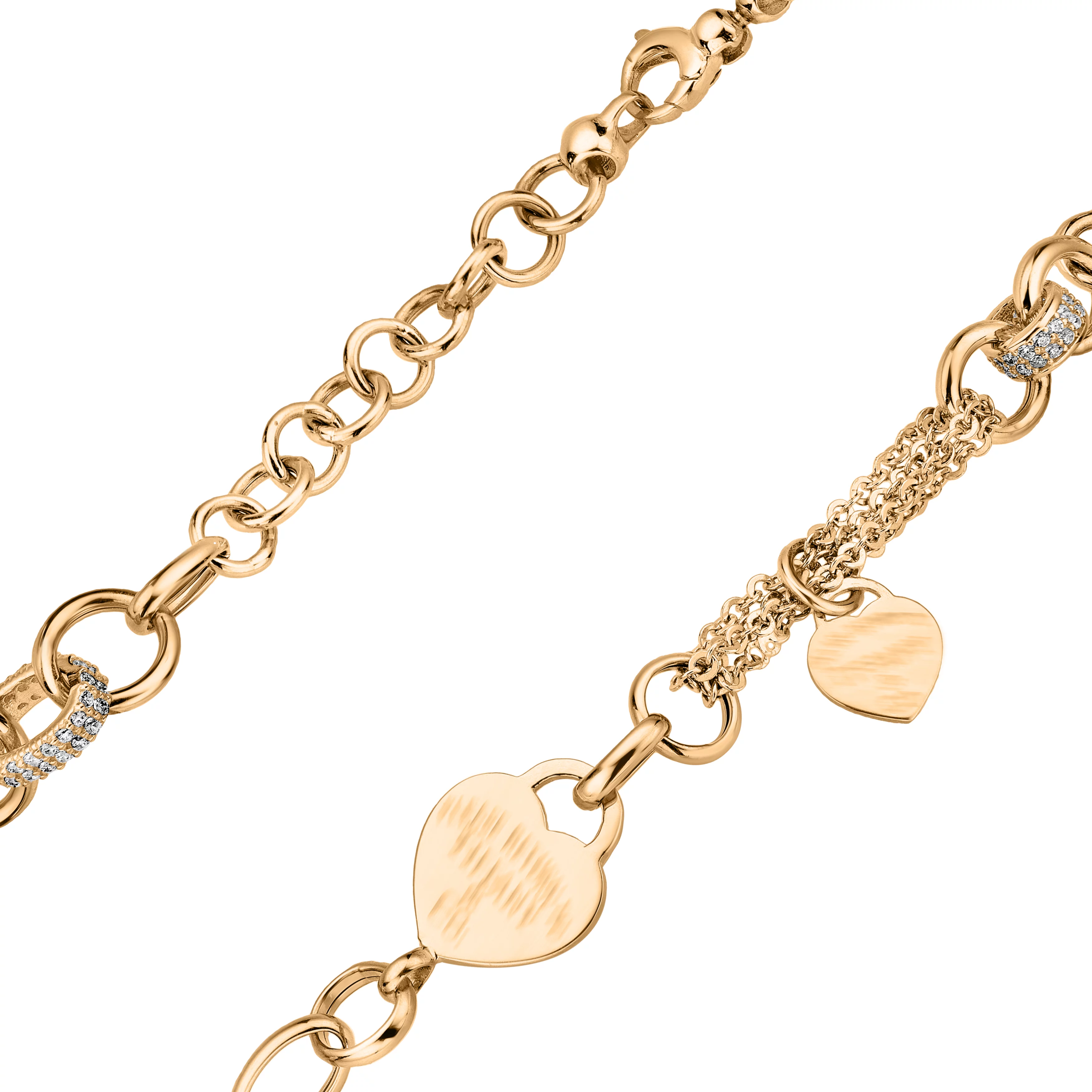 Браслет из комбинированного золота с подвесами "Сердце" и фианитами плетение якорь и шопард - 1698631