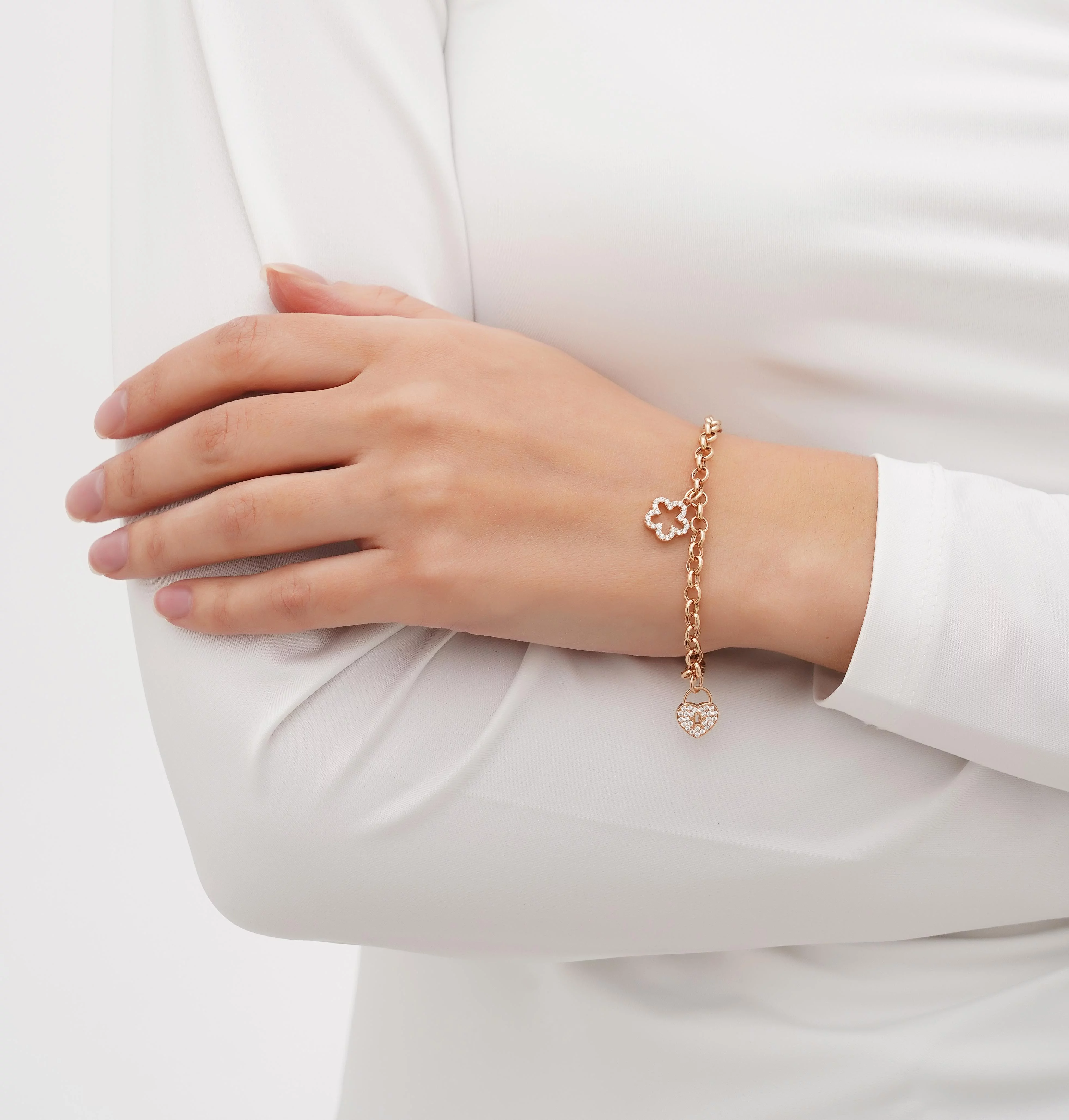 Браслет из комбинированного золота с подвесами "Сердце" и фианитами плетение якорь и шопард - 1698631
