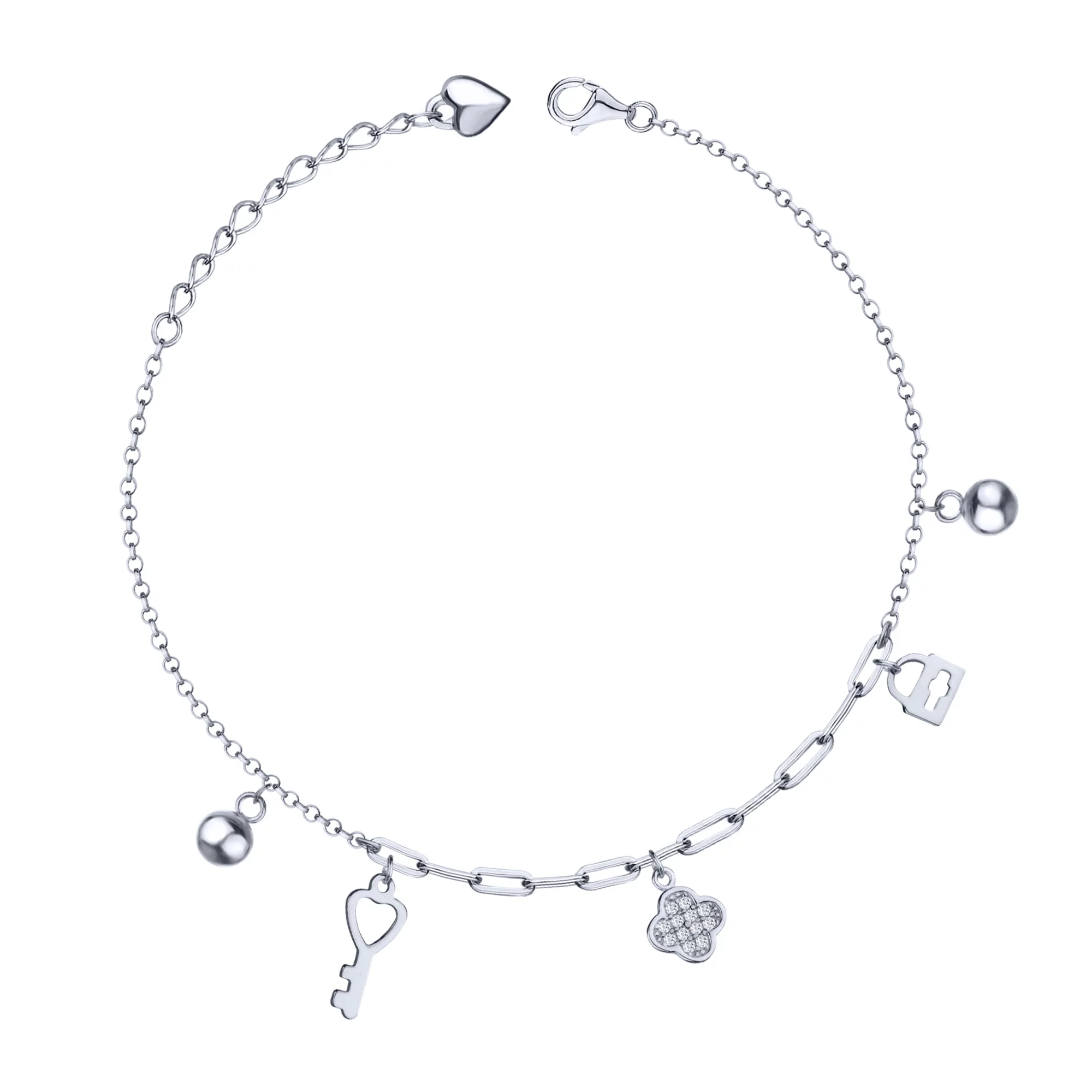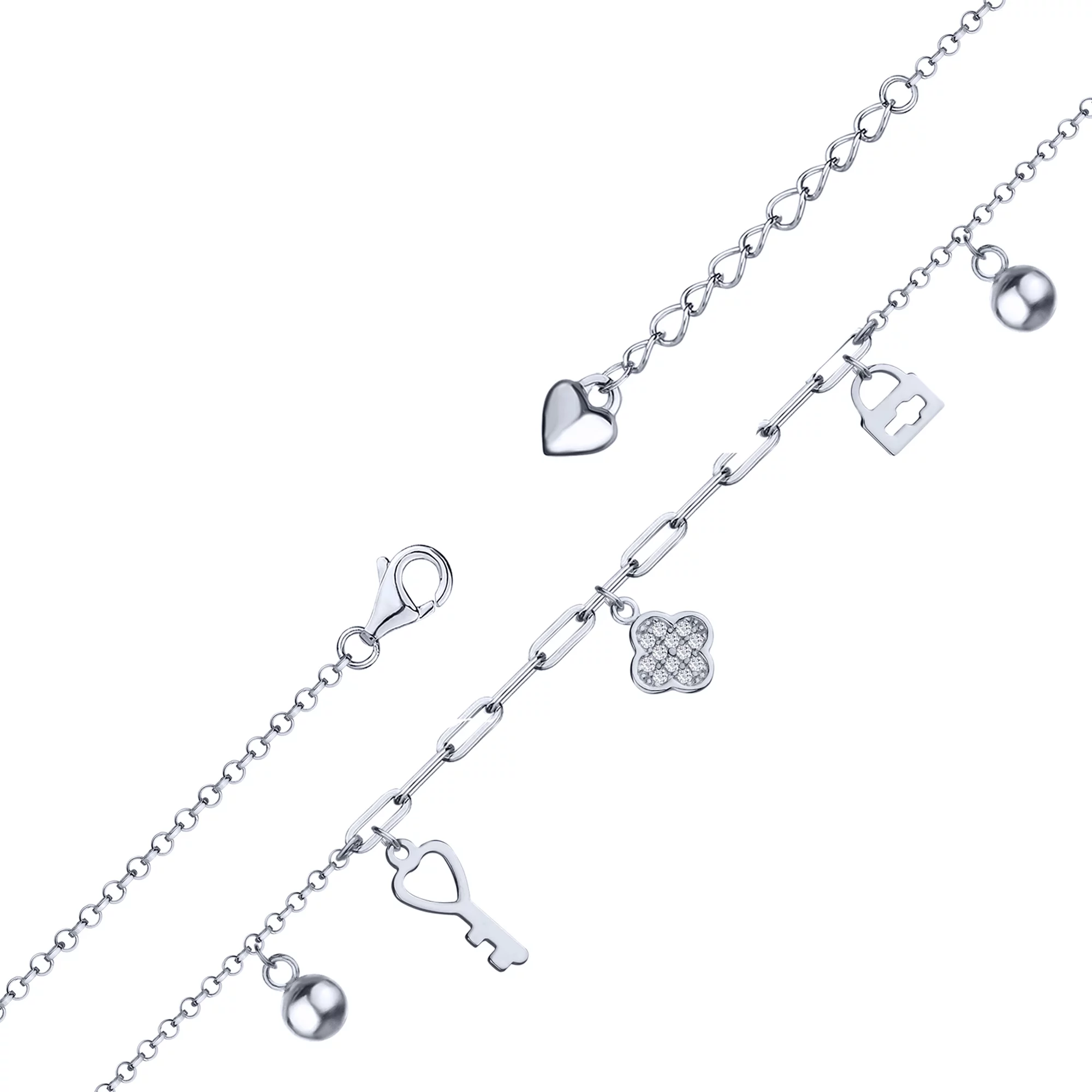 Браслет "Ключик" с подвесами и фианитами в комбинированном золоте с плетением якорь и шопард - 1920489