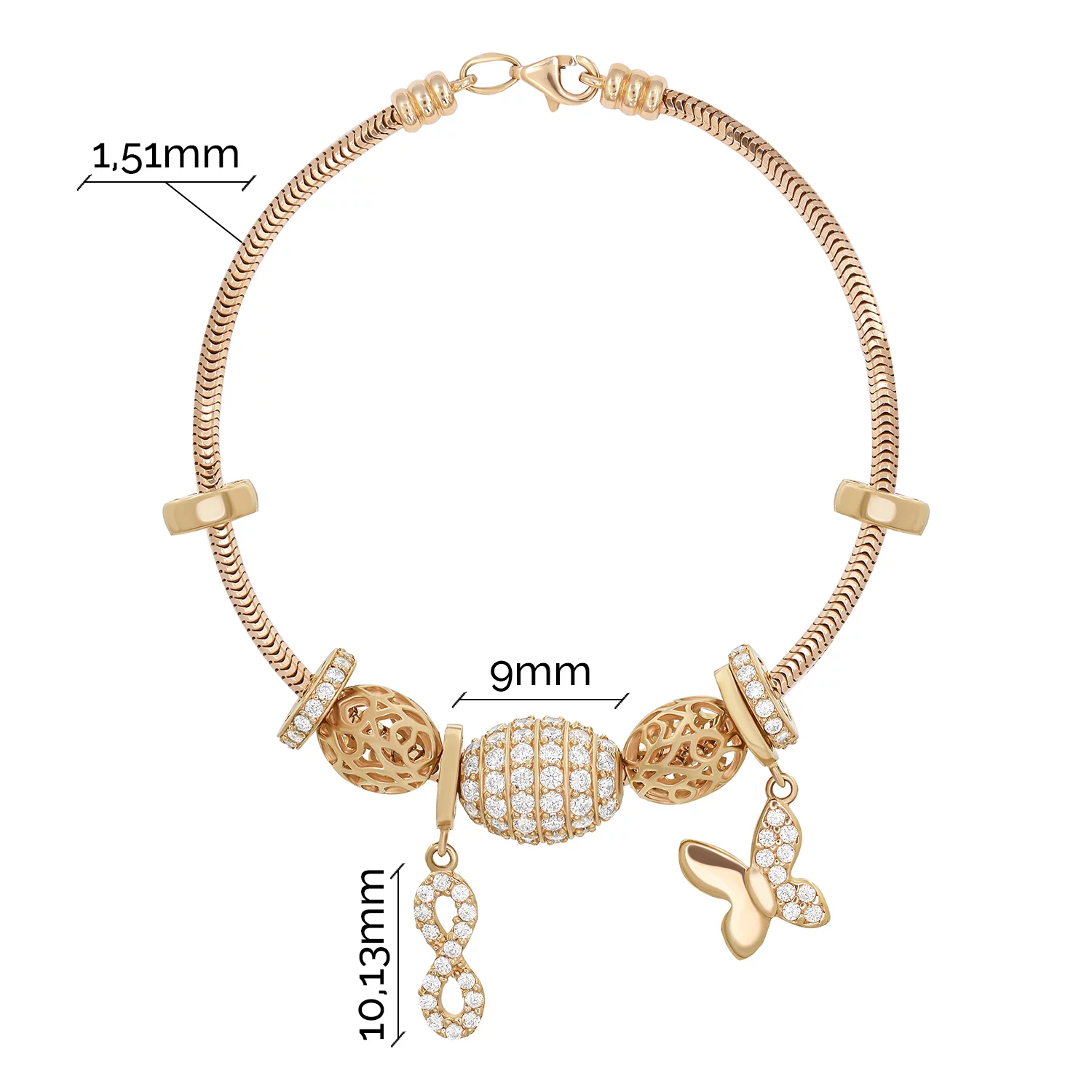 Браслет с шармами и фианитами из красного золота плетение снейк - 1737931