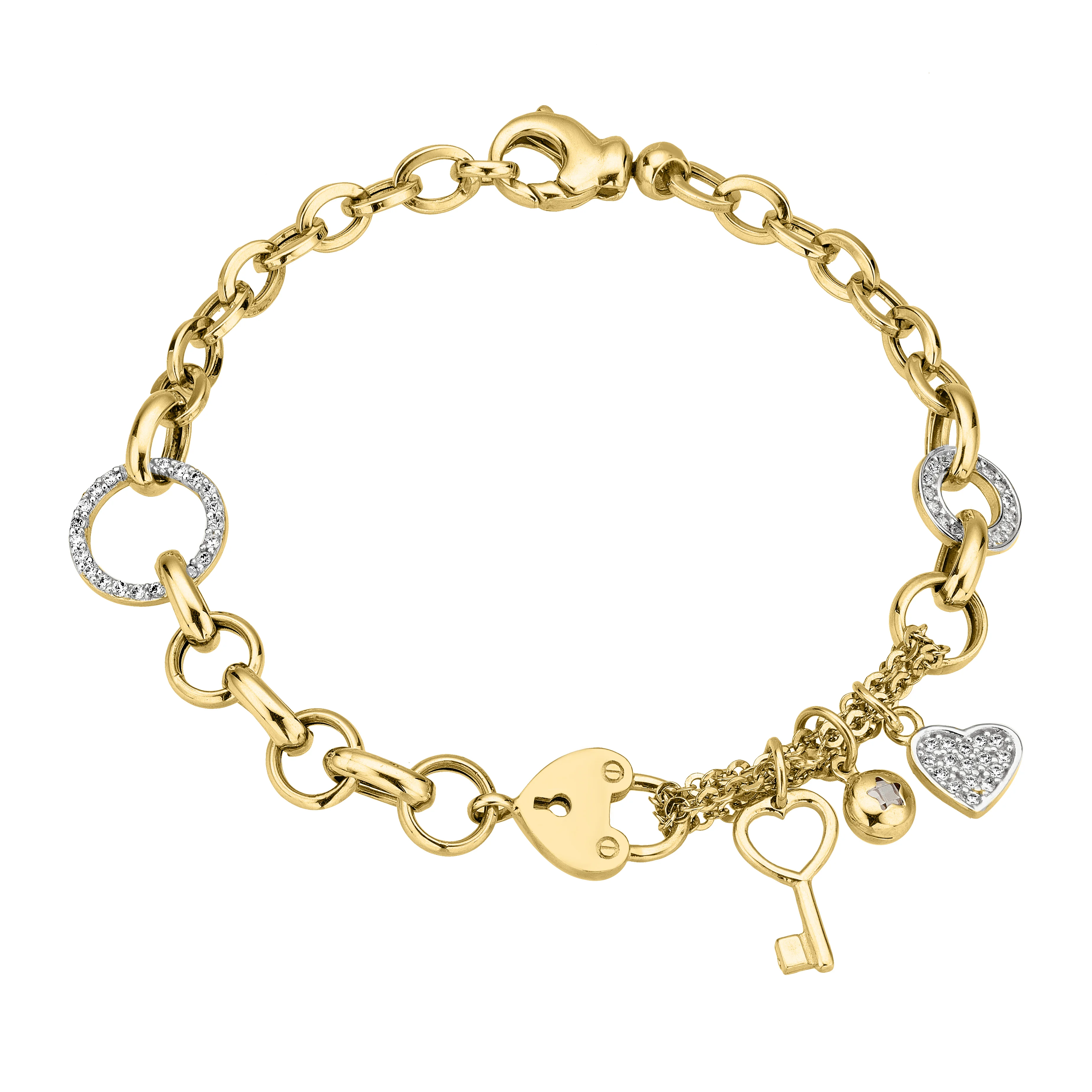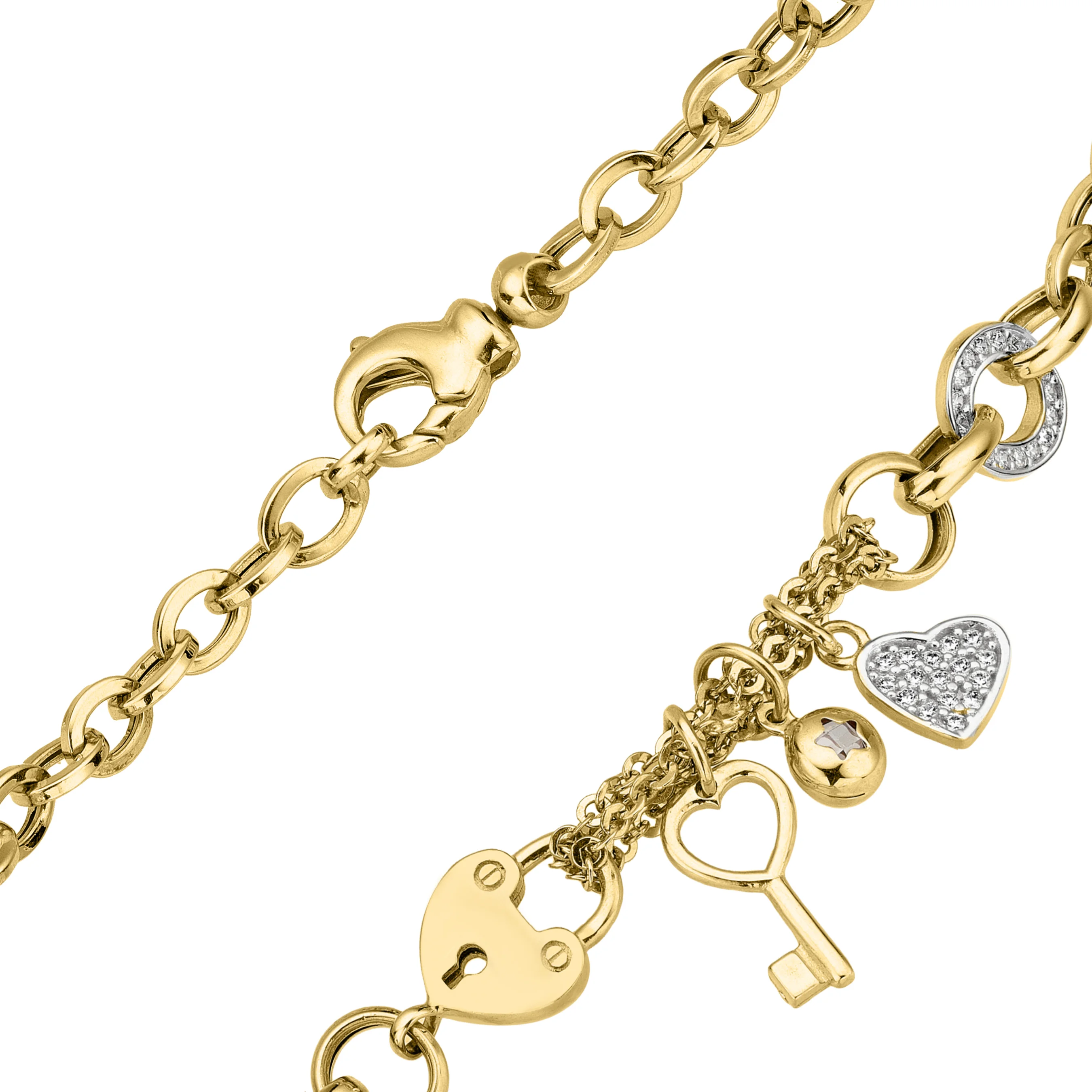 Браслет "Ключик" с подвесами и фианитами в комбинированном золоте с плетением якорь и шопард - 1920489