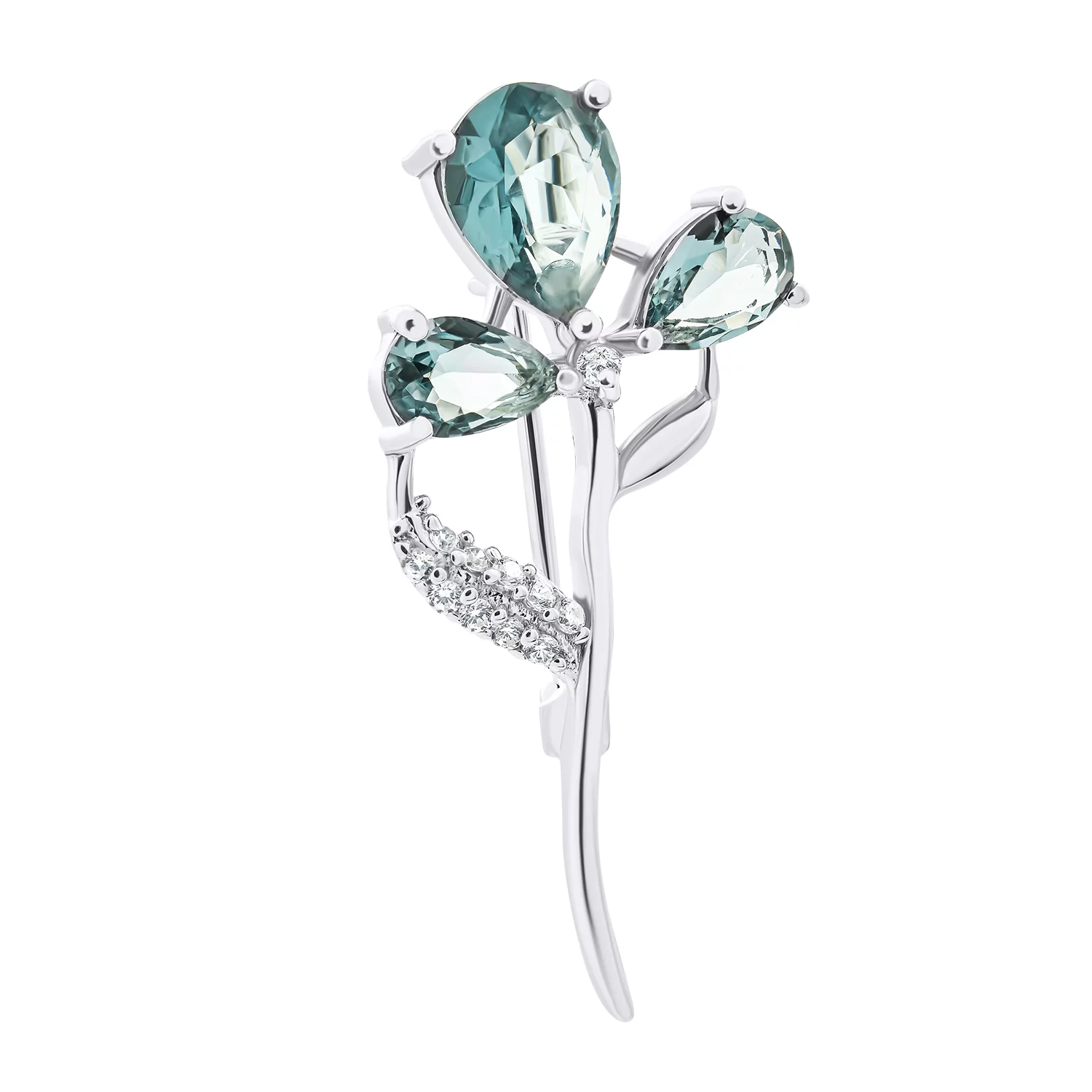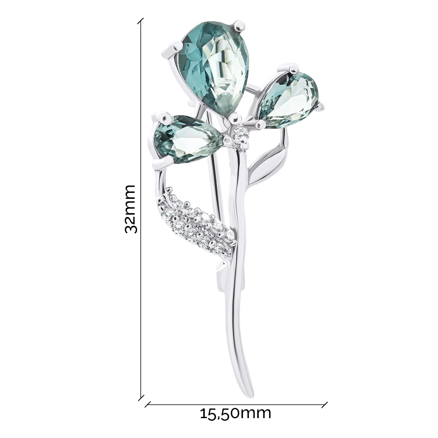 Брошка серебряная с родированием топазом лондон и фианитами "Цветочек" - 1525182