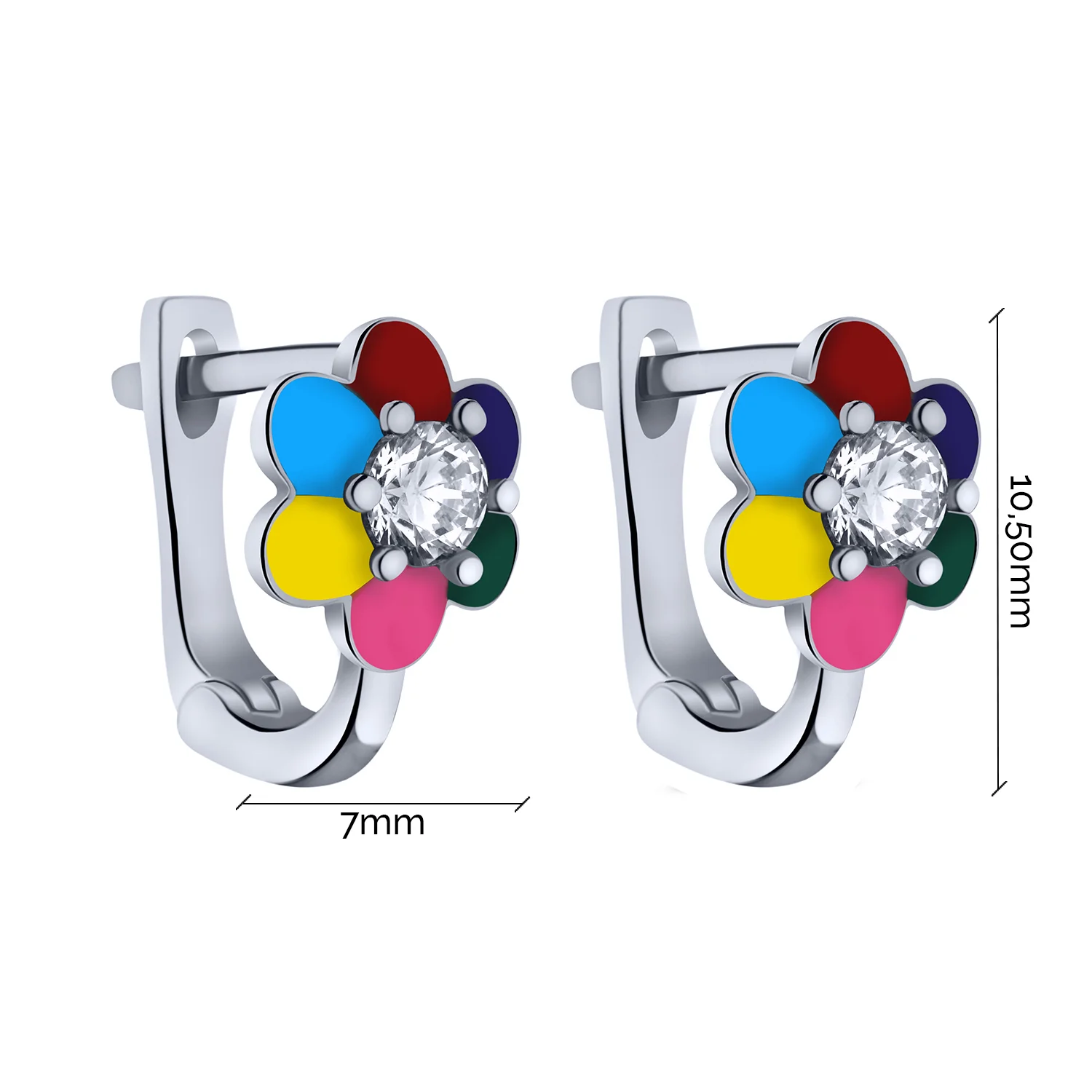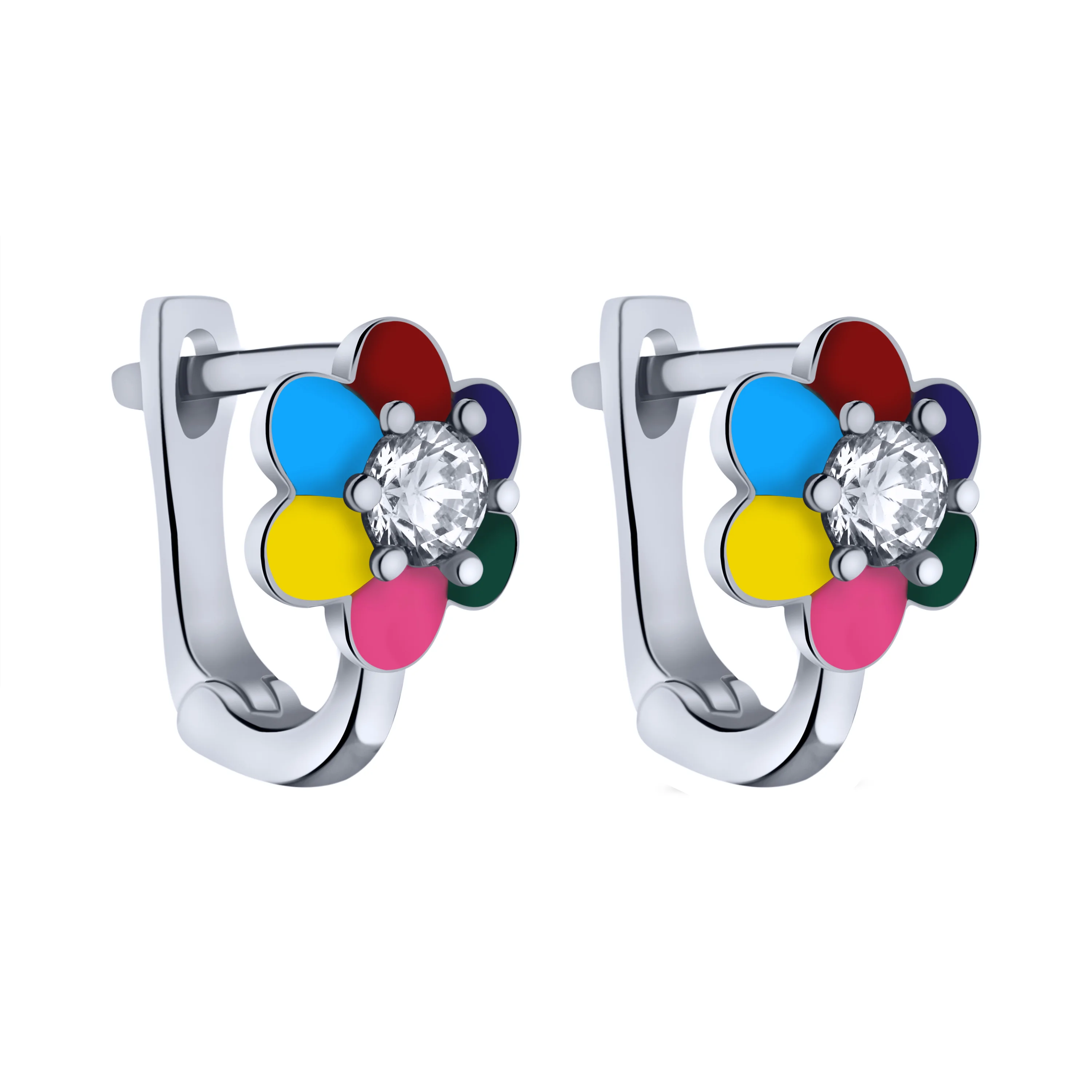 Детские серьги из серебра с фианитом и эмалью "Цветок" - 2148488