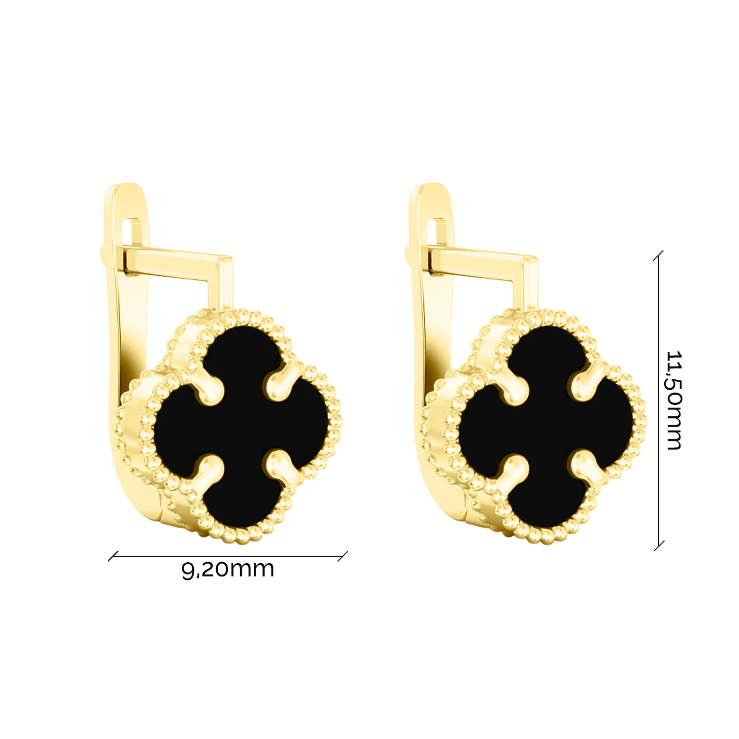 Эффектные серьги "Клевер" из желтого золота с ониксом - 2029163