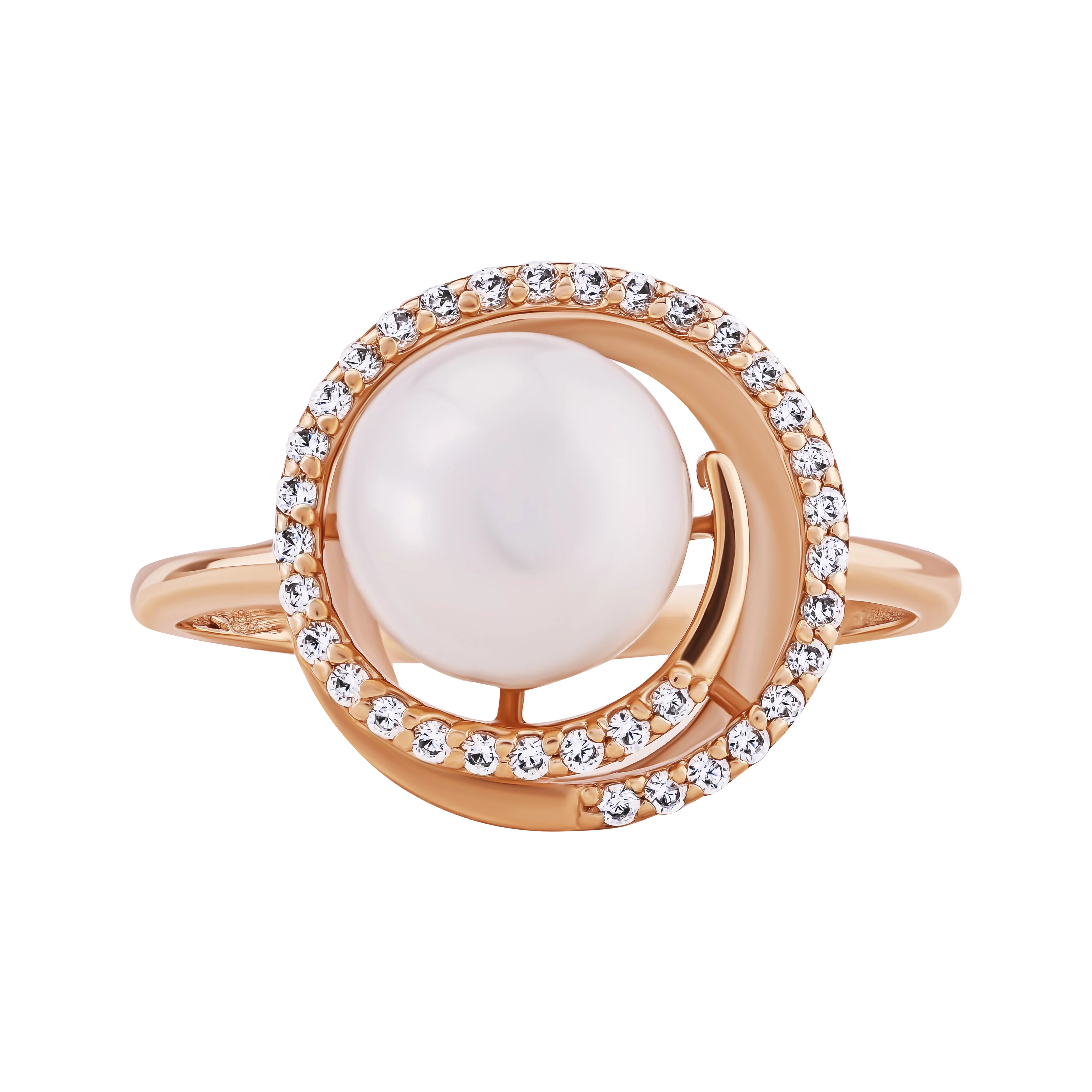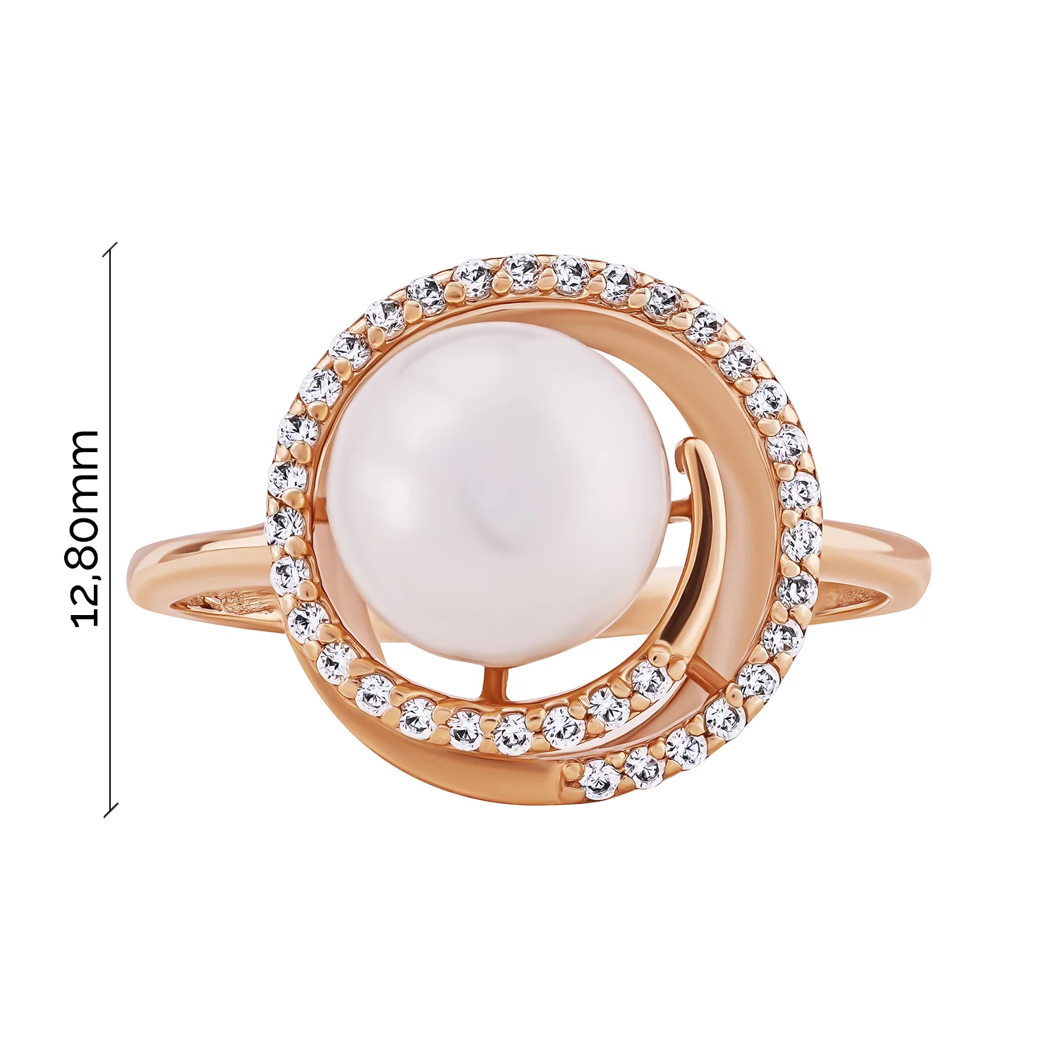 Стильное кольцо "Листок" в красном золоте с жемчужиной и фианитами - 1955339