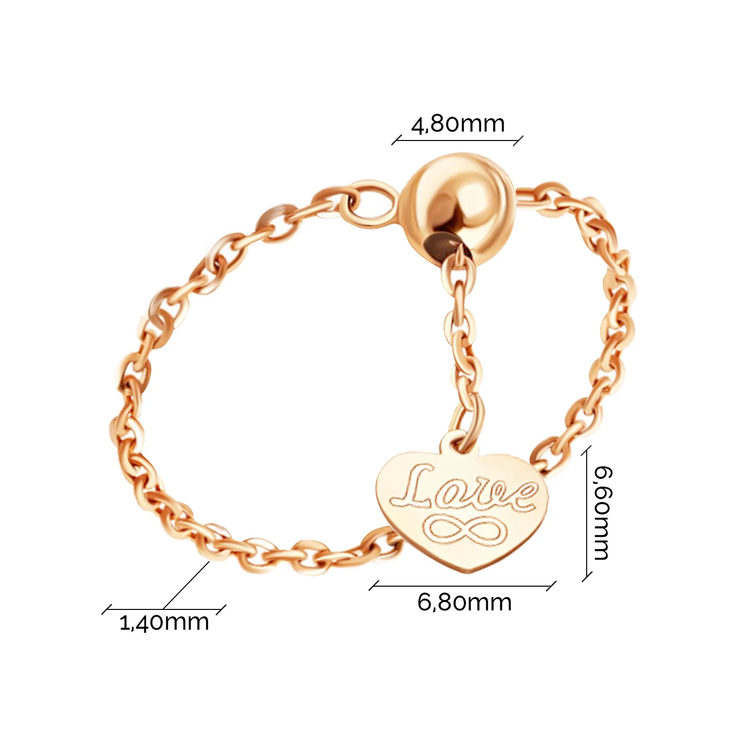 Оригинальное кольцо-цепочка с подвесом «Сердце» в красном золоте может стать идеальным ювелирным дополнением к романтическому или повседневному женскому образу. Это мягкое изделие, изготовленное из классического драгметалла 585 пробы с добавлением 9,5% меди в лигатуру сплава. Ободок кольца выполнен в виде цепочки, а украшает его подвес в форме сердца с надписью «Love» и выведенным под ней знаком бесконечности. Красный цвет золота и оригинальный дизайн делают изделие заметным на руке и привлекают внимание к пальцам, подчеркивая их изящность.