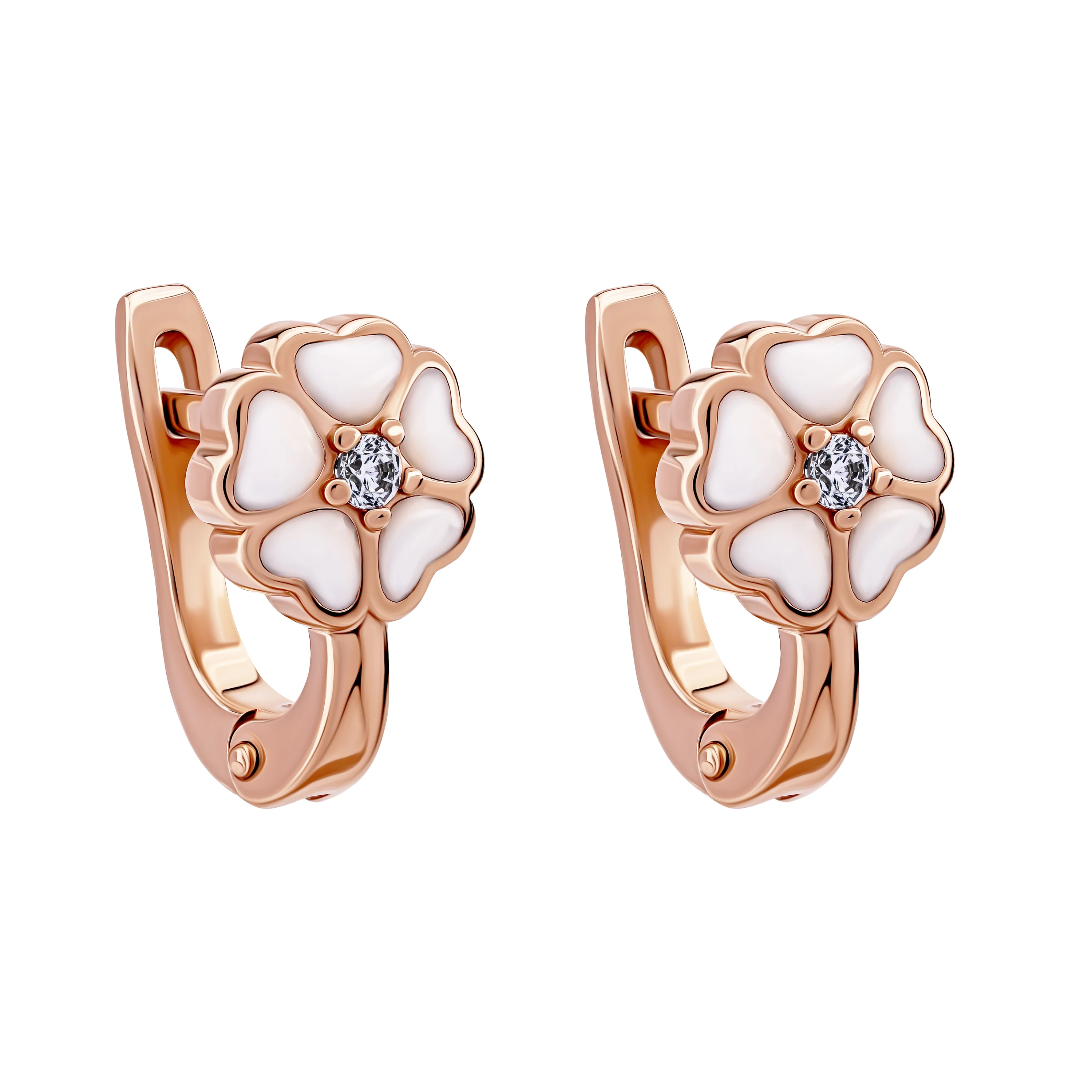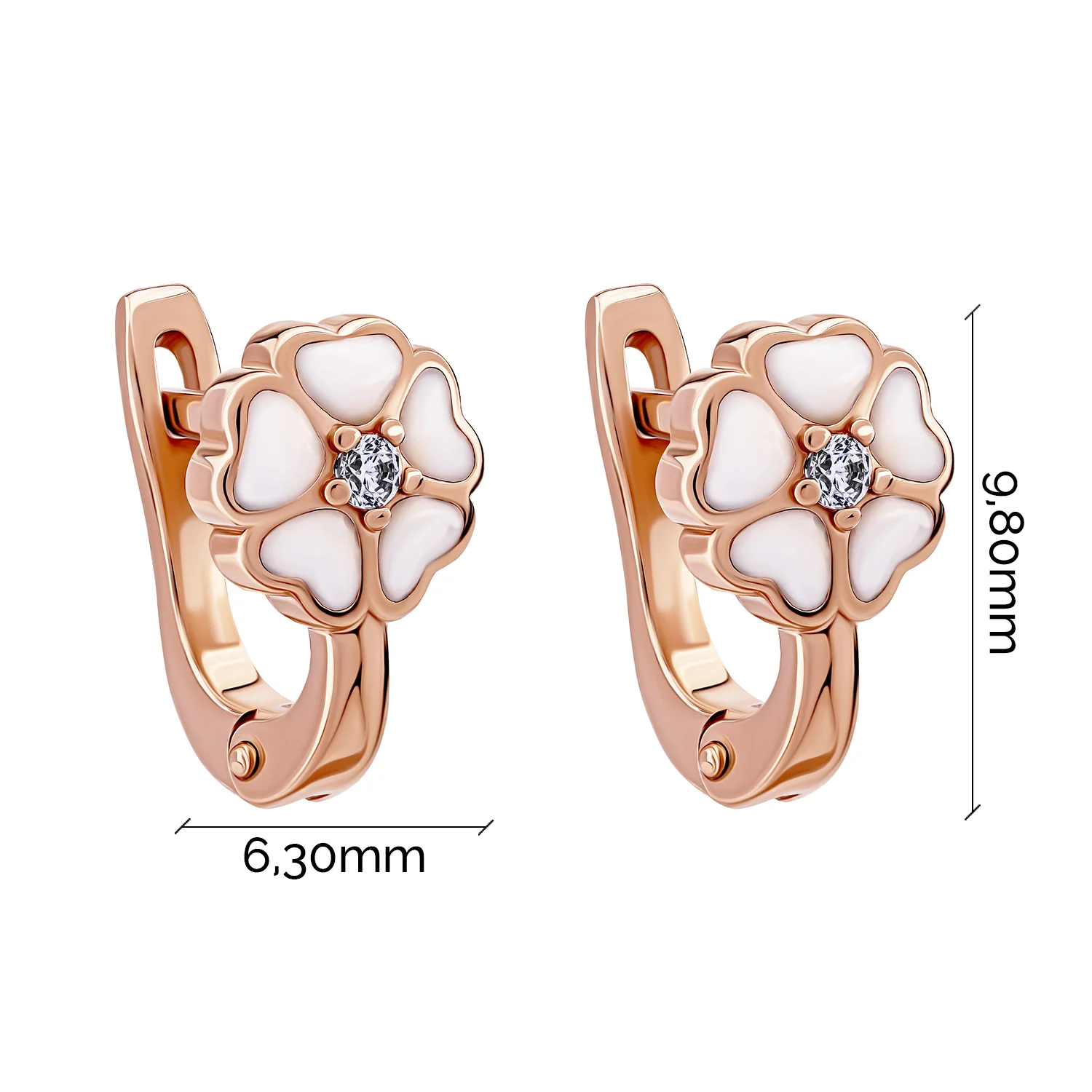 Элегантные детские сережки "Цветочек" в красном золоте с эмалью и фианитом - 1973620