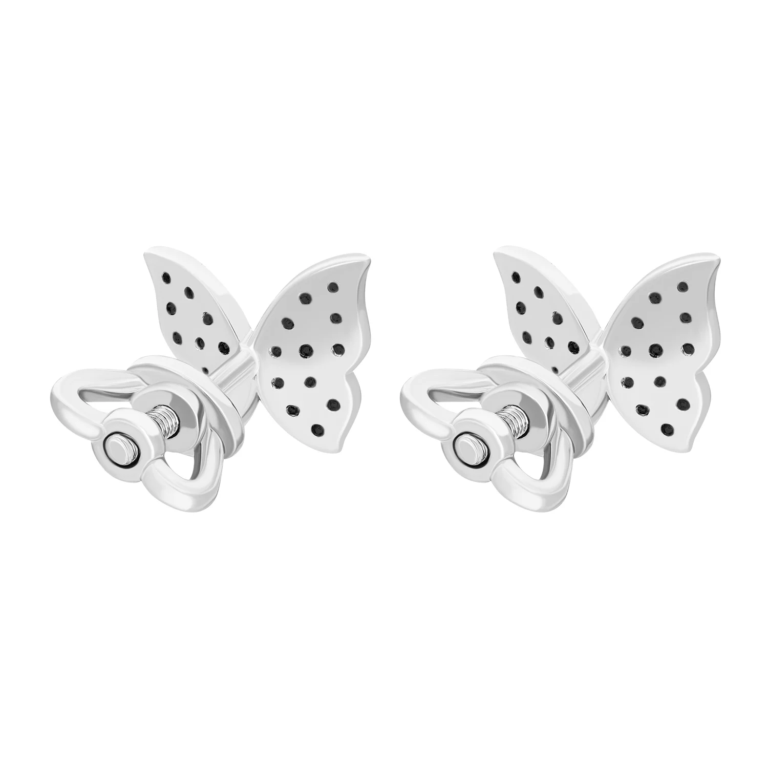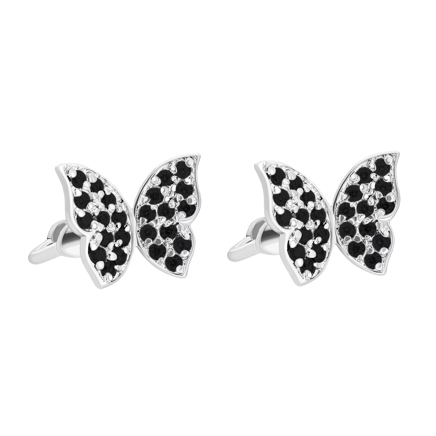 Серебряные стильные сережки-пусеты "Клевер" с ониксом и фианитами - 1940309