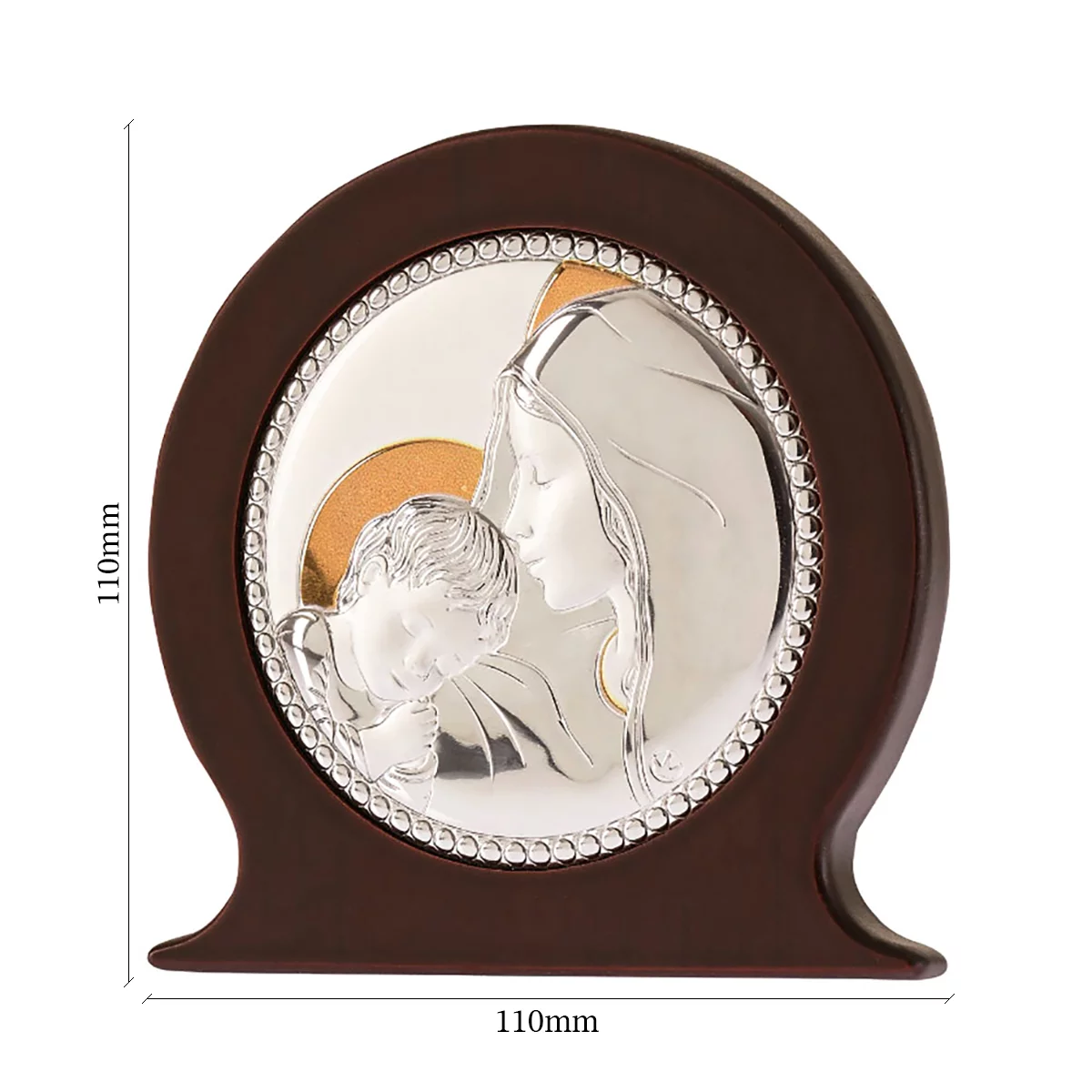 Икона «Богородица с младенцем» — образ в круглой оправе, который подчеркивает неразрывную связь между матерью и ребенком. У малыша закрыты глаза, ведь он в безопасности и под защитой. Богородица нежно целует прильнувшего к ней ребенка, символизируя утешение и надежду для верующих, которые к ней обращаются. Выполнена икона из белого, красного золота 375 пробы и их комбинации. Благодаря контрасту металлов изделие выглядит объемно. Все детали искусно прорисованы. Коричневая рамка, обрамляющая образ, придает изделию солидности. Такая икона станет памятным подарком для ребенка.