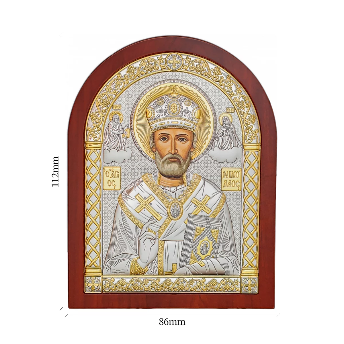 Икона из серебра «Николай Чудотворец» — почитаемый для православных христиан образ, олицетворяющий заступничество и высшую справедливость. Ему молятся, когда жаждут исцеления, вдохновения для новых свершений, и душевного покоя. Николай Чудотворец благосклонен к детям и тем, кто учится. Икона выполнена из серебра и обрамлена коричневой деревянной рамкой. На ней Чудотворец изображен с поднятой в благословляющем жесте правой рукой и закрытой священной книгой — в левой. Сочетание желтого и белого цветов металла создает выразительность. Дарить такую икону можно на праздники.