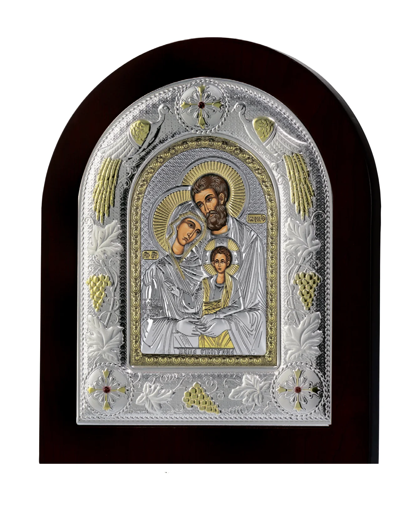 Икона «Святое Семейство» демонстрирует любимые для многих православных христиан образы — Марию, Иосифа и сына Божьего Иисуса. На полотне отец и мать показаны склонившимися друг к другу, они обнимают маленького Христа, обхватив его тело и соприкасаясь пальцами. У Иисуса правая рука поднята в благословляющем жесте. Такую икону ставят в доме, где живут члены одной семьи. К ней могут обращаться как взрослые, так и дети. Икона украшена узорами в виде птиц и гроздьев винограда, а также красными фианитами с круглой огранкой. Металлы белого и желтого цвета красиво дополняют друг друга.
