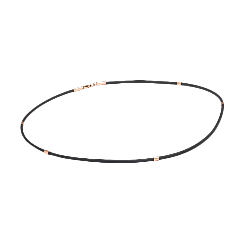 Декоративный каучуковый шнурок со вставками из красного золота. Гибкий дизайн популярного материала и прочный металл 585 пробы подходит для активного образа жизни. Особый состав лигатуры придает теплый красный оттенок готически черному основному цвету. Благородный блеск на матовом фоне шнурка еще более притягивает взгляд. Универсальный стиль позволяет носить на все случаи жизни. Изделие украшает тело и демонстрирует социальный статус. Для усиления эффекта и создания акцента можно комбинировать с золотым кулоном. Подойдет для подарка.