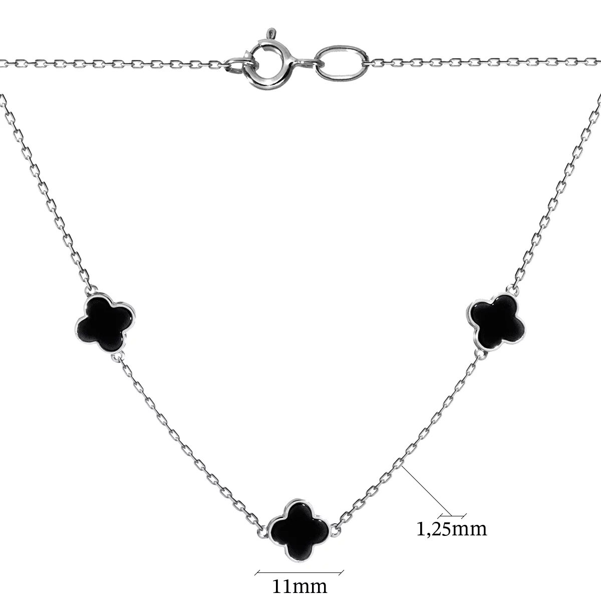 Женское колье в современном стиле Ван Клиф подойдет для оригинального fashion-образа. Выполнено из белого золота. Его состав способствует холодному оттенку украшения и повышенной стойкости к разрывам. Якорное плетение надежное и нежно выглядит на шее и зоне декольте. Колье инкрустировано агатом черного цвета в форме цветков клевера, которые не останутся без внимания. Шпрингельный замок простой в использовании и прочный. Золотое украшение подойдет для повседневных образов. Также будет уместным для торжественного выхода.