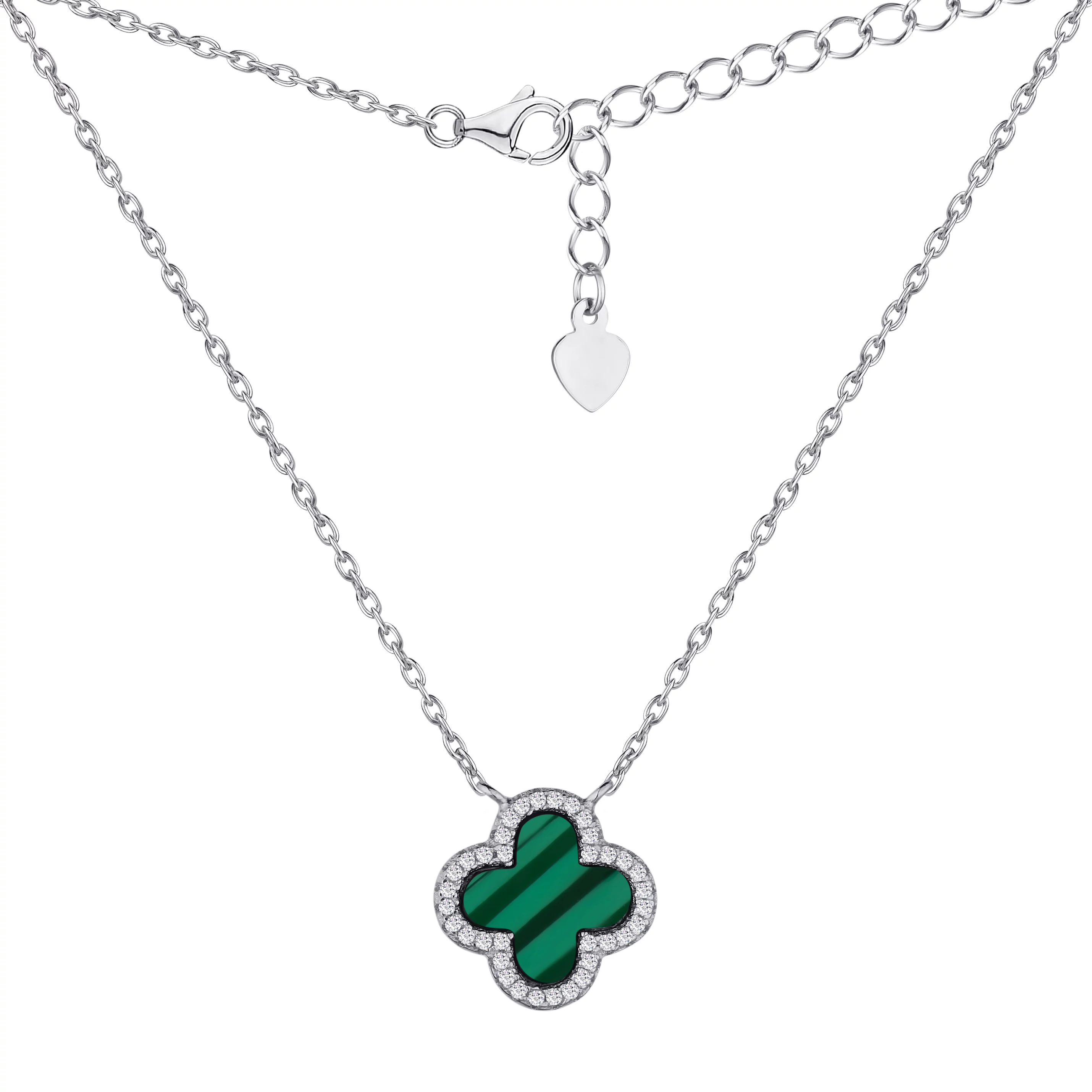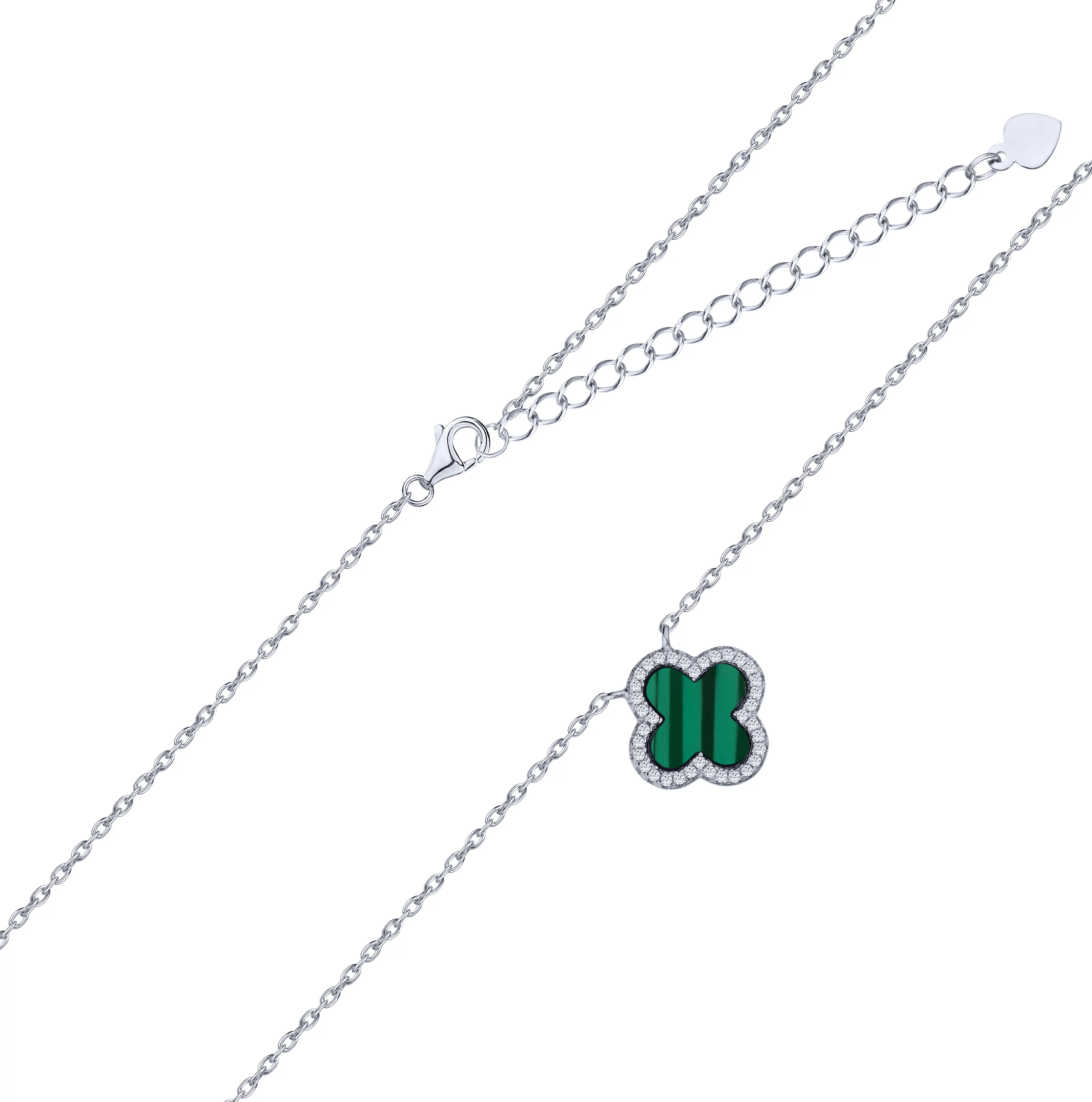 Стильное колье с подвесом из серебра в форме клевера с якорным плетением, малахитом и фианитами - 1935096