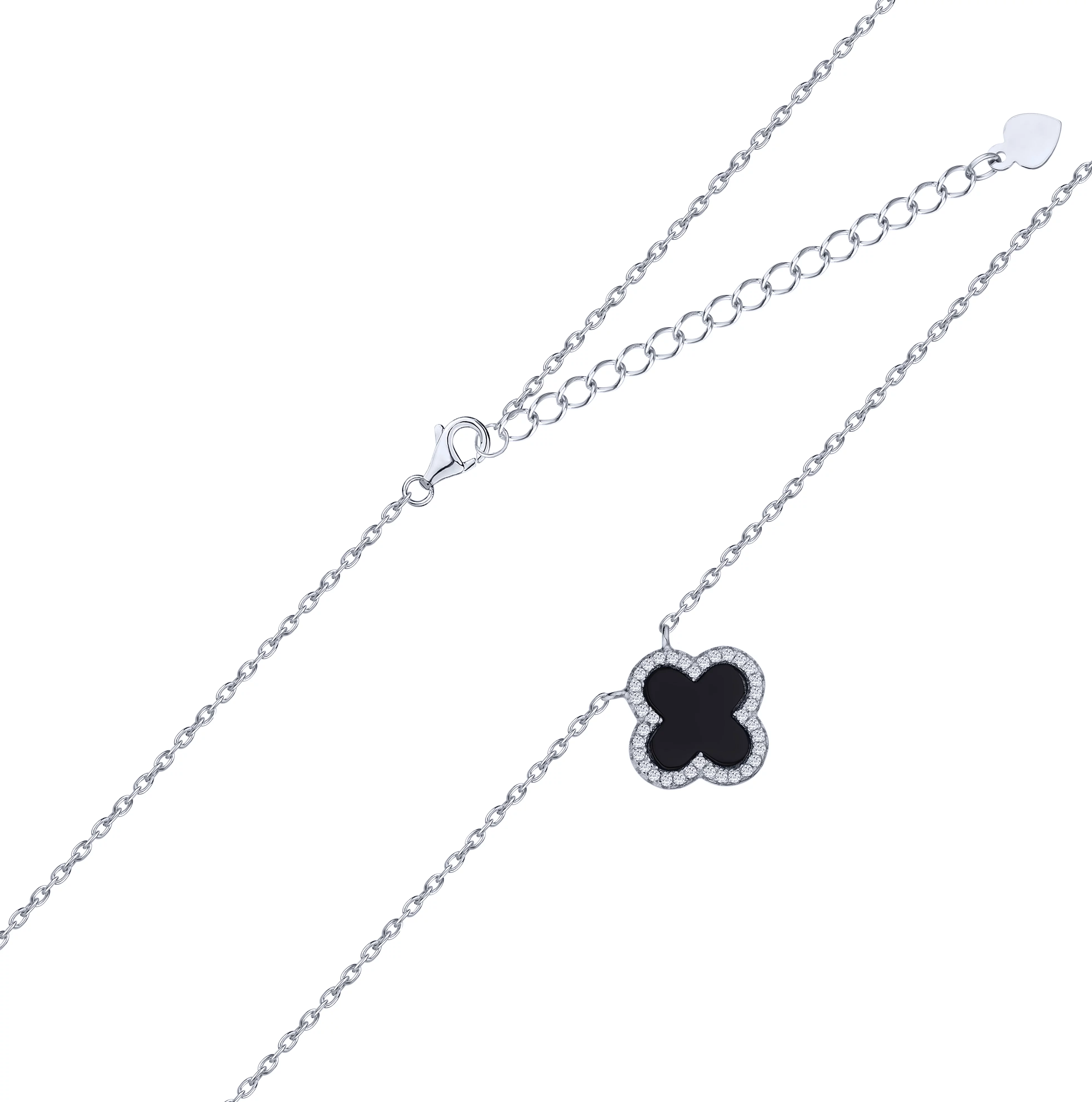 Серебряное кольє с подвесом "Клевер" с ониксом якорное плетение - 1822877
