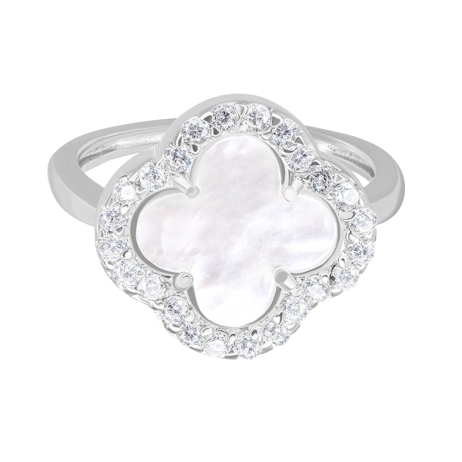 Кольцо из белого золота "Клевер" с перламутром и фианитами - 1531141