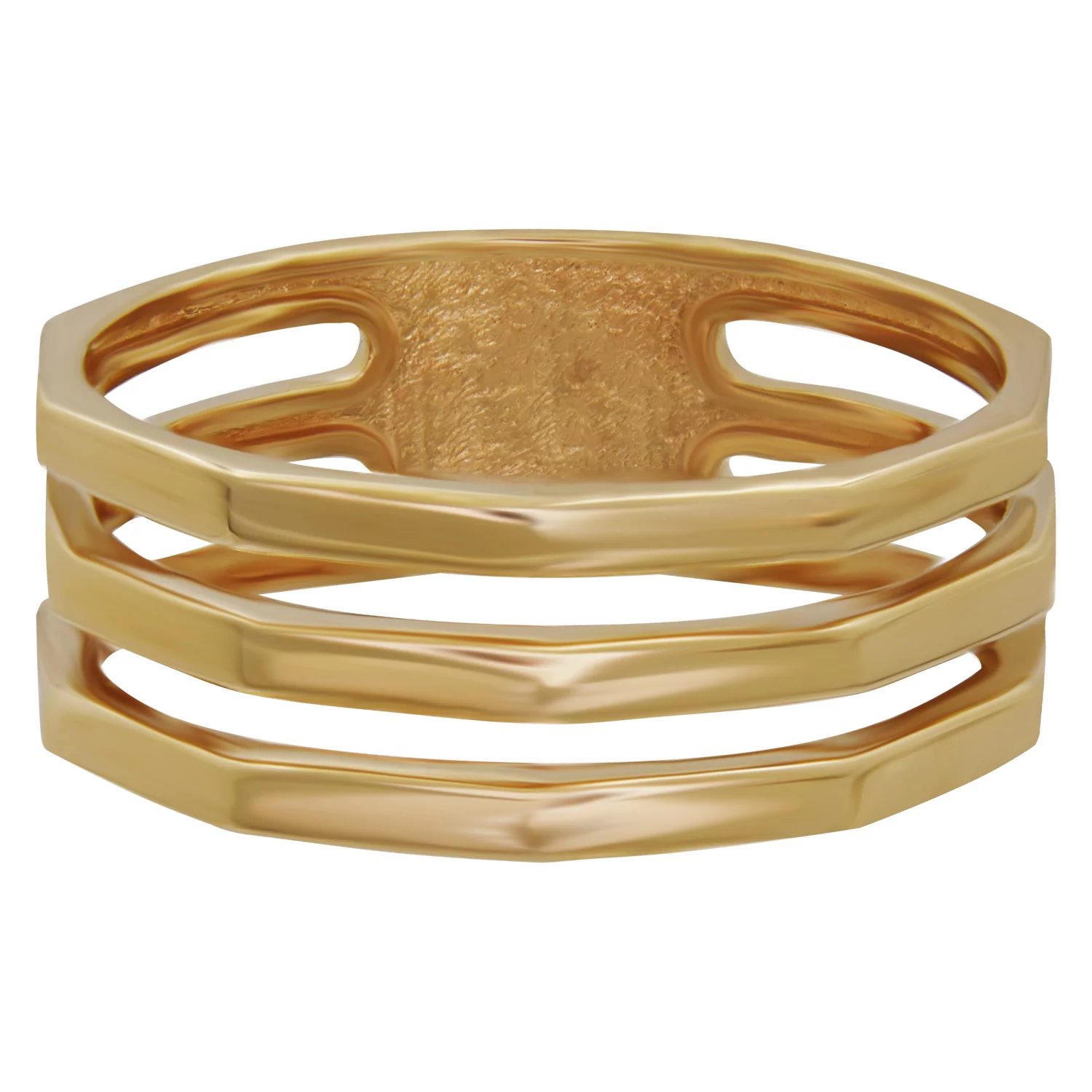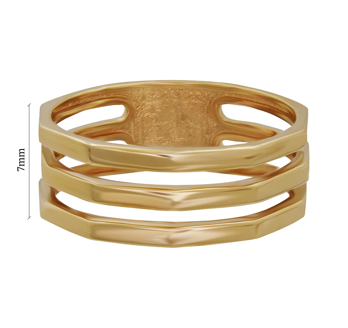 Золотое кольцо отличает лаконичность дизайна. Отсутствие декоративных элементов компенсировано необычной формой. Модель обыграна в виде трех тонких колец в одном с пространством между ними. Их соединяет небольшая перемычка. Композиция будет гармонично сочетаться с нарядами и украшениями в стиле минимализм. Сплав красного золота 585-й пробы известен крепостью и надежностью, повышает срок службы изделия. Благодаря ему металл получил мягкий и приятный оттенок. Кольцо дополнит праздничные и ежедневные образы элегантным акцентом.