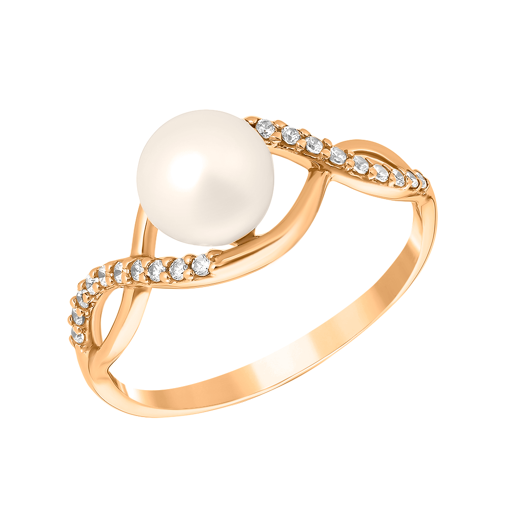 Кольцо из красного золота с дорожкой фианитов и жемчужиной - 1564305