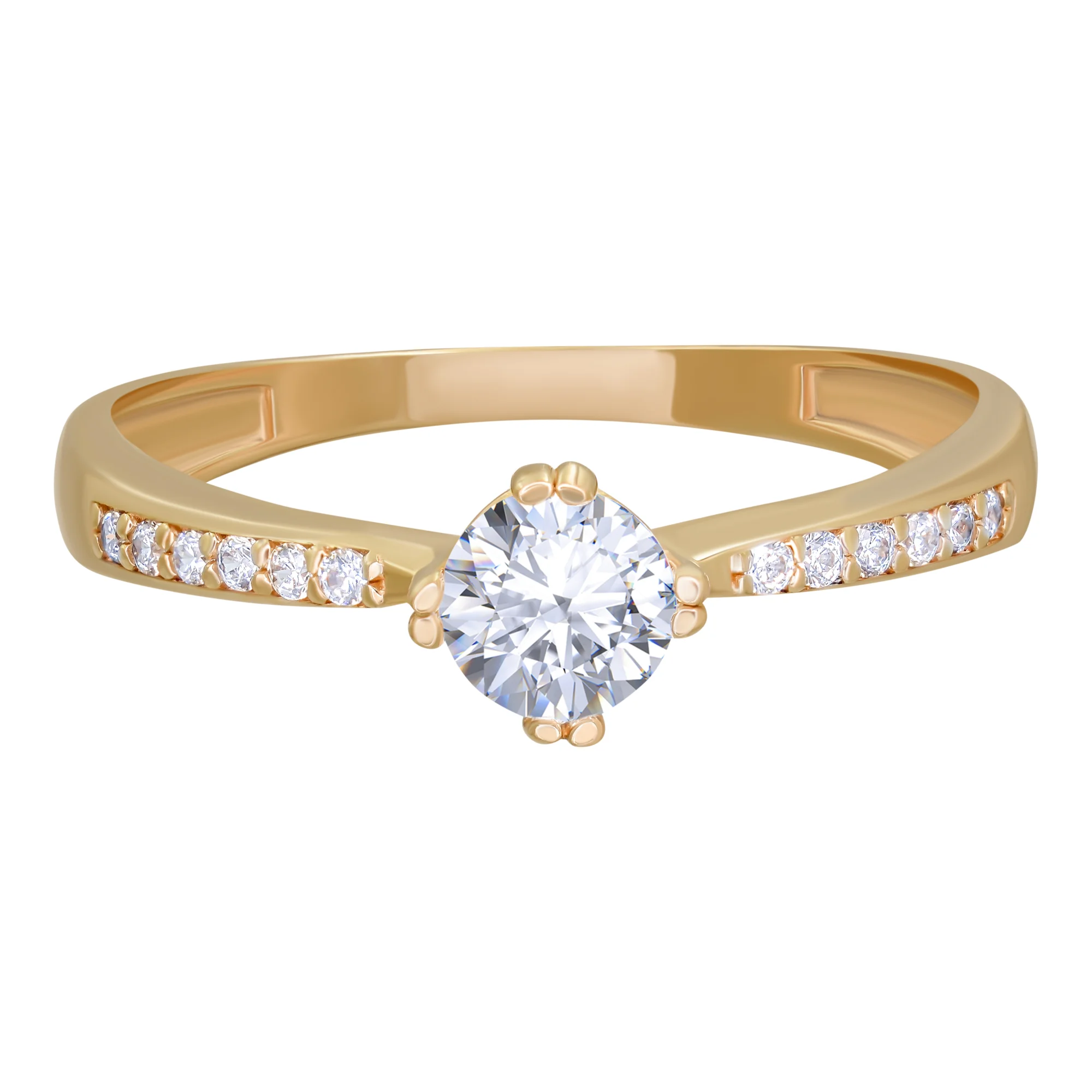 Это золотое кольцо обладает изысканным дизайном в классическом стиле. Центральный цирконий круглой формы отражает максимум света благодаря правильной огранке. Лучи не рассеиваются в камне, а отражаются. Он надежно зафиксирован четырьмя парами крапанов. От каста в обе стороны располагаются дорожки с небольшими циркониями в канальной закрепке, которые дополняют искристый образ изделия. Такое кольцо станет желанным подарком для каждой женщины или девушки вне зависимости от повода и праздника, вызывая искренние эмоции счастья и радости.