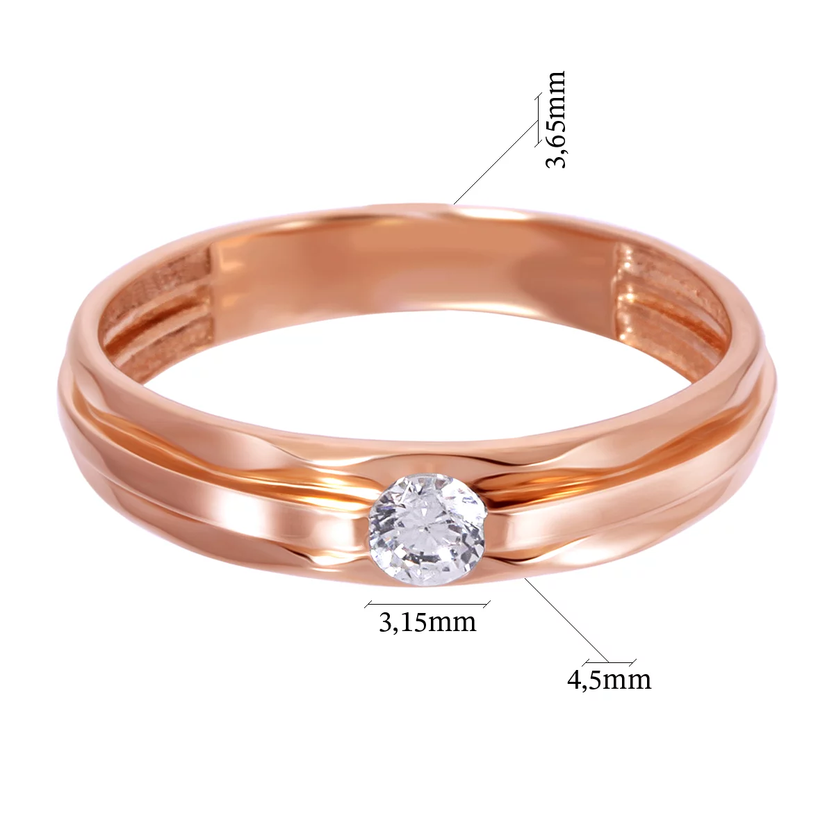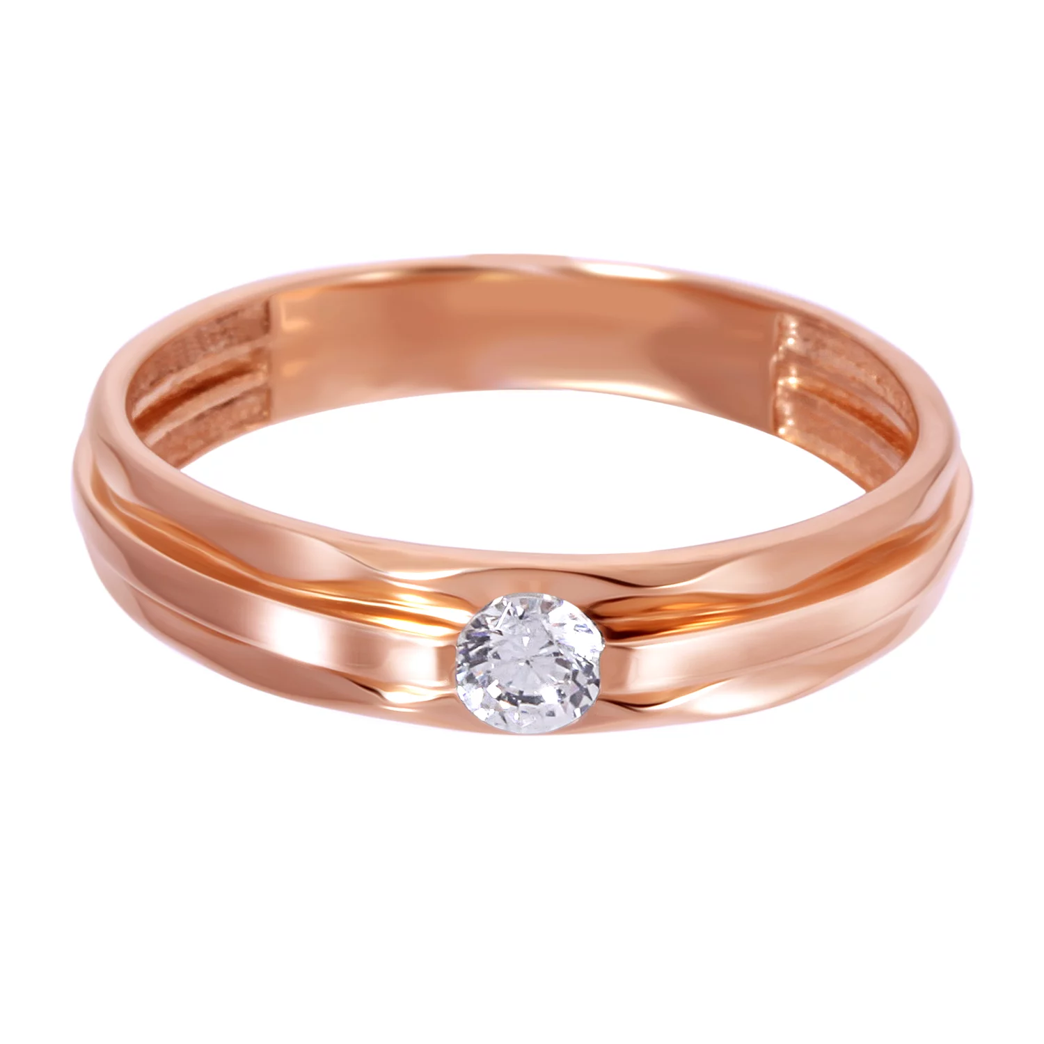 Изысканное помолвочное кольцо из красного золота 585-й пробы. Насыщенный оттенок ему придает медь, а прочность украшения обеспечивают добавки серебра. У фигурной шинки полированная фактура, внешний профиль прямой. Верхушка инкрустирована цирконием круглой огранки, который зафиксирован с двух противоположных сторон частями обода (полуглухая оправа). Когда сверху и по бокам на камень падают лучи света, они преломляются, и появляются радужные переливы. У кольца классический лаконичный стиль, что позволяет ему органично смотреться в любом образе.