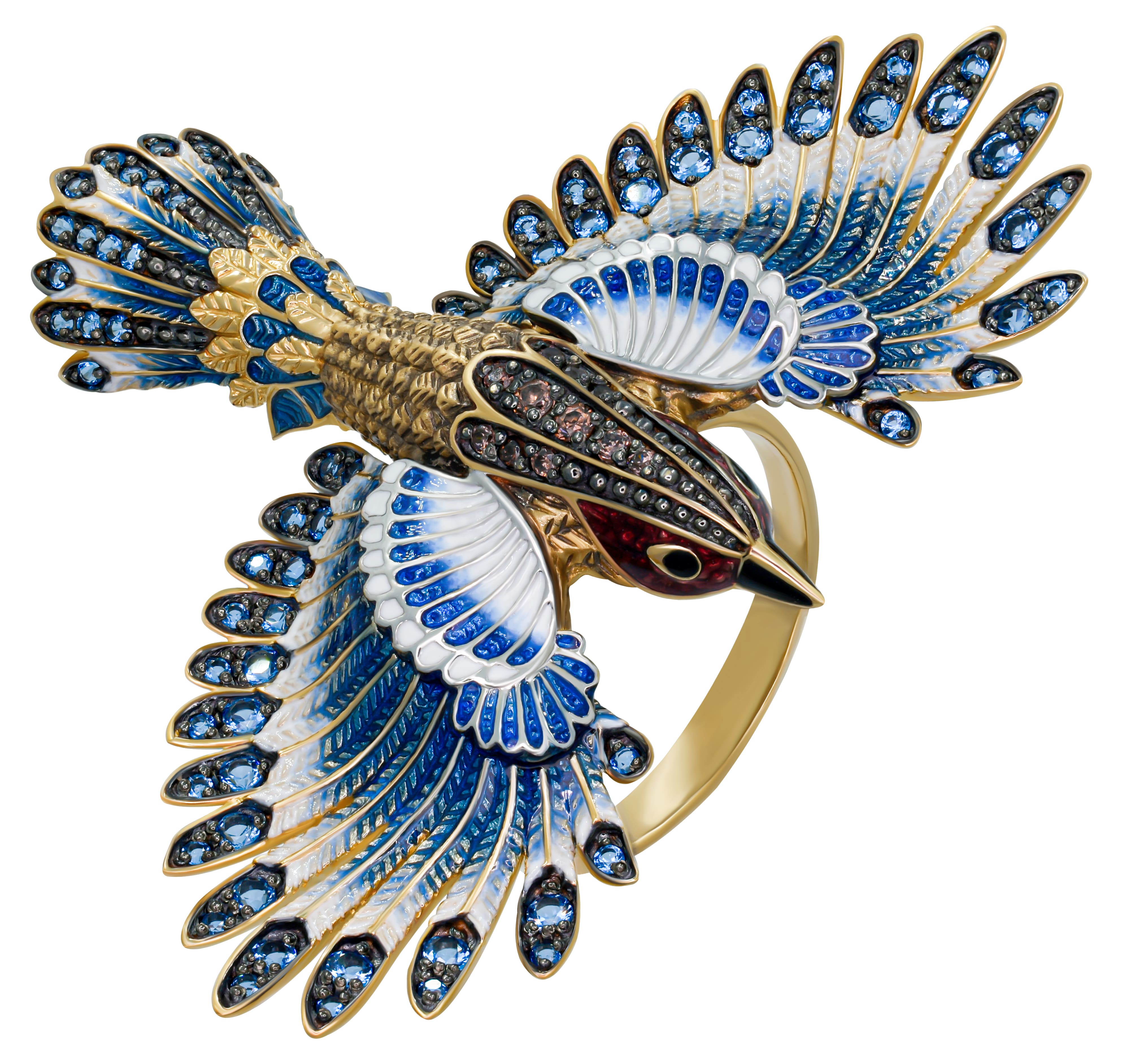 Кольцо из желтого золота с эмалью и фианитом "Сойка пересмешница" - 947252