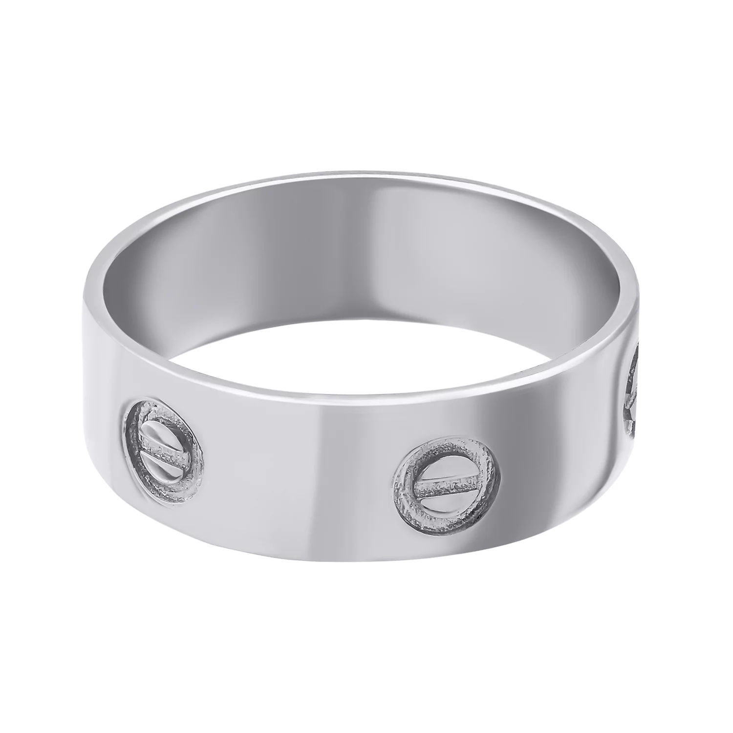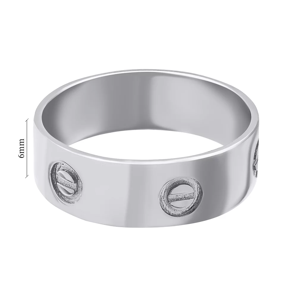Кольцо Love из белого золота выглядит элегантно и современно благодаря блеску и яркости драгоценного металла. Никель, палладий и другие составляющие в сплаве делают материал подходящим, чтобы носить ежедневно и не переживать о влиянии активного способа жизни. Кольцо выглядит оригинально благодаря тиснениям по всему ободку. Изделие с широким основанием подойдет девушкам и юношам с тонкими длинными пальцами. Кольцо Love станет отличным подарком по случаю выпускного или свадьбы. Универсальный дизайн позволяет гармонично вписать изделие в ювелирный комплект.