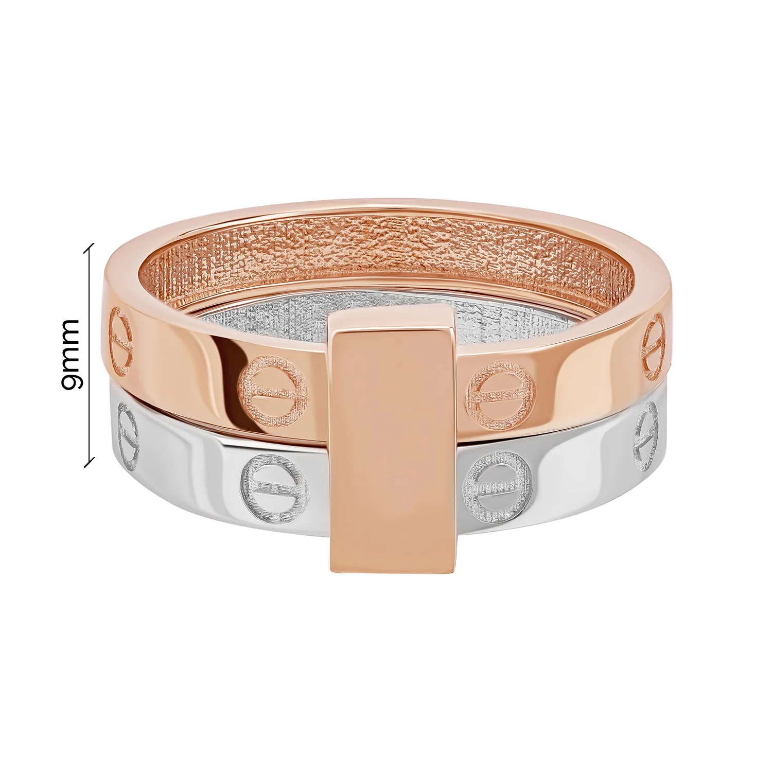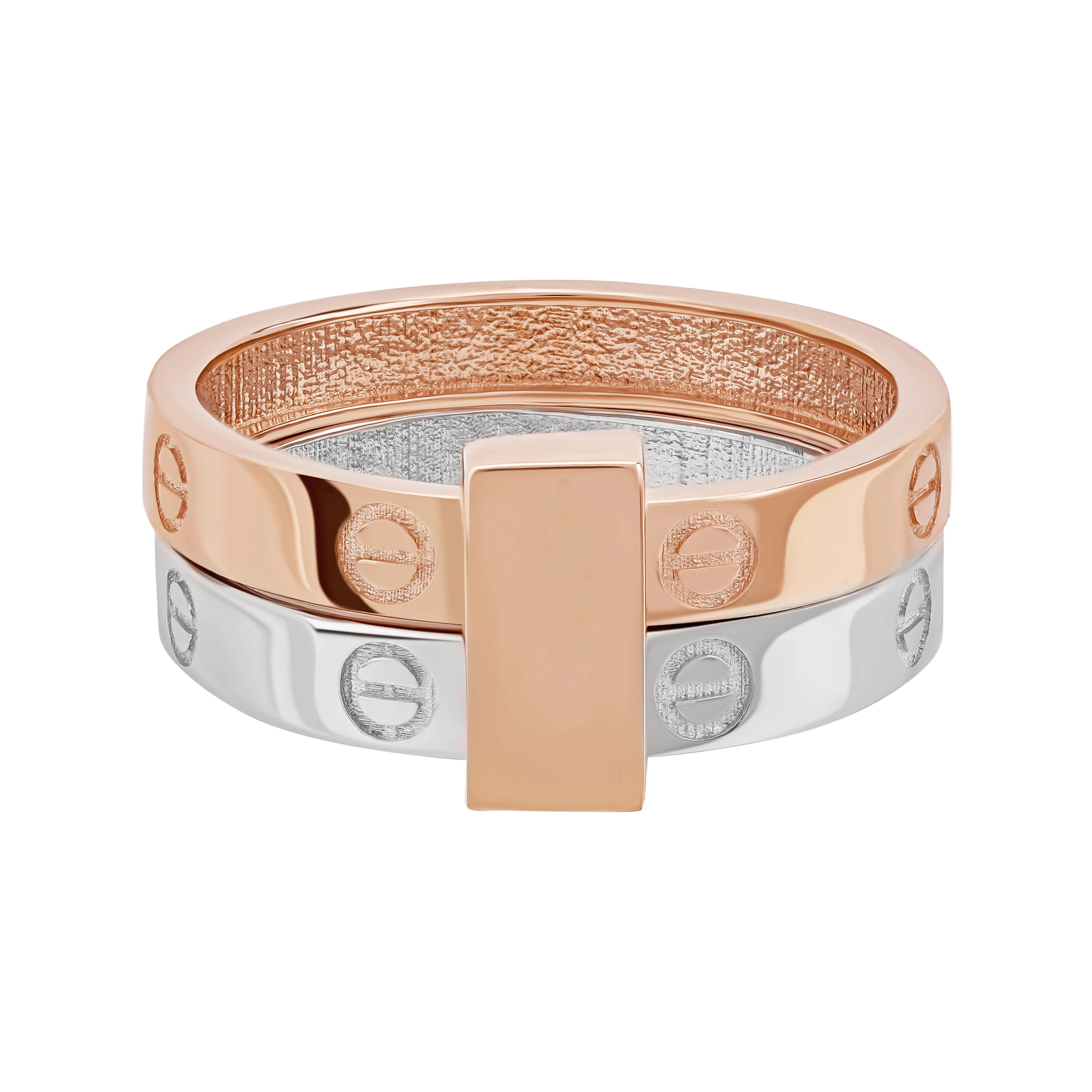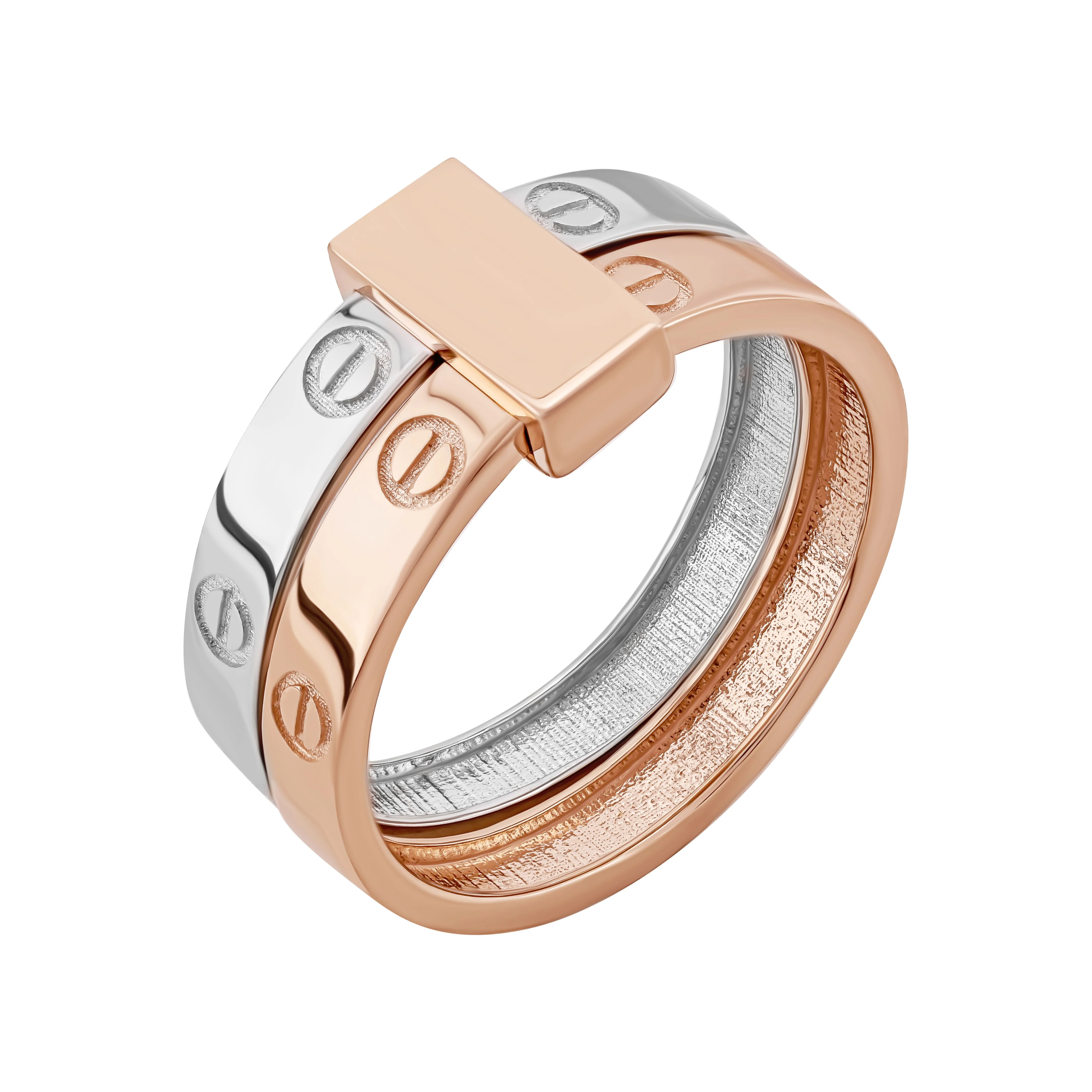 Эффектное, выразительное кольцо Love, которое подчеркивает индивидуальность. Выполнено из комбинированного материала 585 пробы. Одна половинка — красное золото. Сплав получен путем добавление меди. Вторая — белое золото. Сплав легирован палладием. Соединены обе части красивой прямоугольной перегородкой огненного цвета. На ее наружной грани выгравировано название ювелирного дома Cartier. На каждой половинке украшения в верхней части вырезаны круги, напоминающие шляпки болтов, — по две штуки с обеих сторон накладки. Это символы двух фрагментов единого целого.
