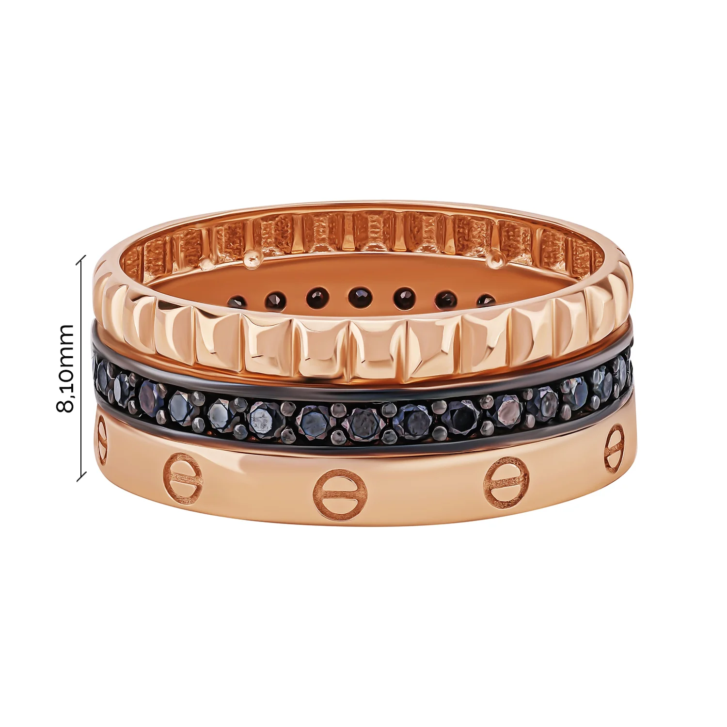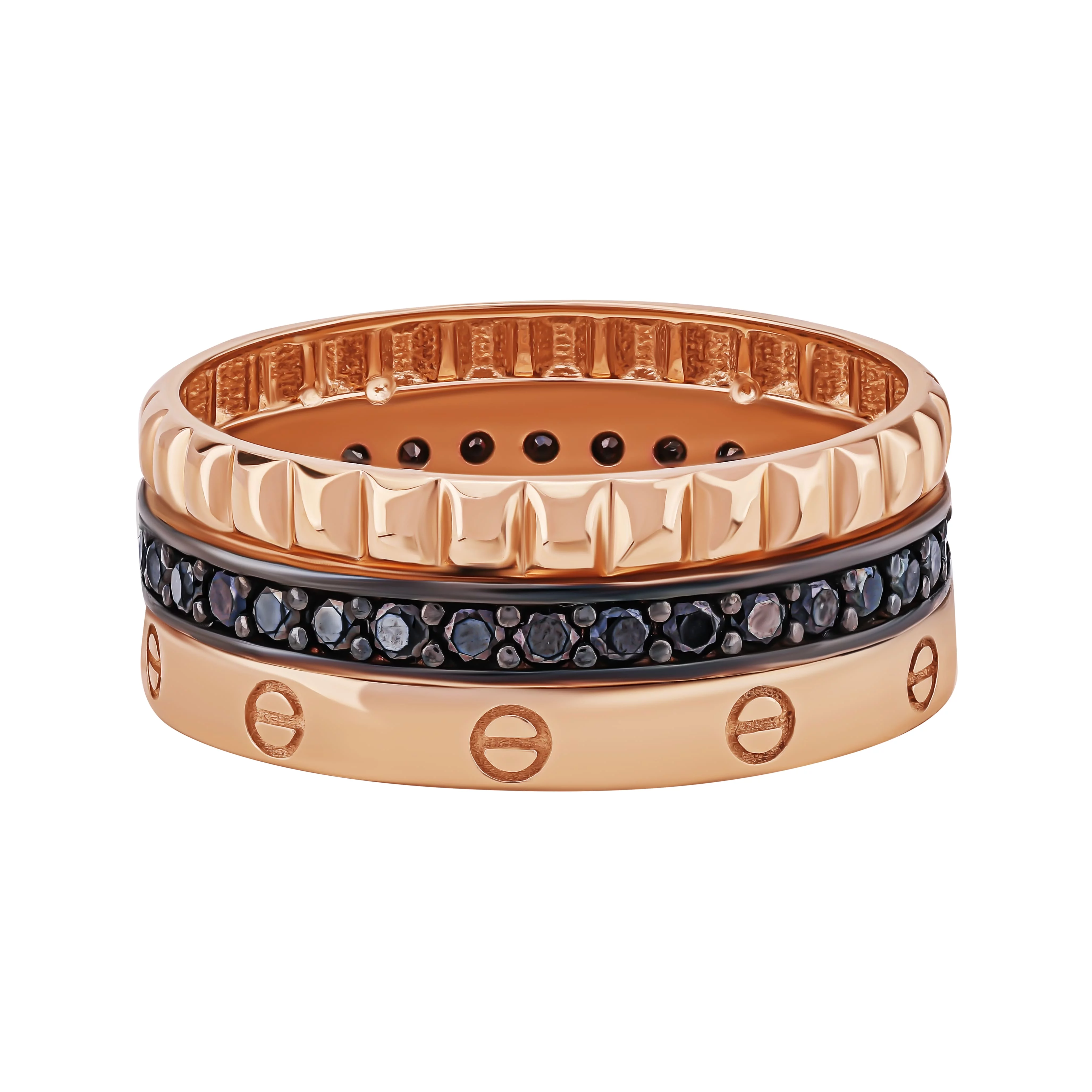 Кольцо с фианитами Love из красного золота — роскошь, облаченная в элегантную форму. Такое ювелирное украшение привлекает внимание дизайном и сочетанием контрастных цветов. Изготовлено кольцо из красного золота 585 пробы, насыщенный оттенок которому придает медь в лигатуре сплава. Широкая шинка разделена на три части, у каждой из них свой узор. В среднем фрагменте ободка выложена дорожка из черных фианитов с круглой огранкой, придающая изделию загадочность. Такое украшение может стать памятным подарком для девушки или женщины на любой праздник.