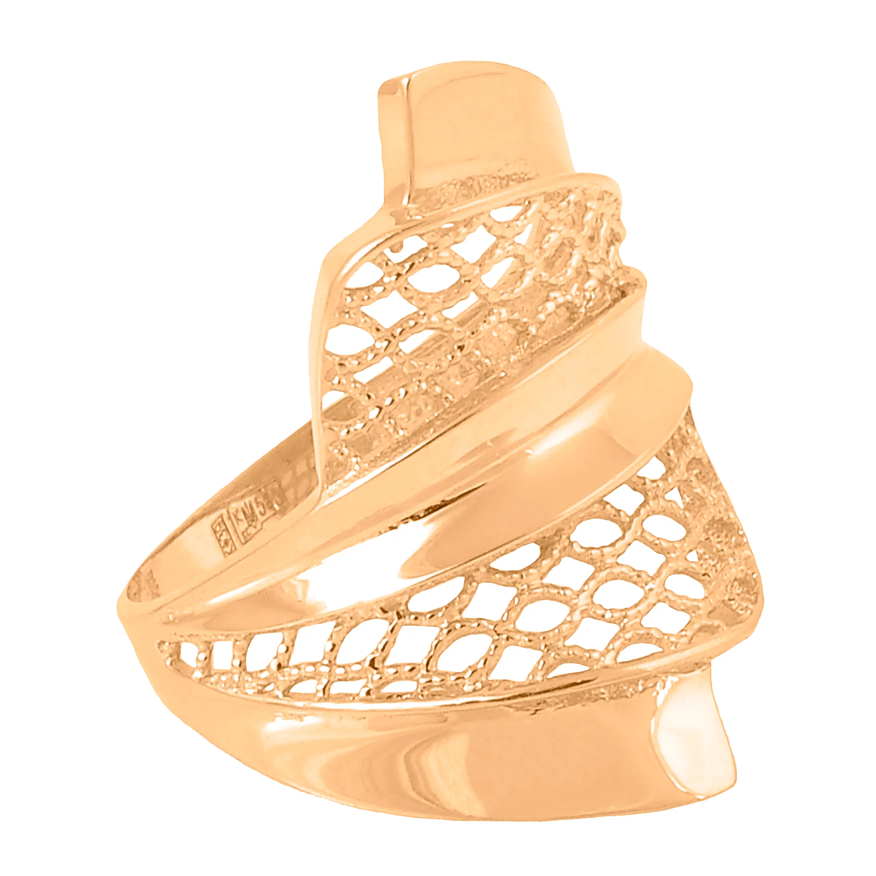 Кольцо, изготовленное из красного золота 585 пробы. Такую модель оценят поклонники нестандартного подхода к дизайну украшений. В тыльной части оформление мало чем отличается от других колец — это обод средней ширины. При постепенном его расширении в центре создается оригинальная композиция, где сплошные полосы чередуются с ажурными, глянцевое покрытие — с матовым. При этом встречаются они под углом, в результате образуется ступенчатая поверхность. Высокое качество обработки металла и уникальный дизайн — для тех, кто привык к лучшему.