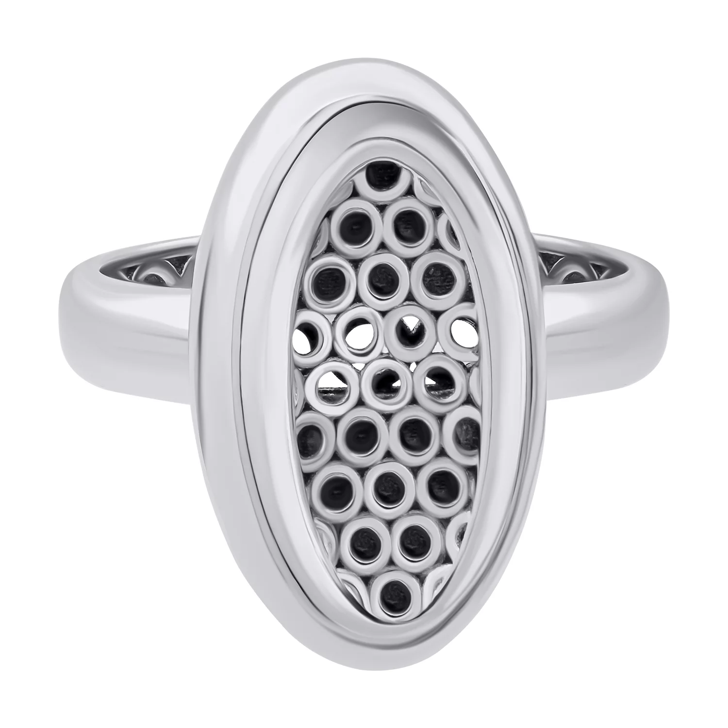 Эффектное кольцо выполнено из серебра 925 пробы с платиновым покрытием. Его главное украшение — декоративный эллипсовидный элемент. Гладкий контур эллипса заполнен в углублении сеткой из круглых отверстий с чернением. Они также выполнены на внутренней стороне ободка. Контраст черного серебра и блестящей платины подчеркивает необычную форму кольца, которую хочется рассматривать. Кроме того, покрытие придает украшению большую прочность. Это отличный выбор для яркого акцента как в повседневном образе, так и в праздничном.