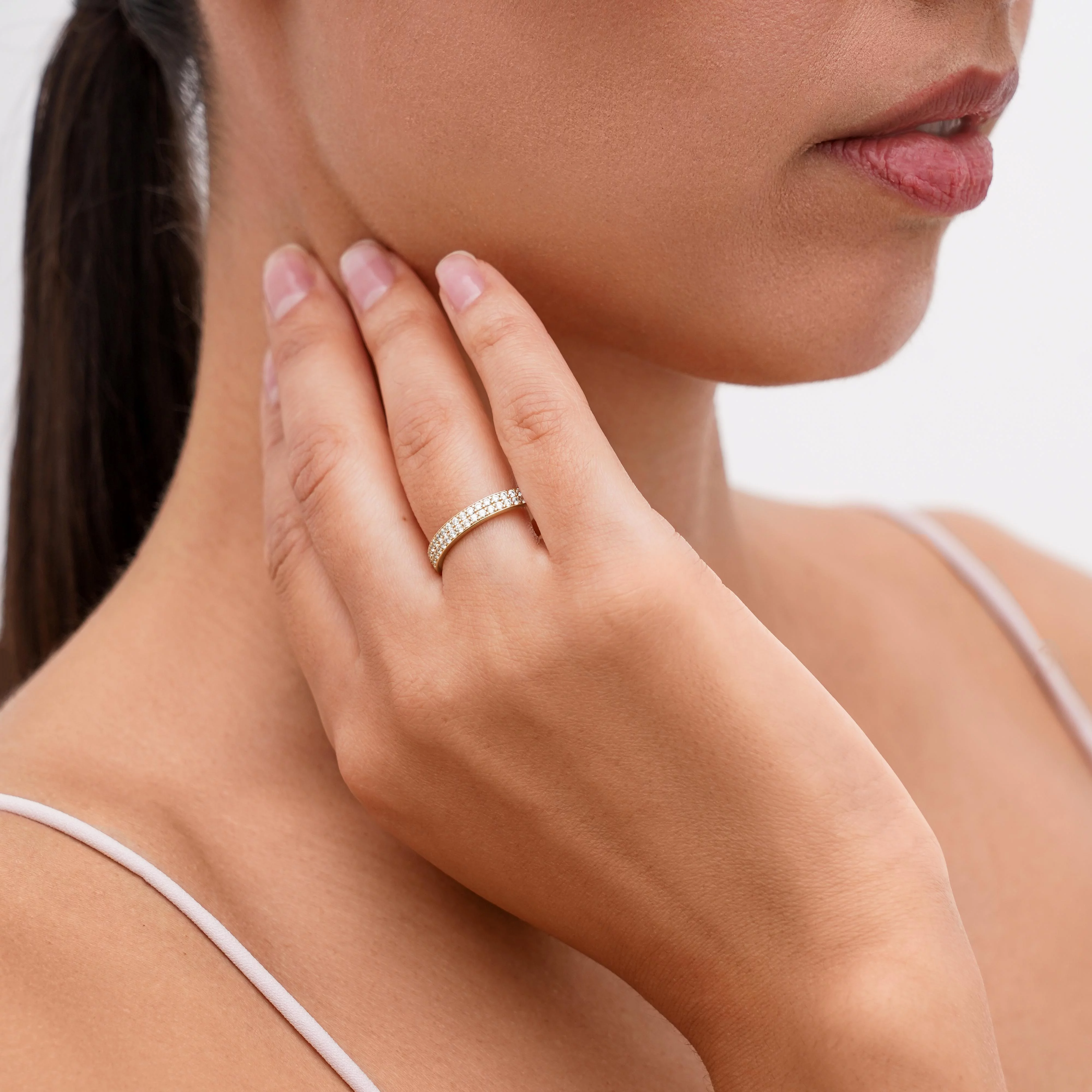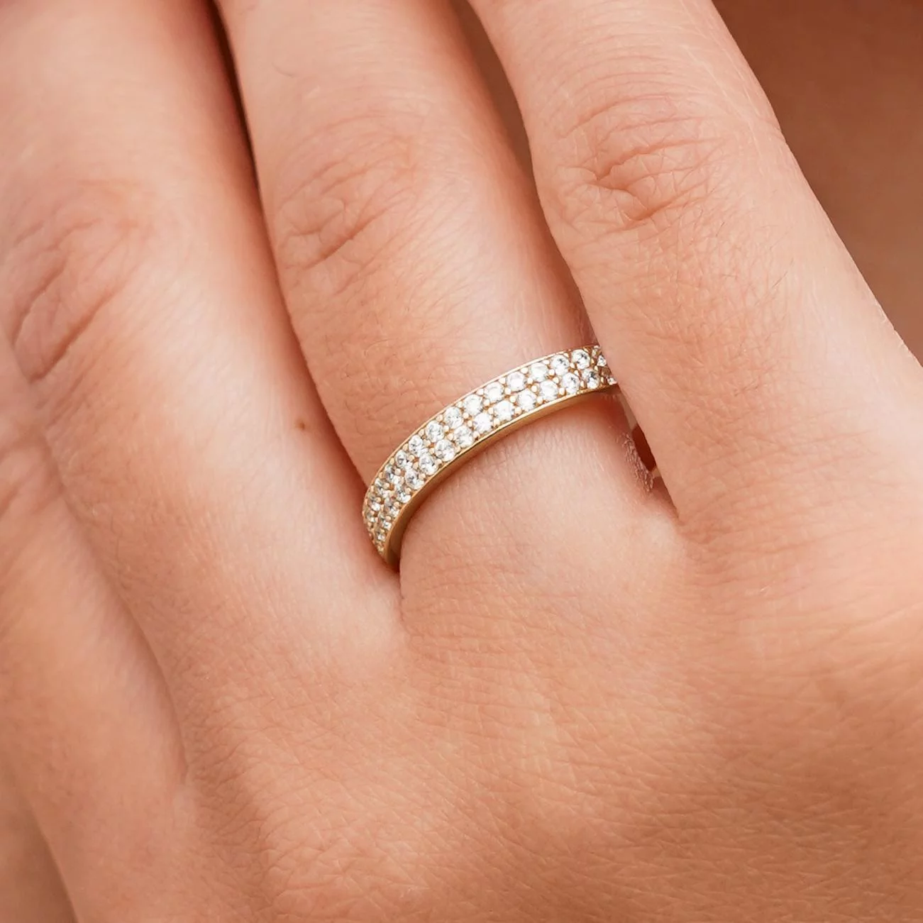 Кольцо в красном золоте с фианитами — сияющее изделие, которое изысканно подчеркнет красоту и женственность рук девушки. Украшение привлекает приятным теплым оттенком. Основание кольца наполовину покрыто маленькими фианитами. Прозрачные кристаллы с круглой огранкой близко посажены друг к другу, благодаря чему создают визуальный эффект сияющей дорожки. Цвет фианитов позволяет сочетать кольцо с серьгами или подвеской с похожим дизайном. Украшение из красного золота станет уместным подарком на помолвку, день рождения или другой праздник.