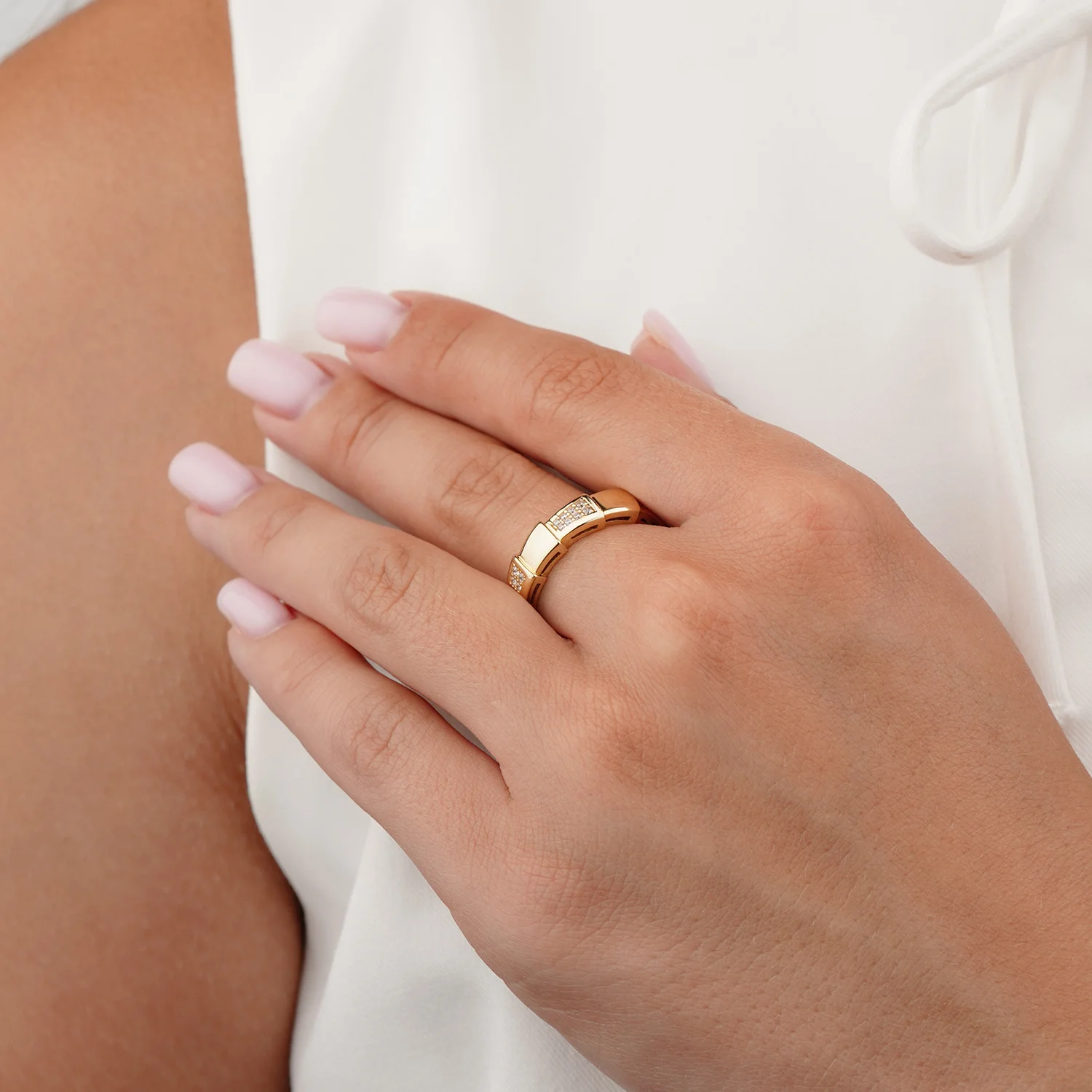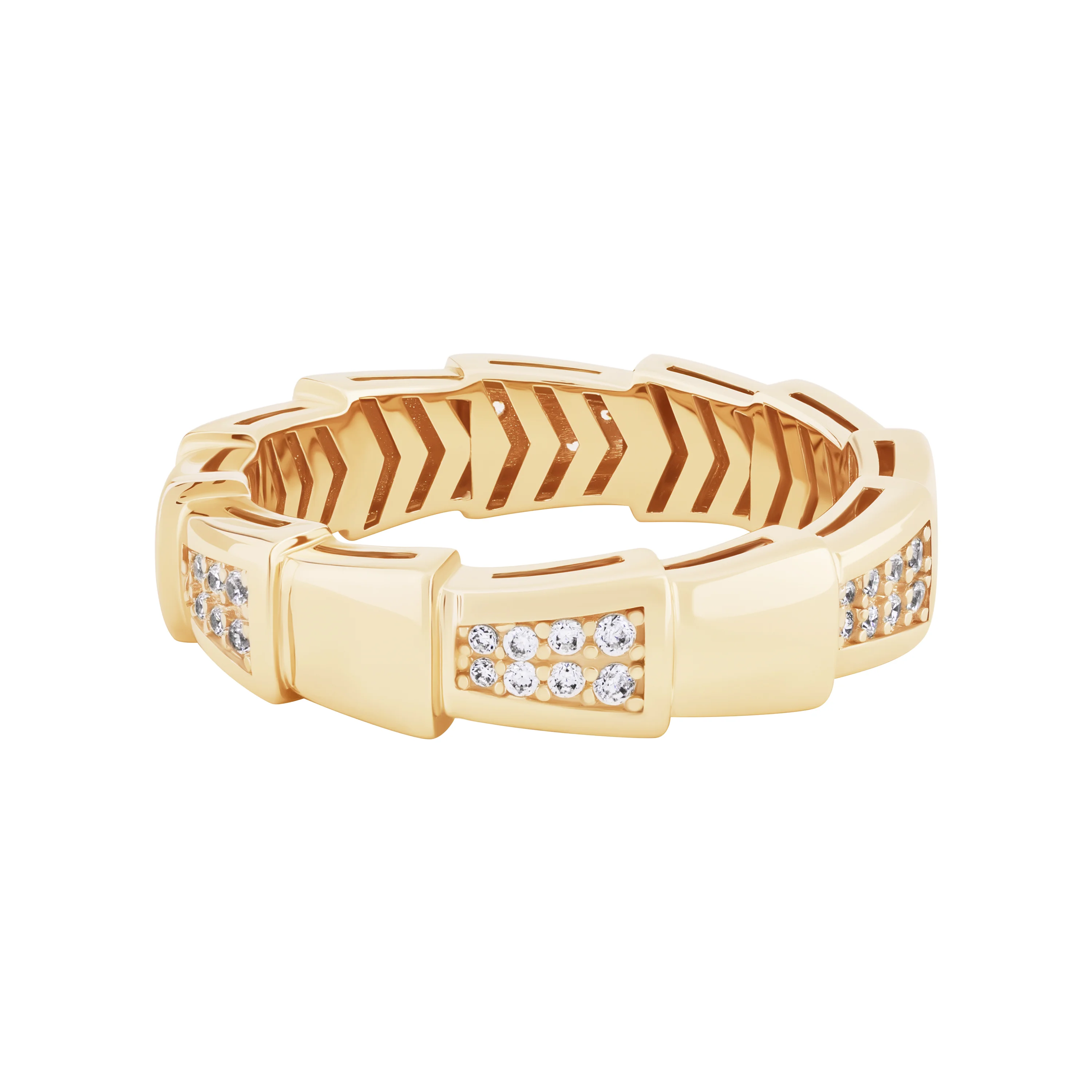 Кольцо «Змея» в желтом золоте с фианитами — ювелирное украшение в стиле Булгари, выделяющееся грациозностью и визуальной гибкостью. Оно изготовлено из драгоценного металла 585-й пробы, в состав лигатуры сплава которого добавлено 11,5% меди, что придает ему насыщенный желтый оттенок. Своей формой кольцо напоминает гибкое тело змеи, символизирующей мудрость и жизненную силу. Украшают изделие камни. Вставки — прозрачные фианиты — сверкают под лучами света, придавая кольцу роскошь. Носить его можно как сольно, так и в сочетании с другими ювелирными изделиями с камнями или без.