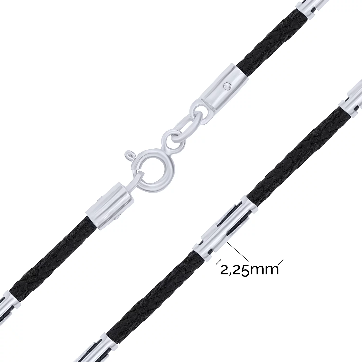 Кожаный шнурок с серебряными вставками — стильное дополнение к образу, которое может быть как сольным украшением, так и частью ювелирного ансамбля. Изготовлено изделие из двух видов материалов, чьи контрастные цвета делают его ярким и заметным на теле. Кожаный шнурок образуют переплетенные нити, составляющие лаконичный узор, а украшают его вставки из серебра 925 пробы с родированием. Застежка выполнена в форме круглого шпрингельного замка с пружинной защелкой. Такое украшение может стать элементом повседневного, офисного и других нарядов.