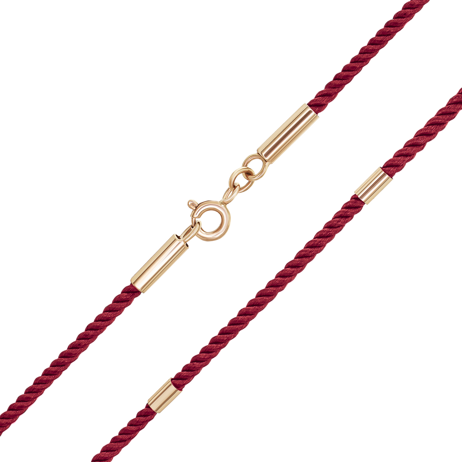 Красный шелковый шнурок с золотыми вставками может стать отличной альтернативой цепочке, на которой носят нательный крестик или другие подвески. Это универсальное украшение, подходящее мужчинам и женщинам, взрослым и детям. Выполнен шнурок из приятного на ощупь материала, а вставки из золота 585 пробы придают его дизайну оригинальность и привлекательность. Красноватый оттенок драгметаллу обеспечивает медь (9,5%), входящая в состав лигатуры сплава. Удобная застежка в виде круглого замка с пружинной защелкой позволяет закрепить шнурок на шее.