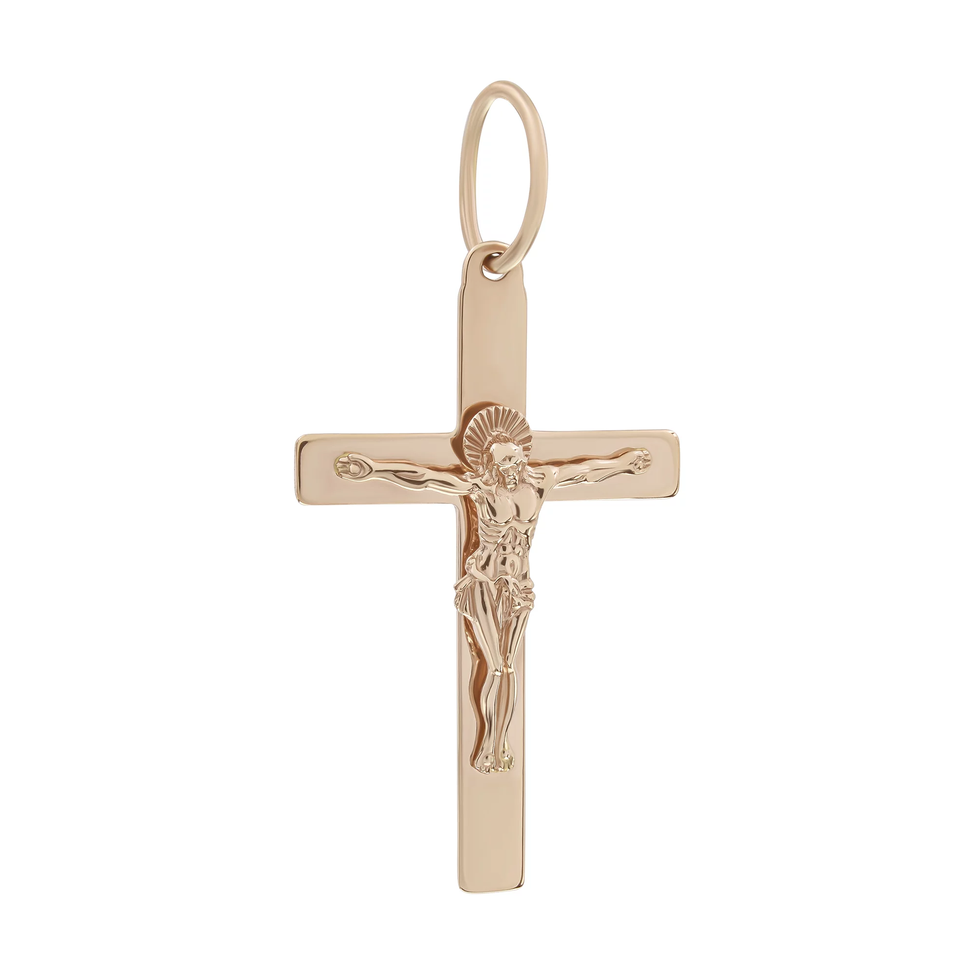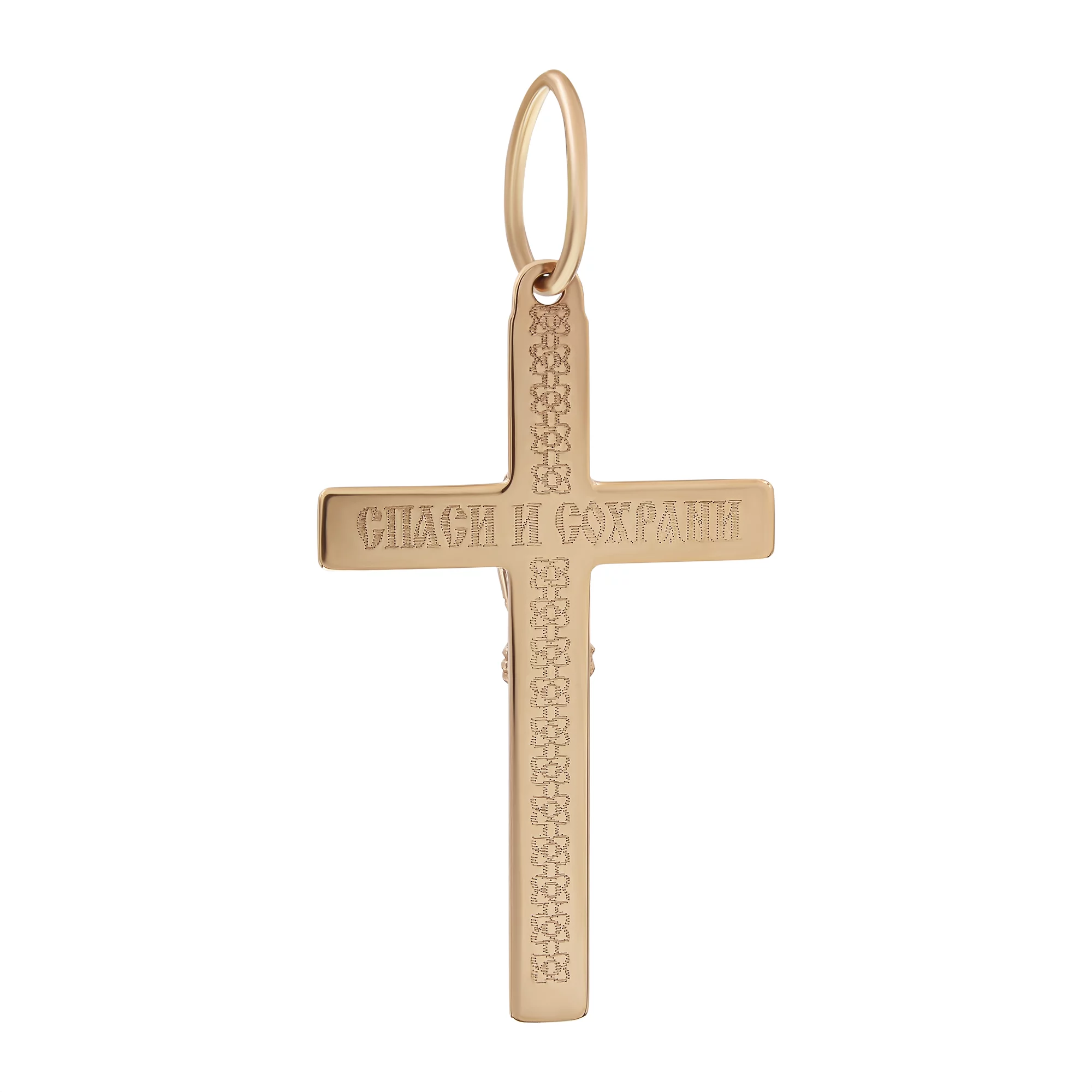 Нательный крестик из красного золота 585 пробы выглядит изысканно и сдержанно. Лаконичный дизайн делает его универсальным, подходящим как для мужчин, так и для женщин, а также детей разного возраста. Четырехконечный православный крест украшен рельефным распятием. Над головой Христа – нимб в виде выгравированных солнечных лучей. Верхняя часть крестика, в месте соединения с подвесным ушком-кольцом – закругленная, что придает ему оригинальность. На обратной стороне изделия выгравированы символические религиозные узоры и надпись – «Спаси и сохрани».