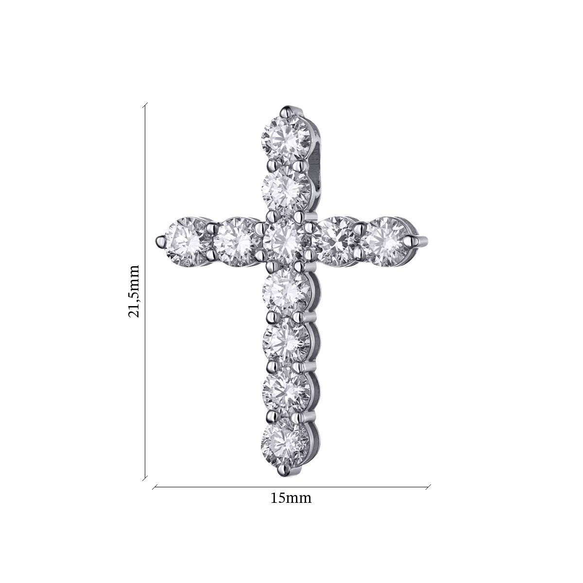 Женский крестик из белого золота с дорожками из бриллиантов. На кристаллах круглой формы высечено множество граней, благодаря чему они ярко переливаются. Камни надежно зафиксированы на поверхности драгоценности крапановым кастом. Основа ювелирного изделия — белое золото 585 пробы. В составе сплава аурум, серебро, платина и другие добавки. Они повышают устойчивость металла к износу. Драгоценность в роскошном стиле подойдет для завершения праздничных и вечерних образов. Ювелирное изделие — хороший вариант презента к юбилею, дню рождения, другому торжеству.