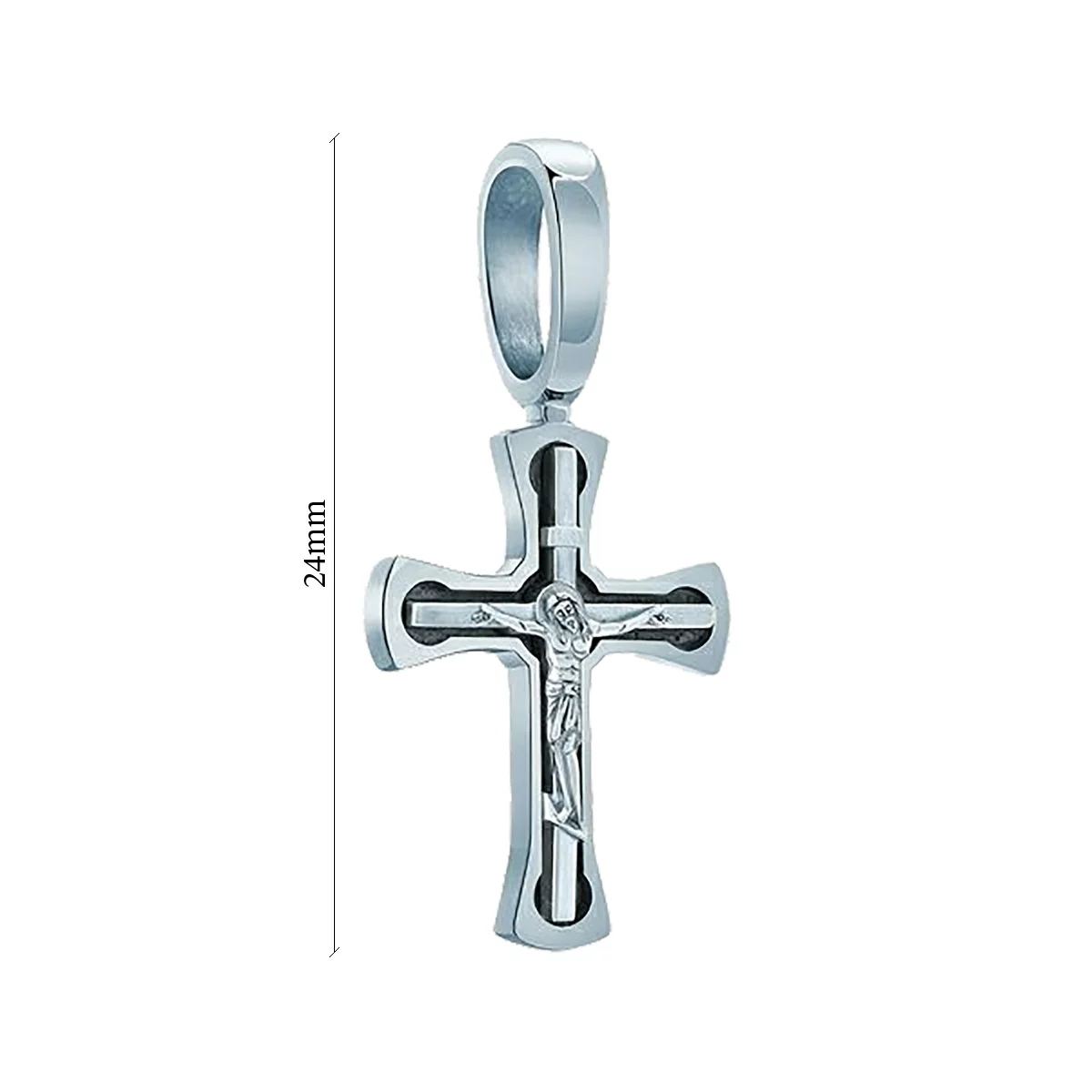 Эта модель крестика – не просто православный атрибут, но и элегантное украшение. Фигурное изделие с оригинальным декором выполнено в стиле унисекс, то есть подойдет и мужчинам, и женщинам. Основной элемент – распятый на кресте Христос – выделяется благодаря рельефному исполнению и контрасту цветов. Черненый фон выгодно подчеркивает детали образа. Окантовка выполнена в белом цвете. У фигуры расширенные концы и большое ушко – декоративное продолжение крестика. Изделие из белого золота выглядит благородно и шикарно. Под крестик можно подобрать цепочку любого витья.