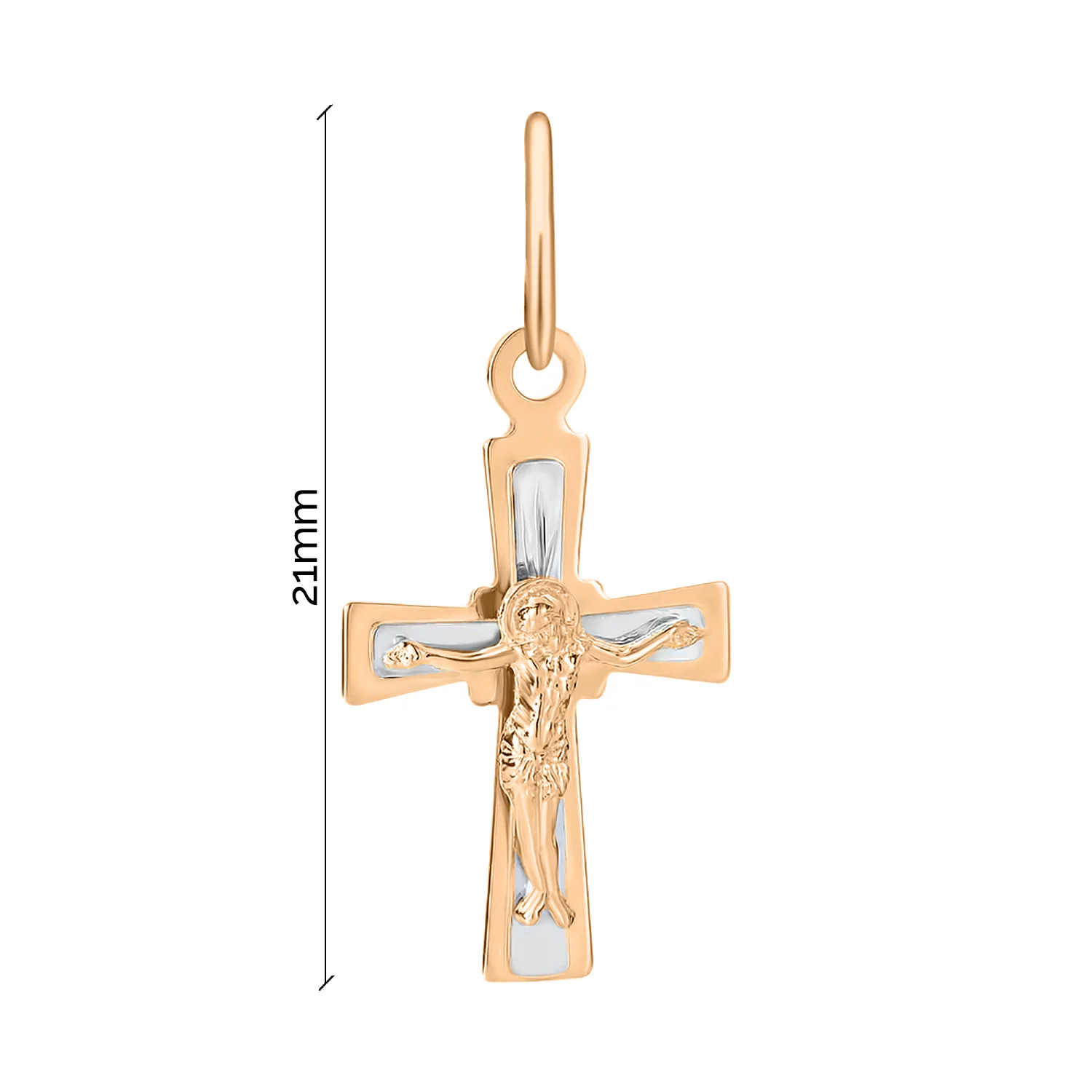 Кулон из комбинированного золота станет памятным подарком на крестины или просто украшением для мужчин и женщин, желающих носить на теле символ их религиозных предпочтений (православия). Изделие выполнено в форме четырехконечного креста с объемной фигурой Иисуса. Для изготовления ювелирного украшения использовали белое и красное золото 585 пробы. Сочетание оттенков придает крестику визуальную глубину и утонченность. Носить изделие принято на цепочке или шнурке. Можно комбинировать с церковными оберегами, такими как ладанки.