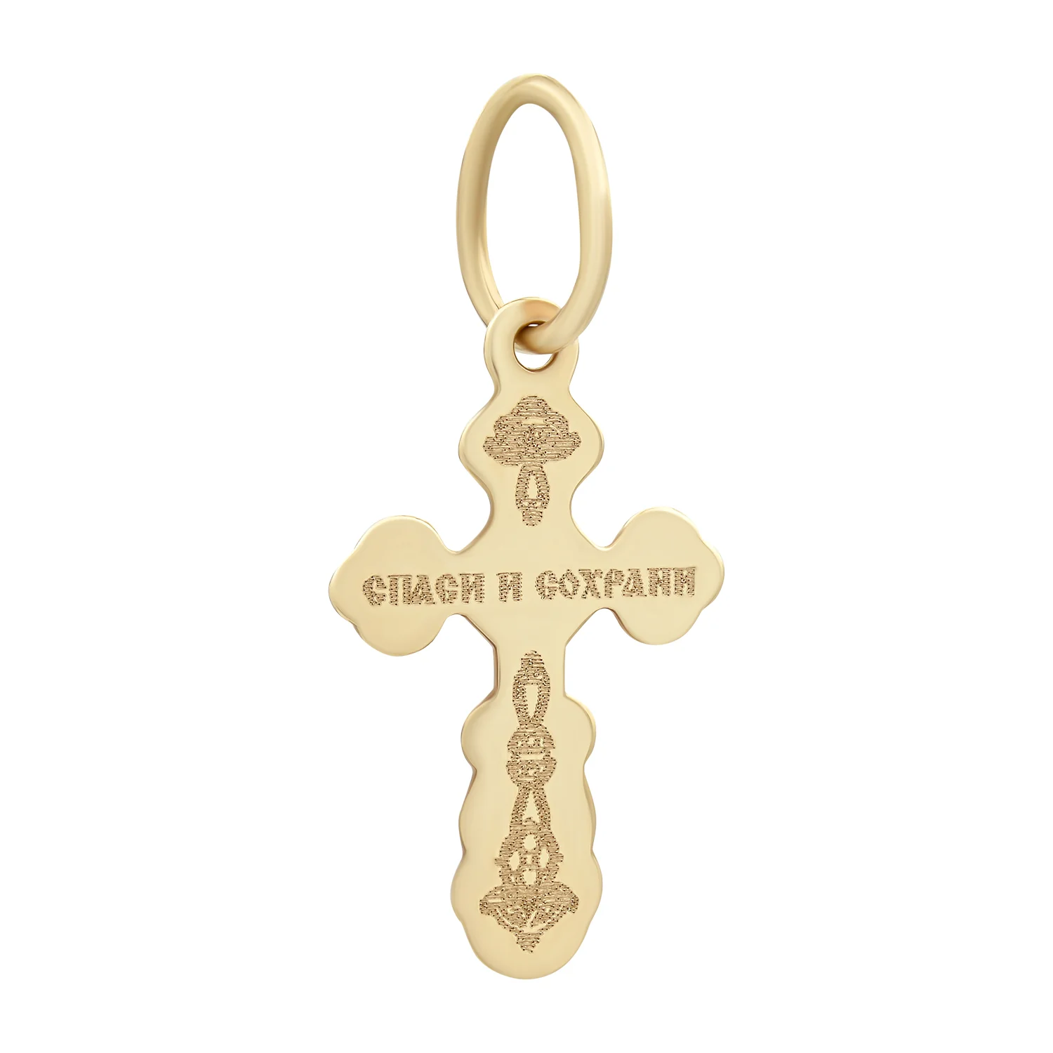 Эта модель нательного крестика – не просто религиозный символ, а настоящее произведение искусства. Изделие оригинальной обтекаемой формы, с красивыми декоративными элементами станет изюминкой образа. Форма креста не привязана к направлению христианства, подойдет мужчинам и женщинам. Украшение изготовлено из комбинированного золота: желтая основа и белое распятие. С обратной стороны есть надпись «Спаси и сохрани». Привлекают внимание гравировка, оригинальные узоры. Носить крестик лучше на тонкой белой или желтой цепочке.