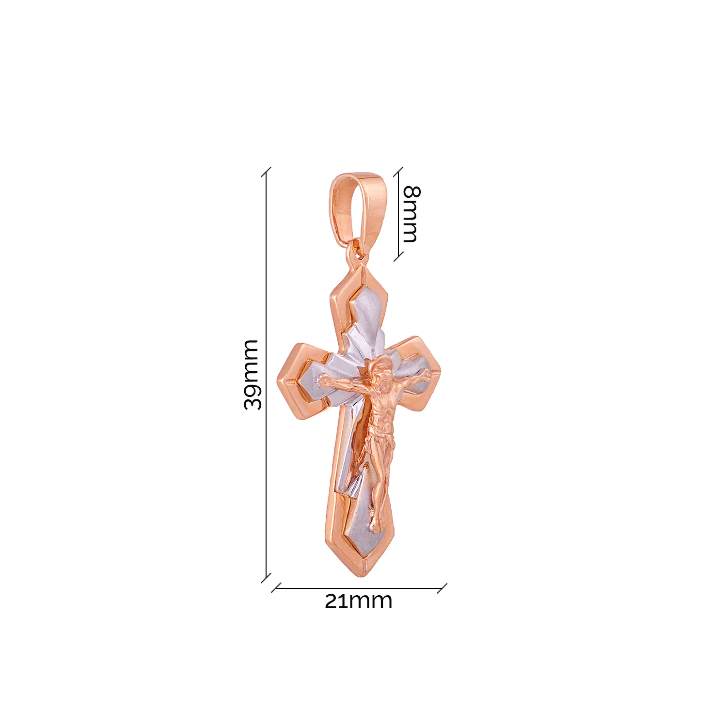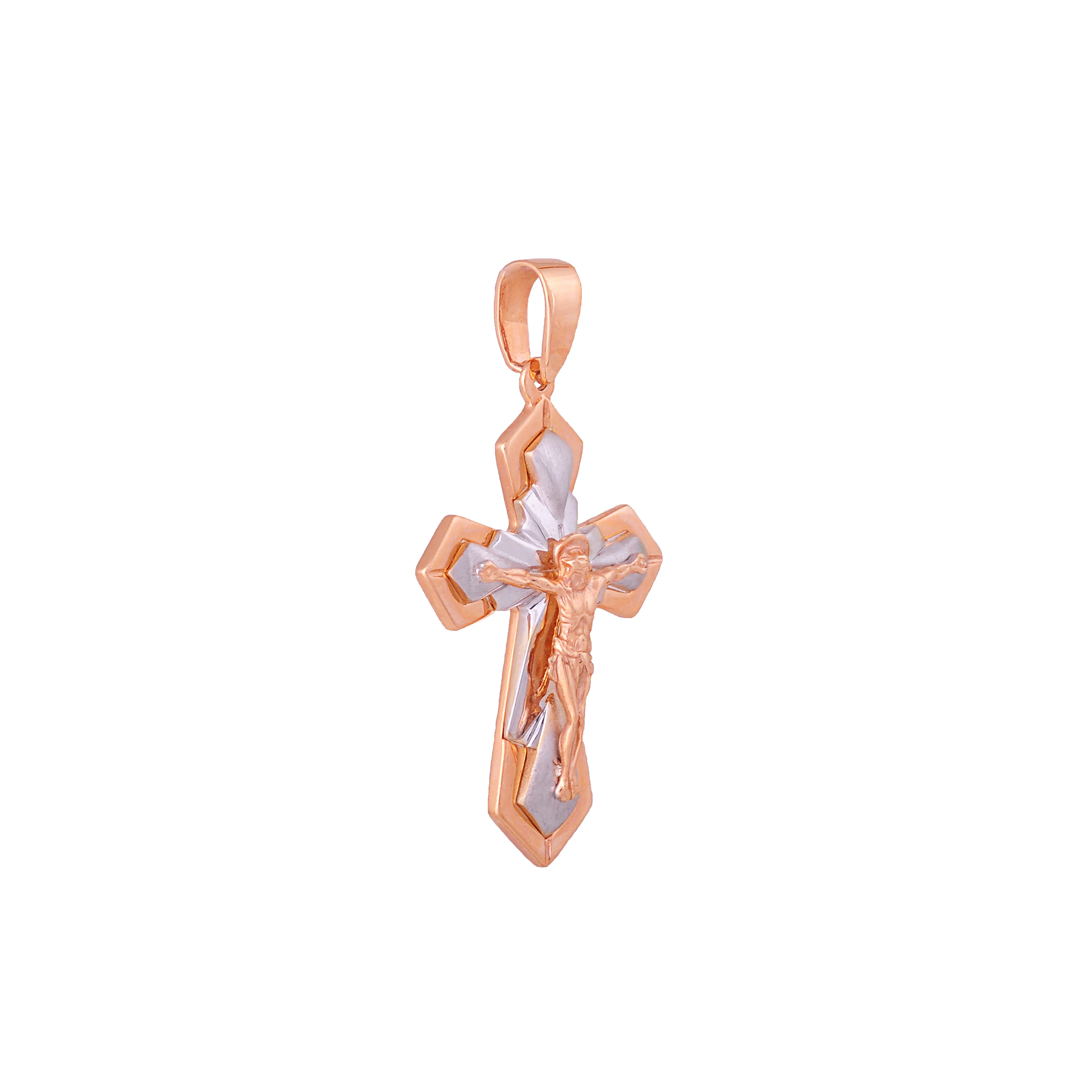 Оригинальная модель с необычной геометрией – крестик из комбинированного золота. Подвес универсальный, он подойдет мужчинам, женщинам и детям. Выпуклость геометрических форм подчеркиваются чередованием золотого и серебристого цветов благородного металла. Поэтому аккуратное ювелирное украшение выглядит объемно и воздушно. Несмотря на это, изделие является прочным и стойким к повреждениям благодаря добавлению в сплав пробы 585 меди. Крестик хорошо сочетается с золотыми цепочками различных плетений: как тонкими, так и массивными.